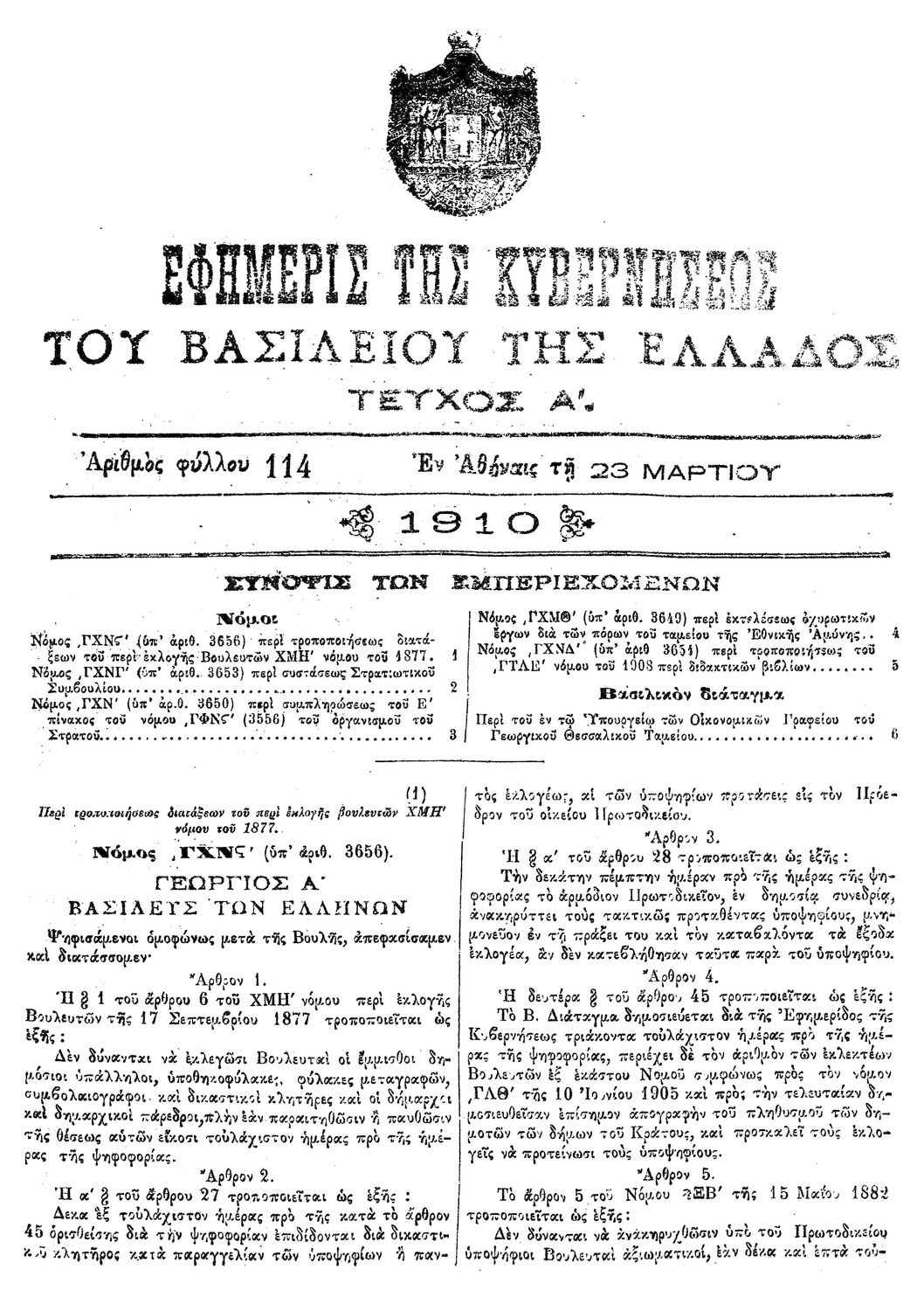 Κωδικός αναγνώρισης: 1910-114A Τίτλος: ΦΕΚ 114/23.03.1910, Τεύχος Α Μέγεθος και υπόστρωμα: Φεκ προγραμμάτων σπουδών, 2 σελίδες. |