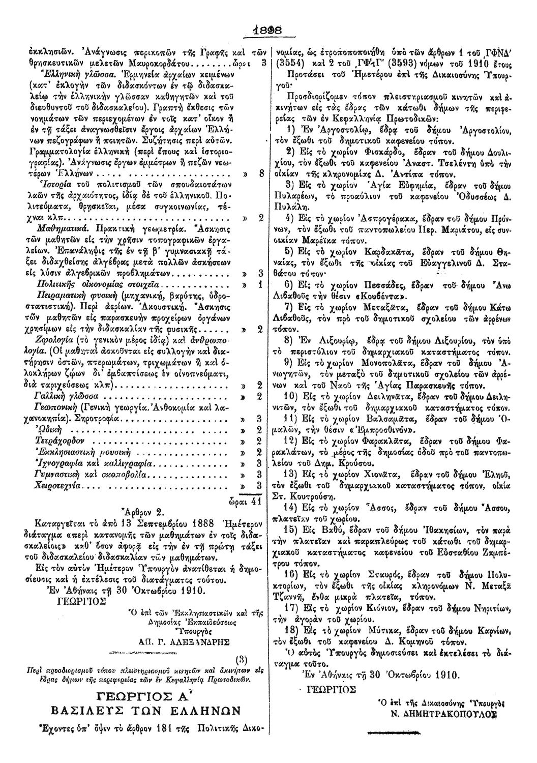 Β.Δ. Περί κατανομής των μαθημάτων και των ωρών της διδασκαλίας εν τη κατωτάτη τάξει του διδασκαλείου της δημοτικής εκπαιδεύσεως