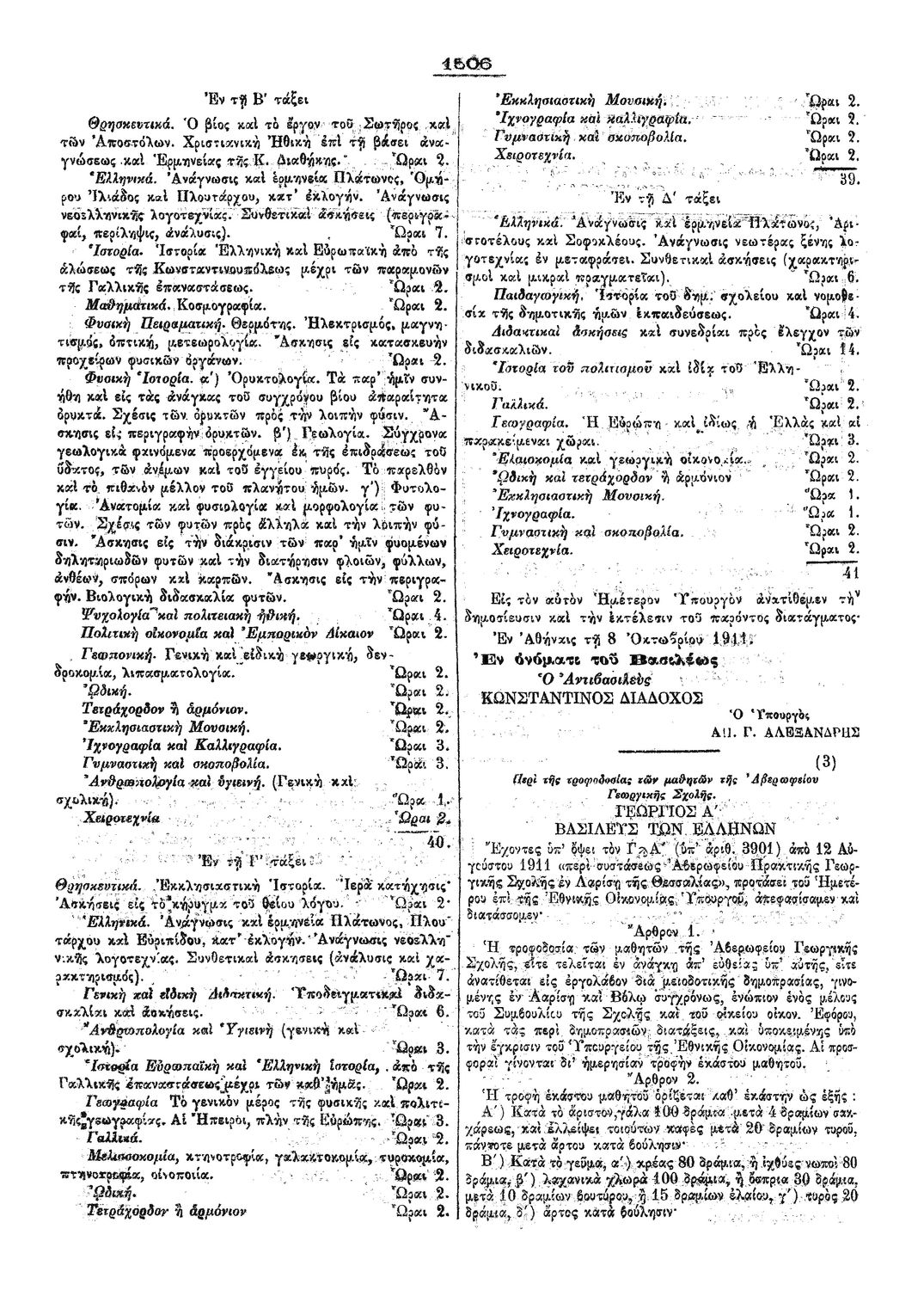 Παρουσίαση περιεχομένου: Β.Δ. Περί κατανομής των μαθημάτων και των ωρών διδασκαλίας εν ταις τάξεσι του Διδασκαλείου της δημοτικής εκπαιδεύσεως Σχετικές σελίδες: 1, 5-6 |