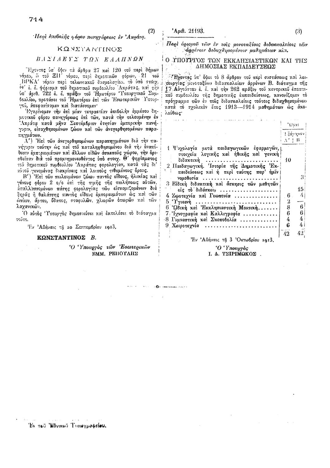 Υ.Α. 21193 Περί ορισμού των εν τοις μονοταξίοις διδασκαλείοις των αρρένων διδαχθησομένων μαθημάτων