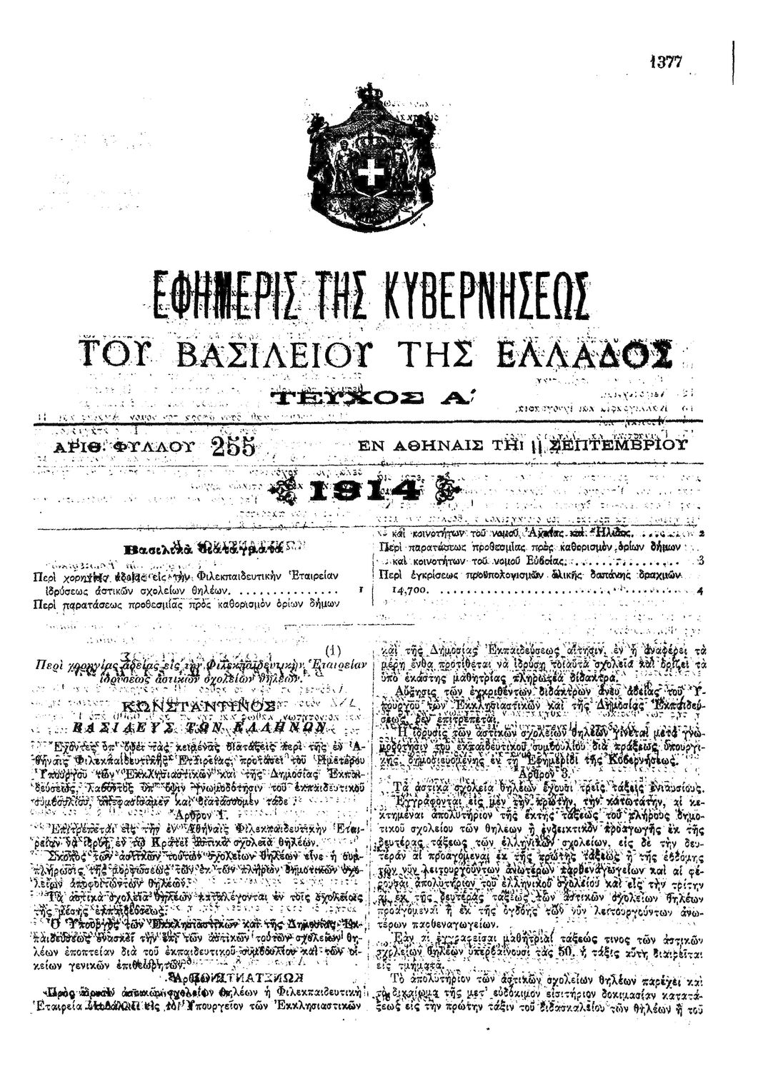 Β.Δ. Περί χορηγίας άδειας εις την Φιλεκπαιδευτικήν Εταιρείαν ιδρύσεως αστικών σχολείων θηλέων