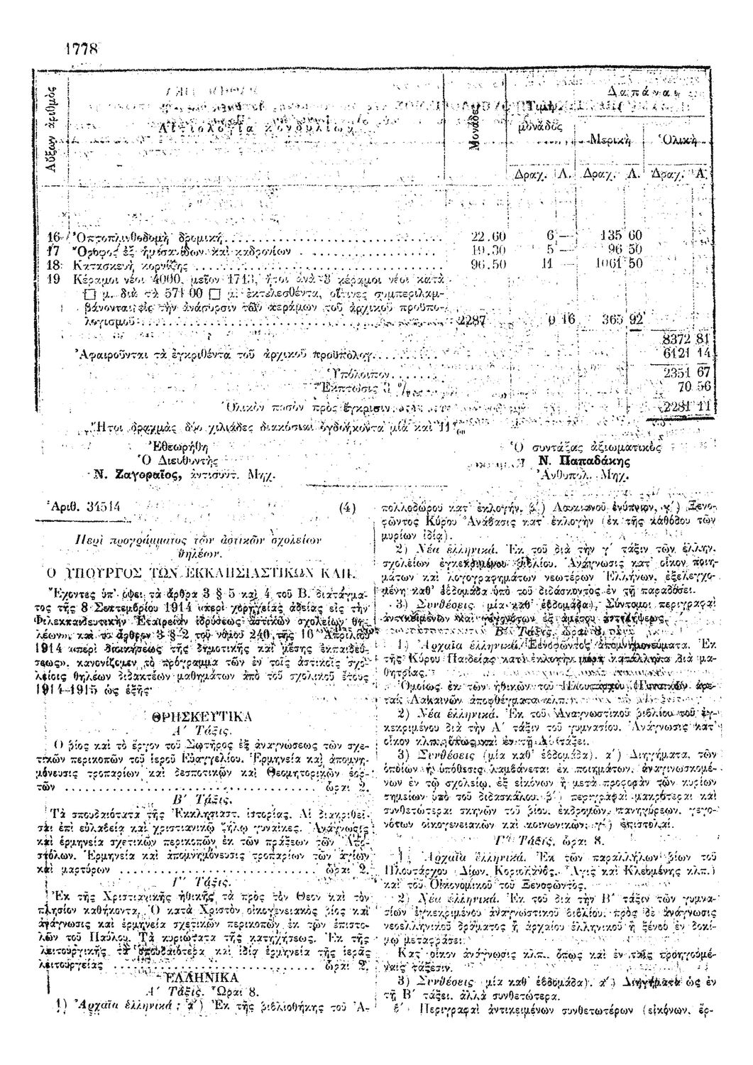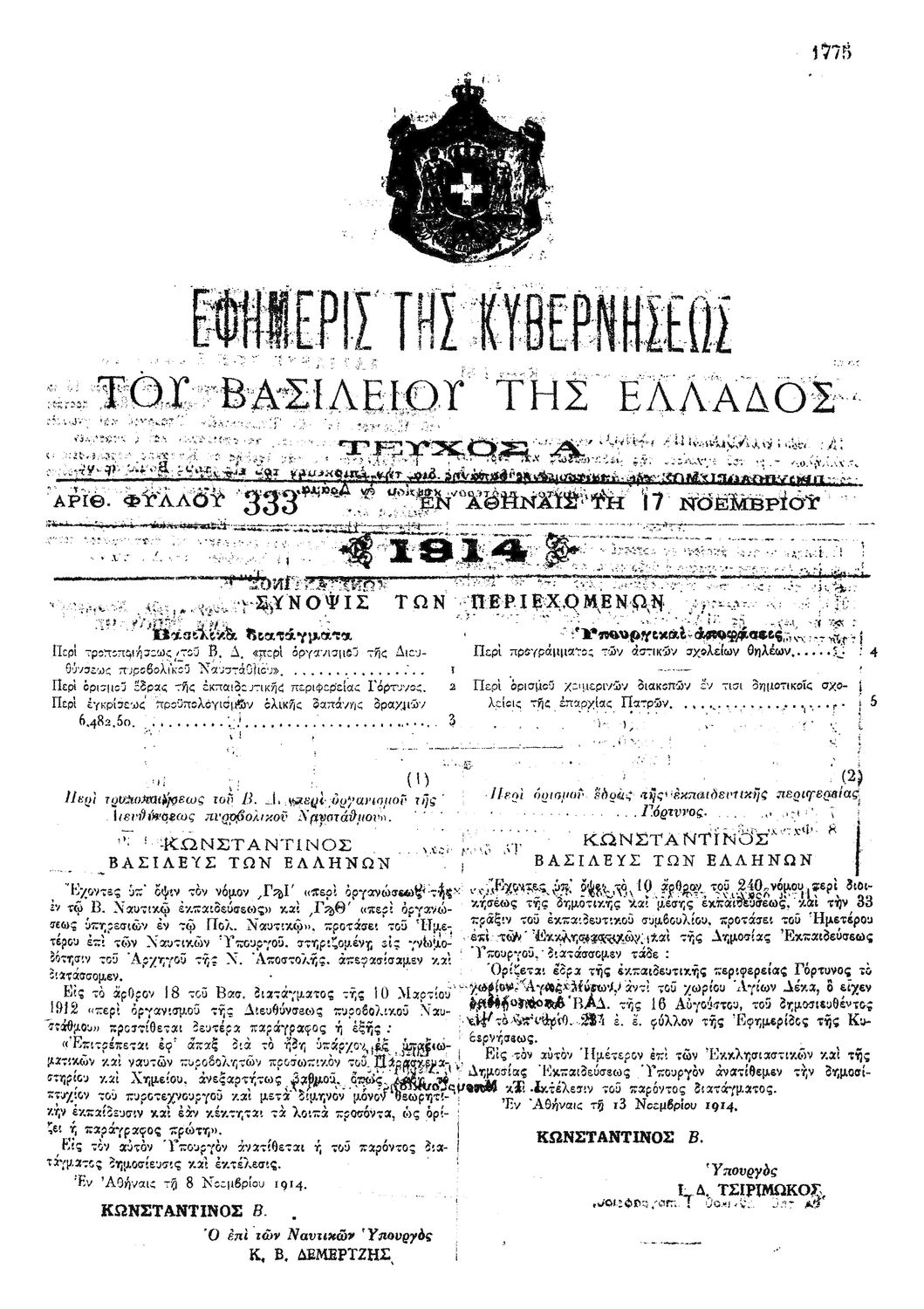 Κωδικός αναγνώρισης: 1914-333A Τίτλος: ΦΕΚ 333/17.11.1914, Τεύχος Α Μέγεθος και υπόστρωμα: Φεκ προγραμμάτων σπουδών, 4 σελίδες. |