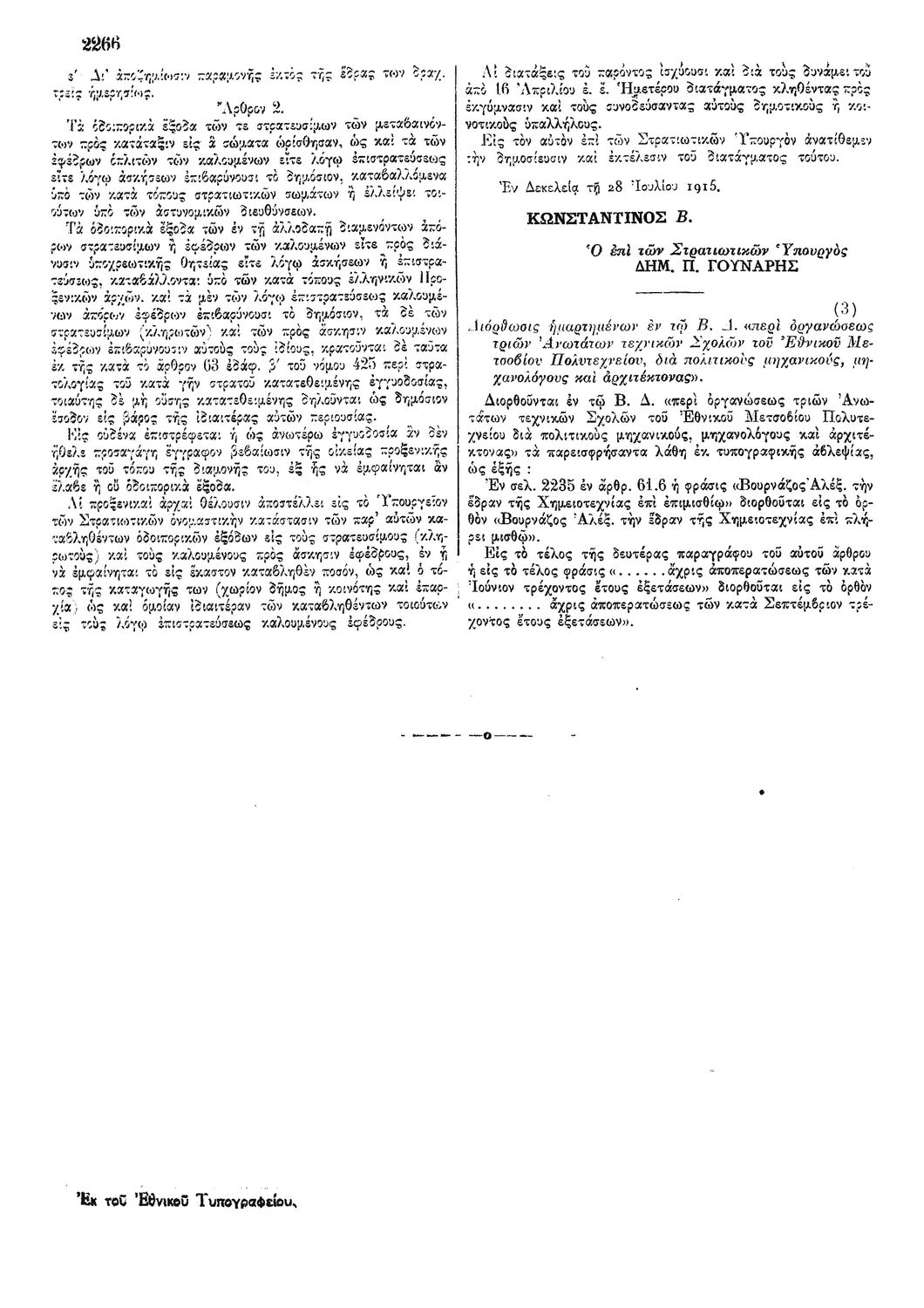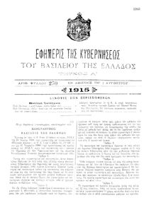 Κωδικός αναγνώρισης: 1915-270A Τίτλος: ΦΕΚ 270/01.08.1915, Τεύχος Α Μέγεθος και υπόστρωμα: Φεκ προγραμμάτων σπουδών, 3 σελίδες. |