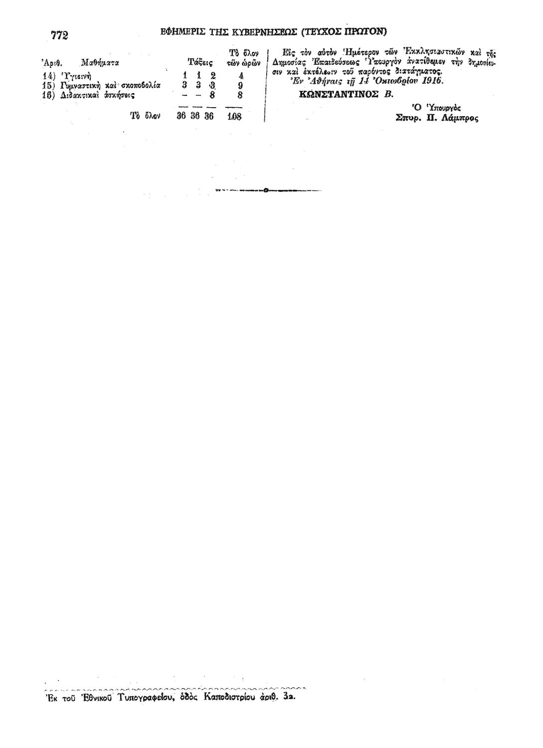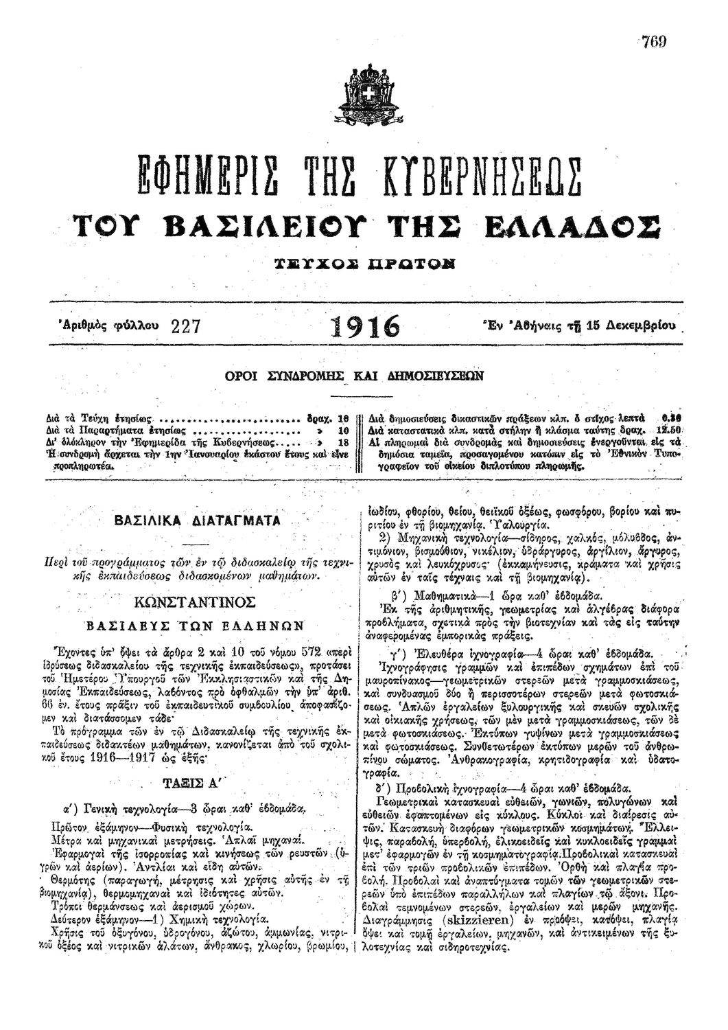 Κωδικός αναγνώρισης: 1916-227A Τίτλος: ΦΕΚ 227/15.12.1916, Τεύχος Α Μέγεθος και υπόστρωμα: Φεκ προγραμμάτων σπουδών, 4 σελίδες. |