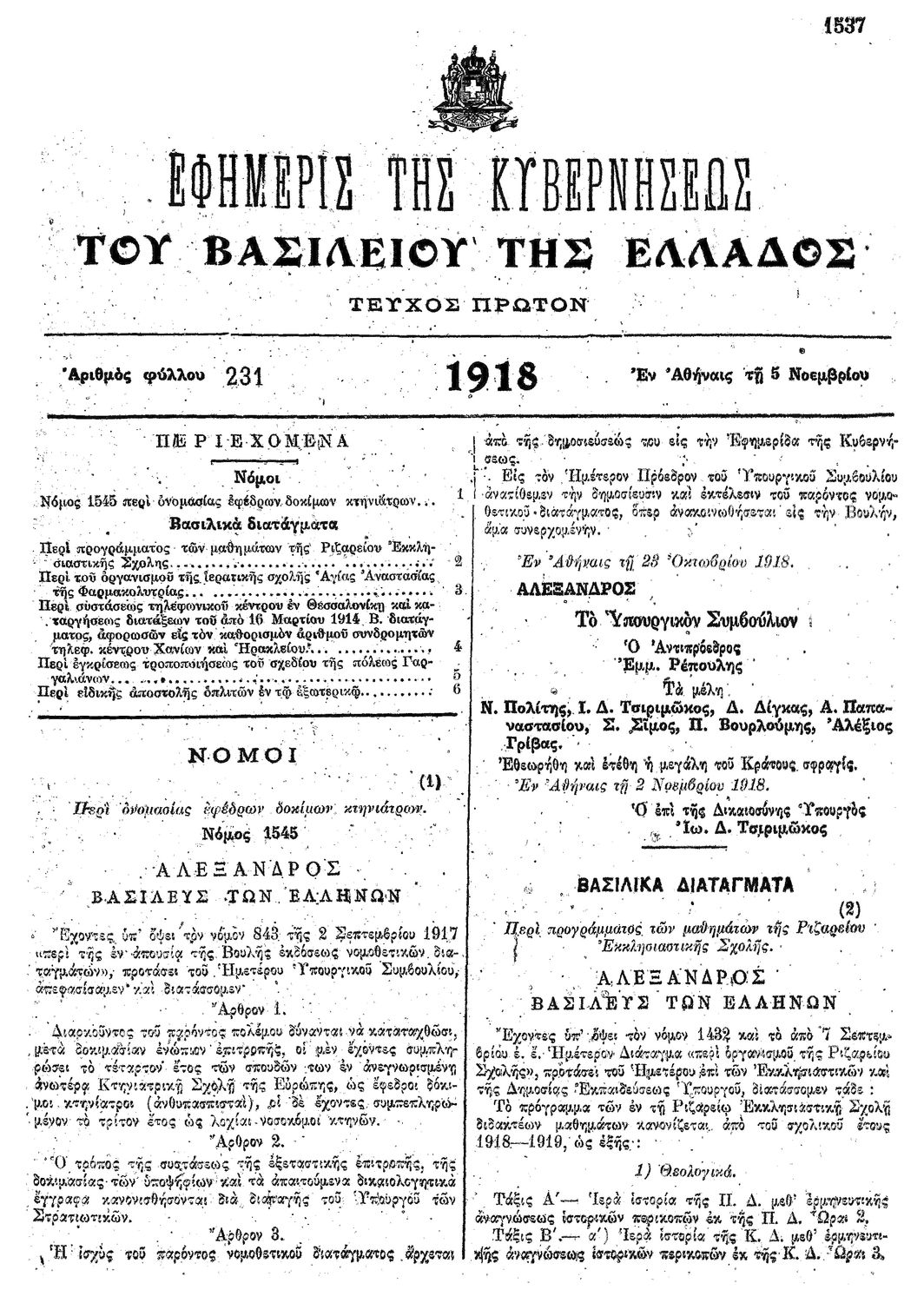 Κωδικός αναγνώρισης: 1918-231A Τίτλος: ΦΕΚ 231/05.11.1918, Τεύχος Α Μέγεθος και υπόστρωμα: Φεκ προγραμμάτων σπουδών, 7 σελίδες. |