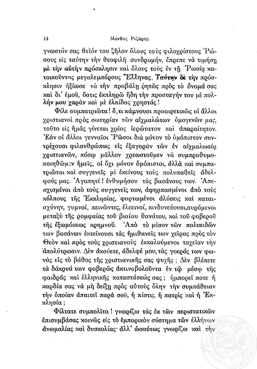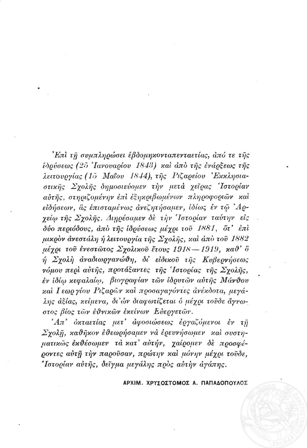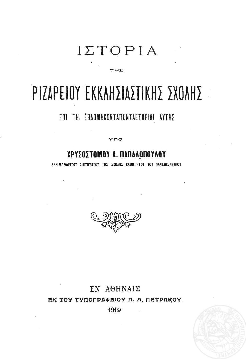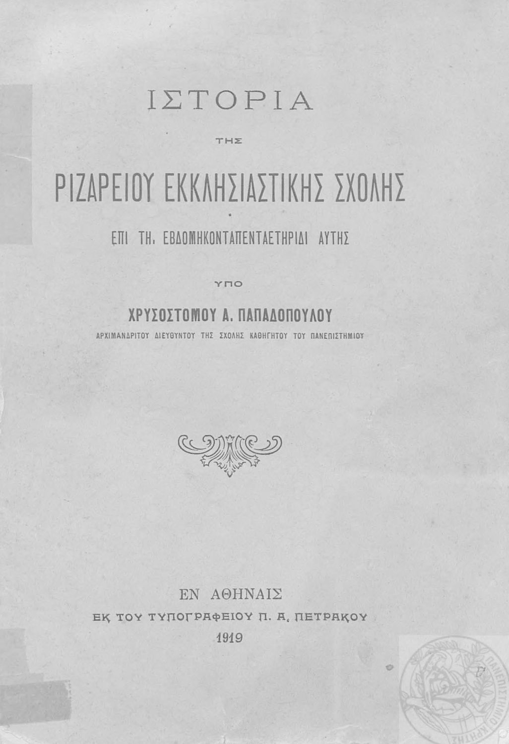 Κωδικός αναγνώρισης: 1919-0032 Τίτλος: Ιστορία της Ριζαρείου Eκκλησιαστικής Σχολής Μέγεθος και υπόστρωμα: Λοιπά προγραμμάτων σπουδών, 251 σελίδες. |