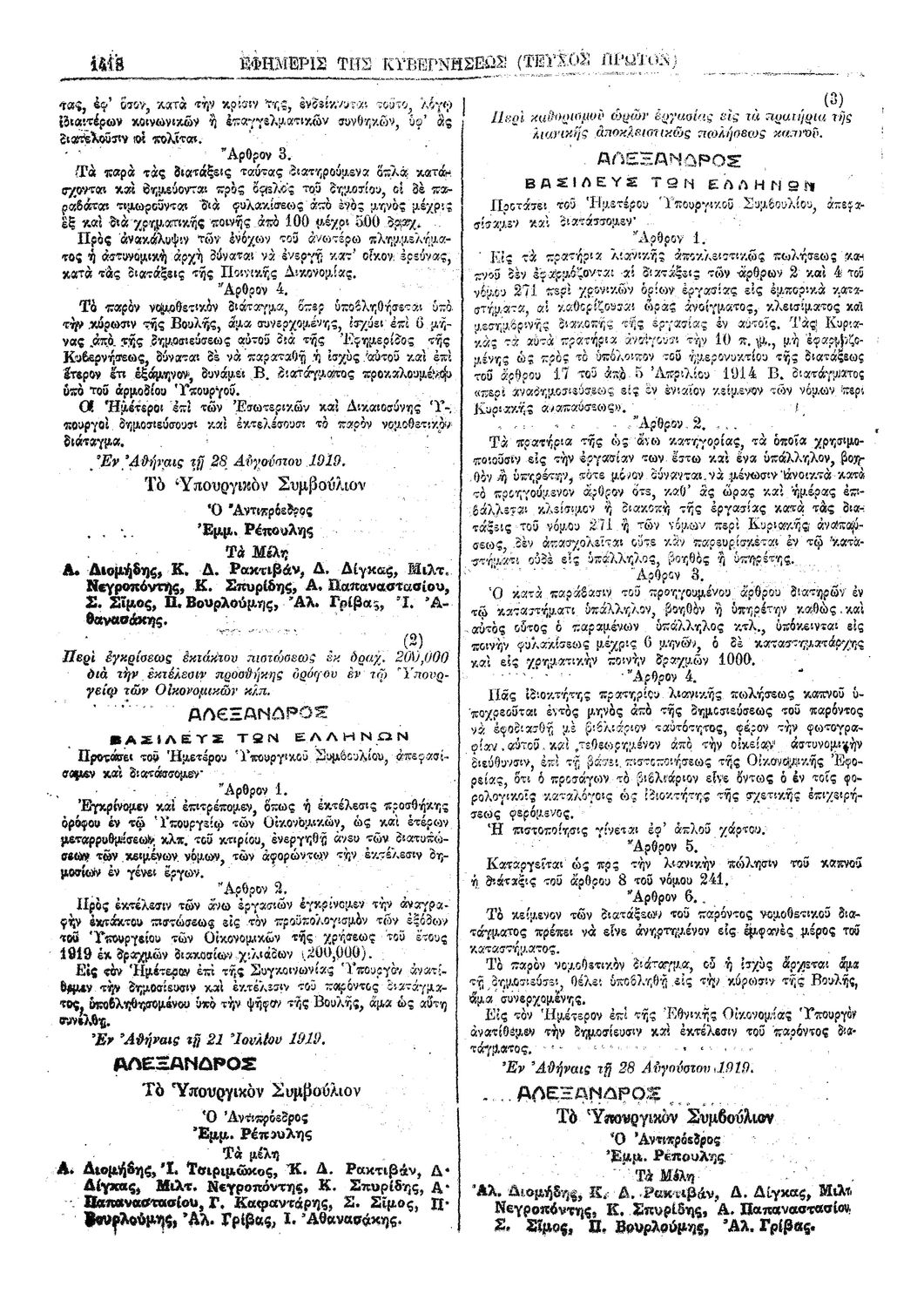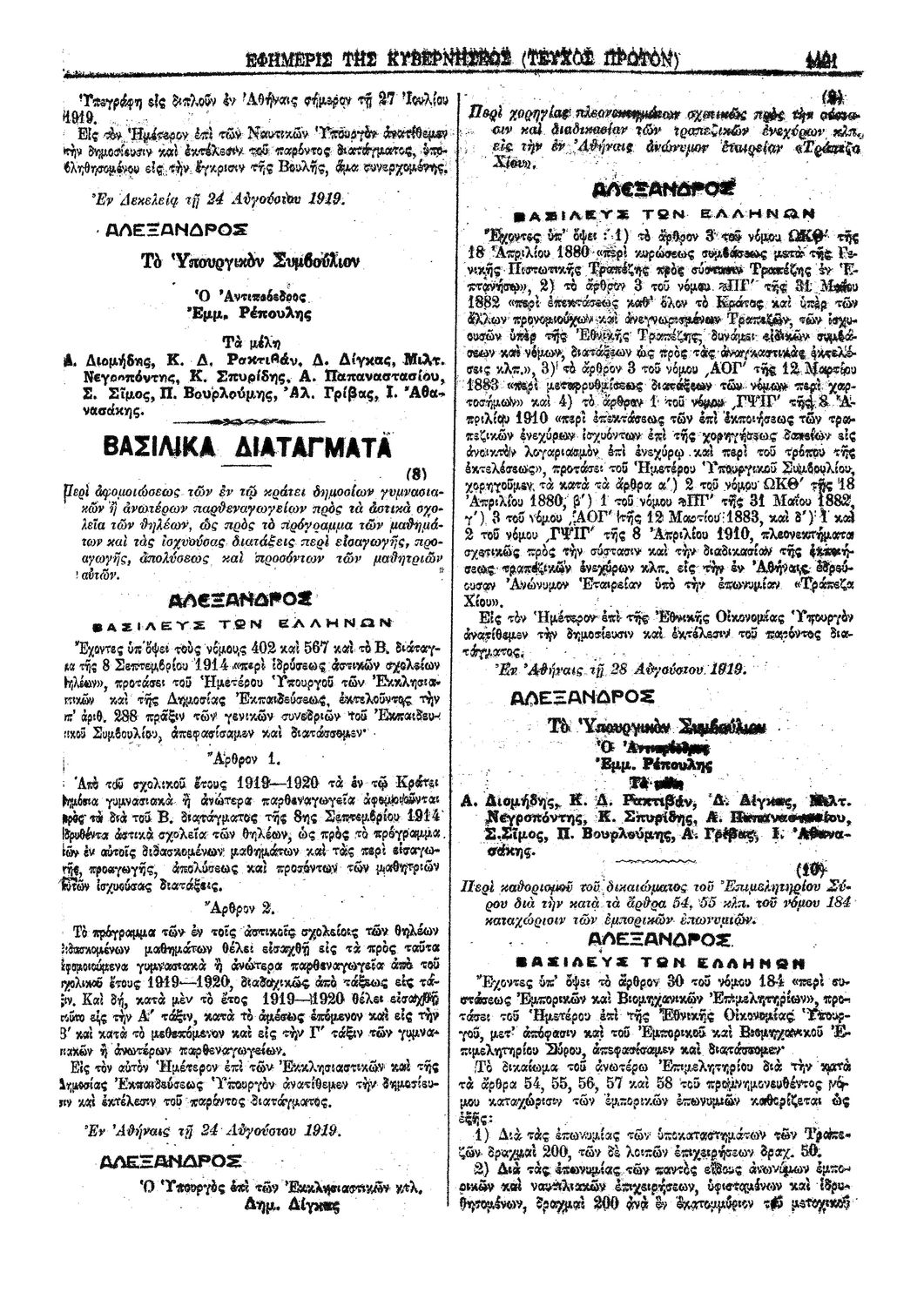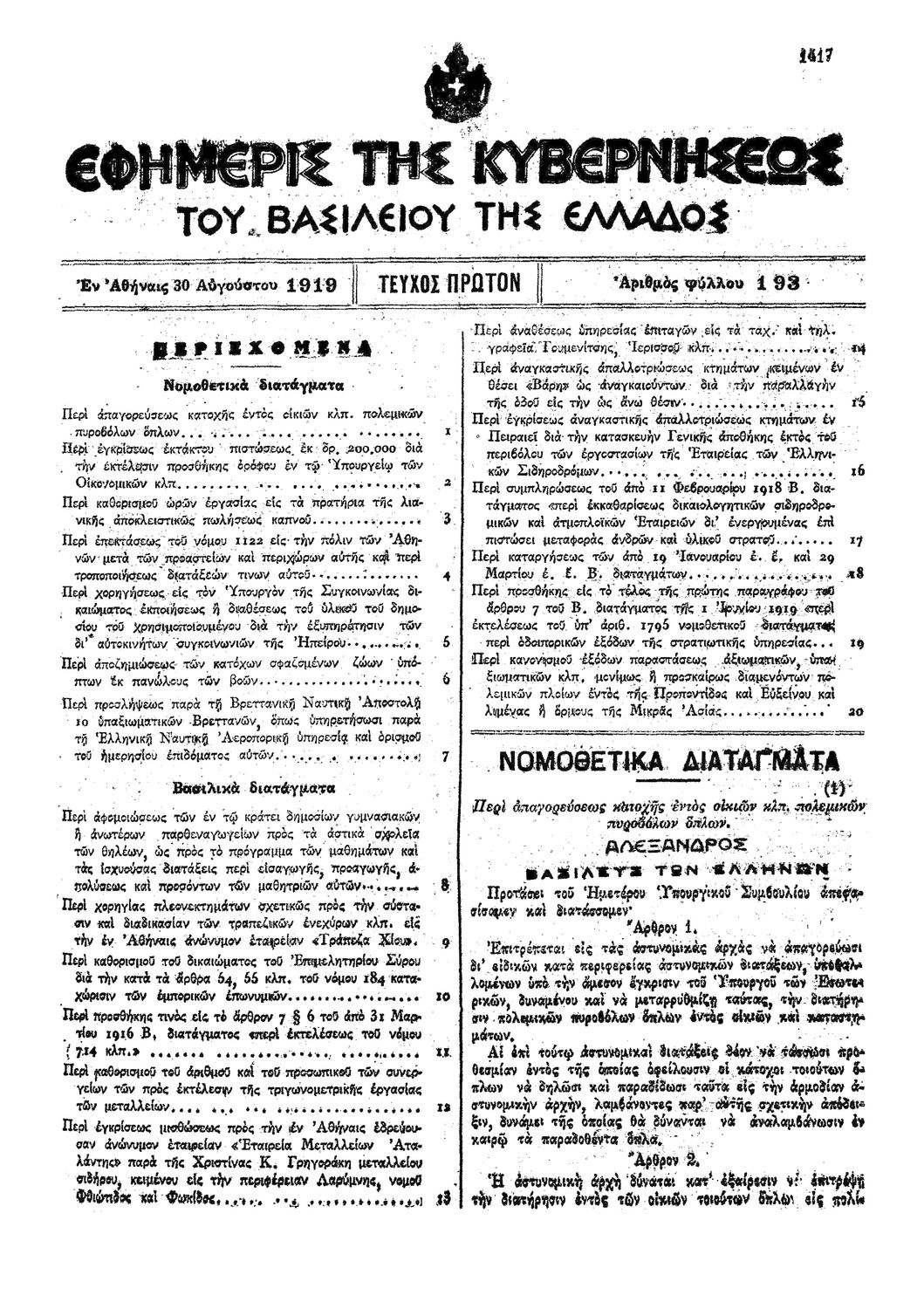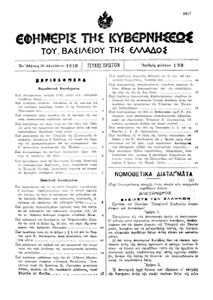 Κωδικός αναγνώρισης: 1919-193A Τίτλος: ΦΕΚ 193/30.08.1919, Τεύχος Α Μέγεθος και υπόστρωμα: Φεκ προγραμμάτων σπουδών, 2 σελίδες. |