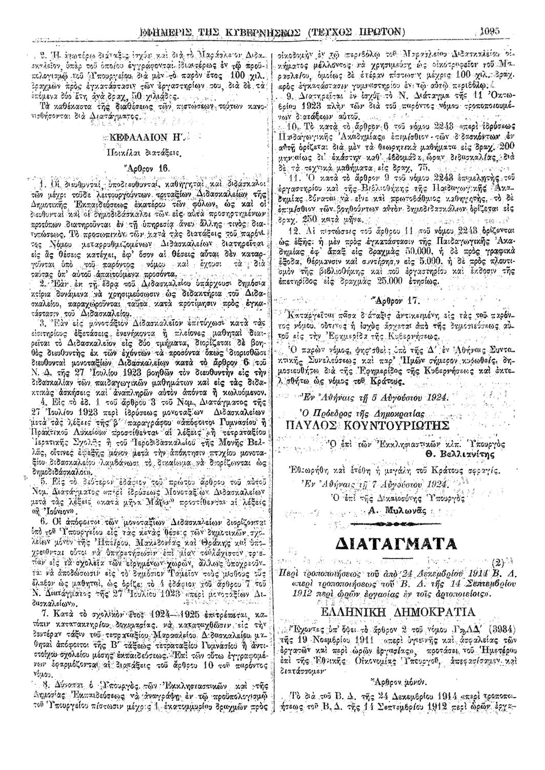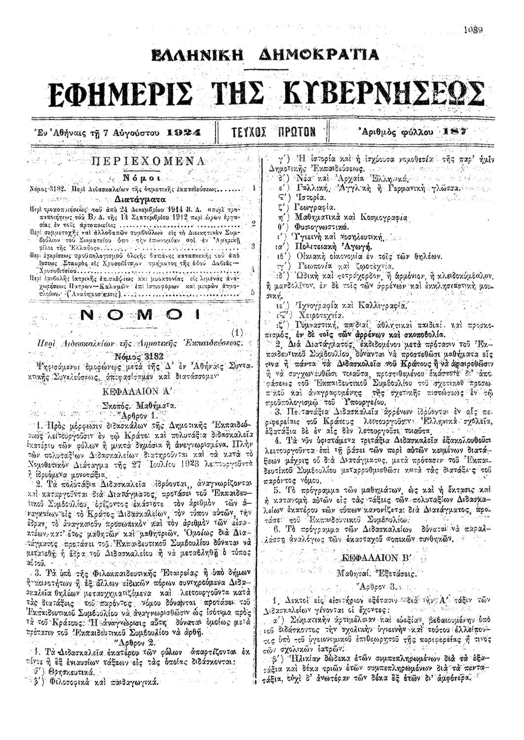 Κωδικός αναγνώρισης: 1924-187A Τίτλος: ΦΕΚ 187/07.08.1924, Τεύχος Α Μέγεθος και υπόστρωμα: Φεκ προγραμμάτων σπουδών, 7 σελίδες. |