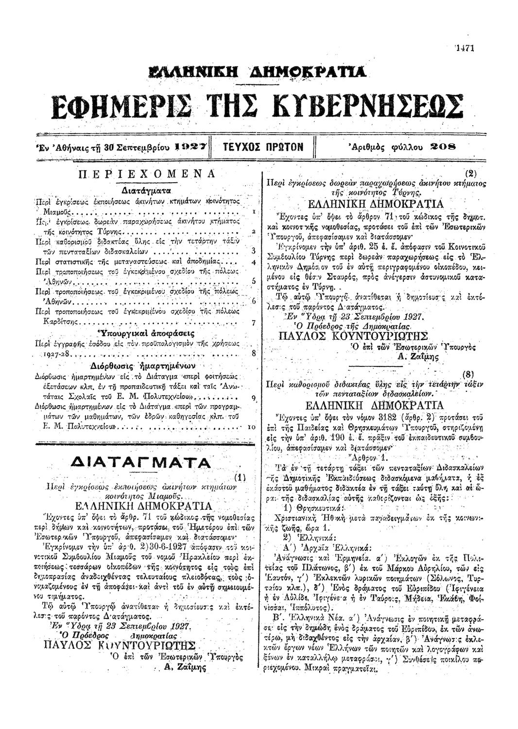 Κωδικός αναγνώρισης: 1927-208A Τίτλος: ΦΕΚ 208/30.09.1927, Τεύχος Α Μέγεθος και υπόστρωμα: Φεκ προγραμμάτων σπουδών, 3 σελίδες. |