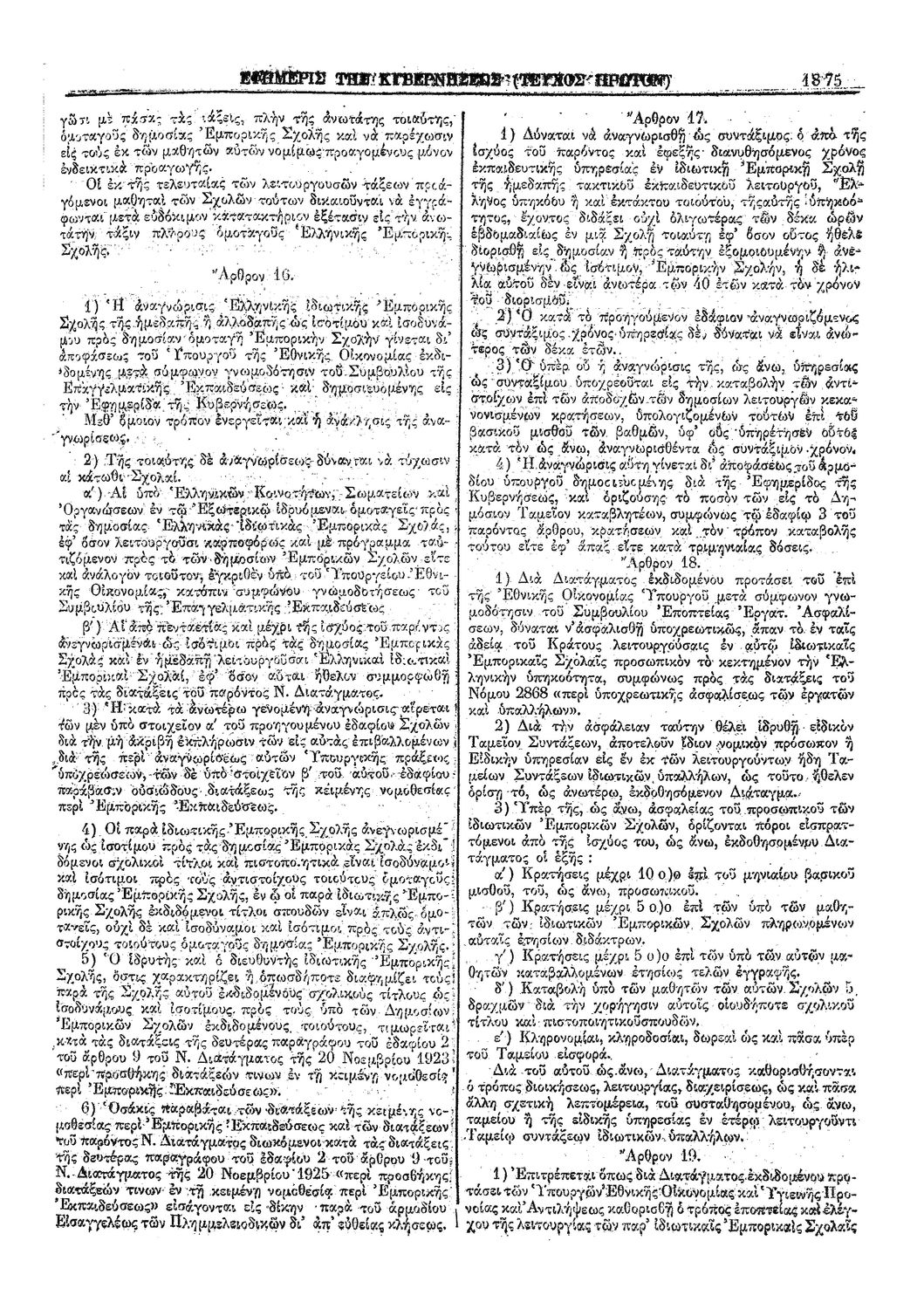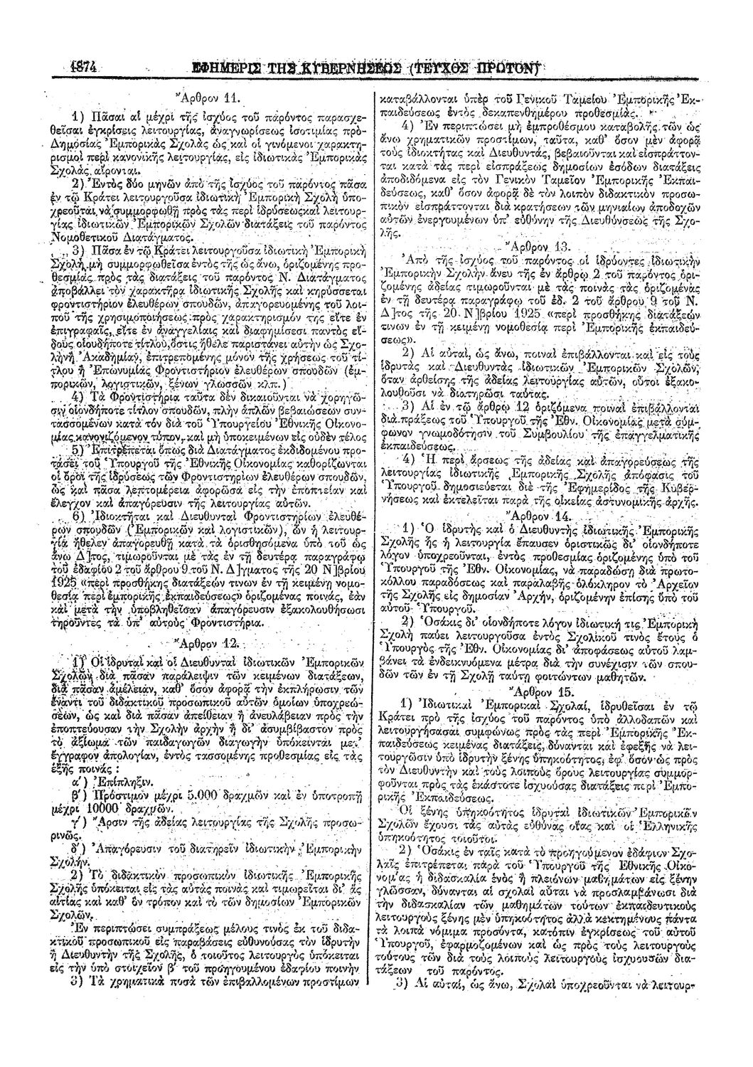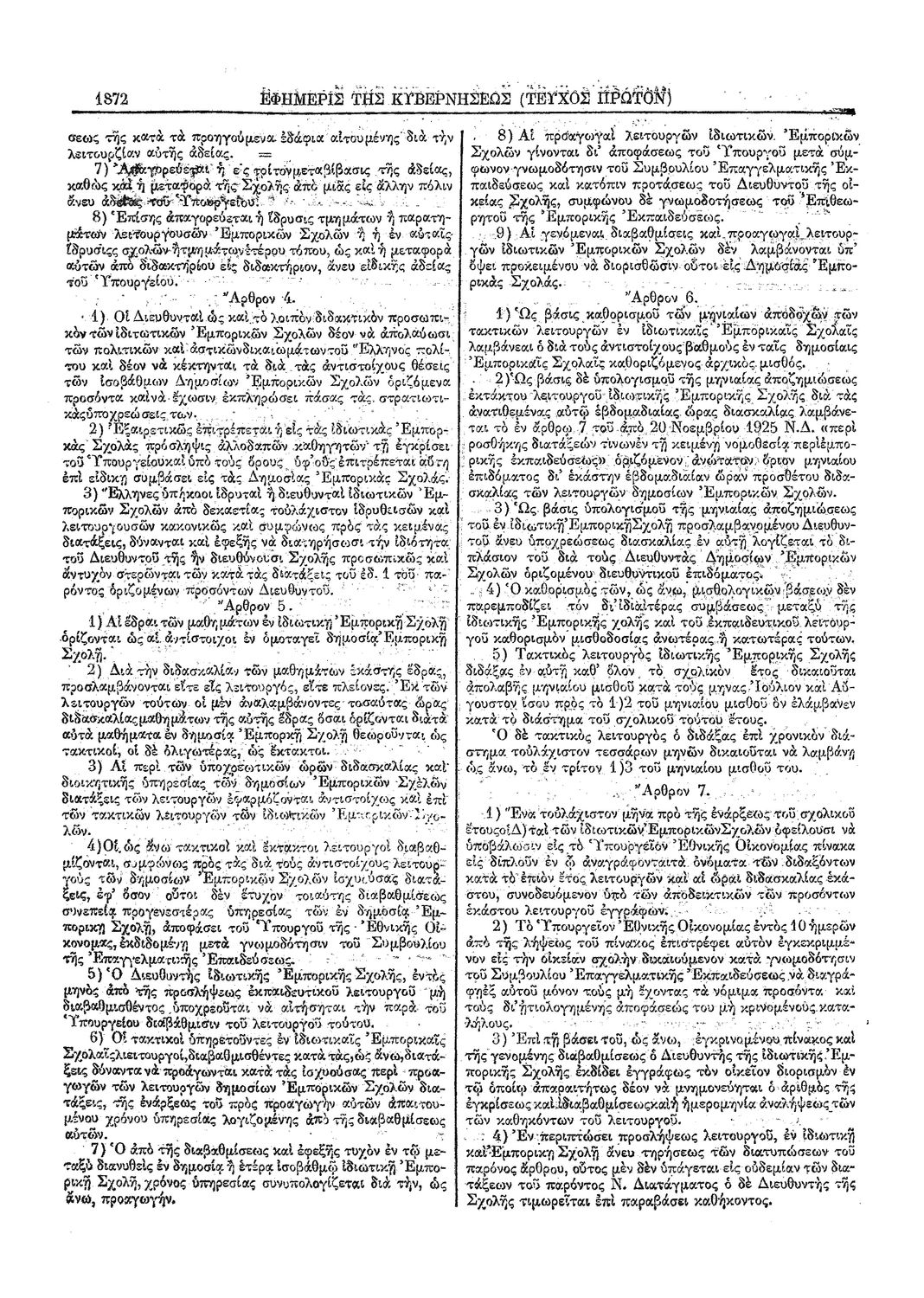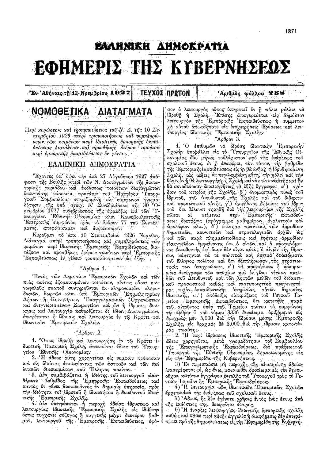 Ν.Δ. Περί κυρώσεως και τροποποιήσεως του Ν.Δ. της 10 Σεπτεμβρίου 1926 "περί τροποποιήσεως και συμπληρώσεως των κειμένων περί ιδιωτικής εμπορικής εκπαιδεύσεως διατάξεων" και προσθήκης ετέρων τοιούτων περί εμπορικής εκπαιδεύσεως εν γένει»
