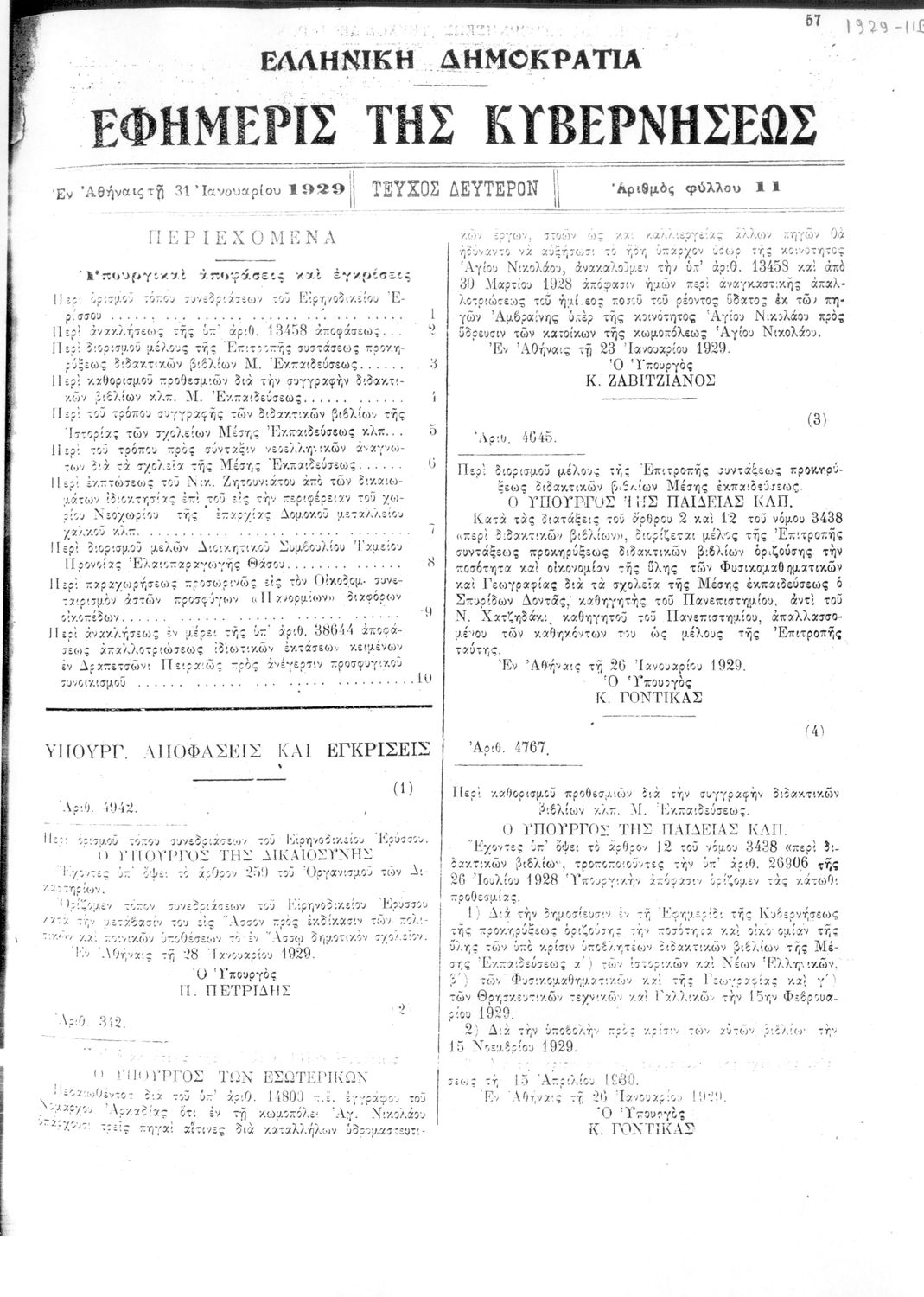 Κωδικός αναγνώρισης: 1929-011B Τίτλος: ΦΕΚ 11/31.01.1929, Τεύχος Β Μέγεθος και υπόστρωμα: Φεκ προγραμμάτων σπουδών, 3 σελίδες. |