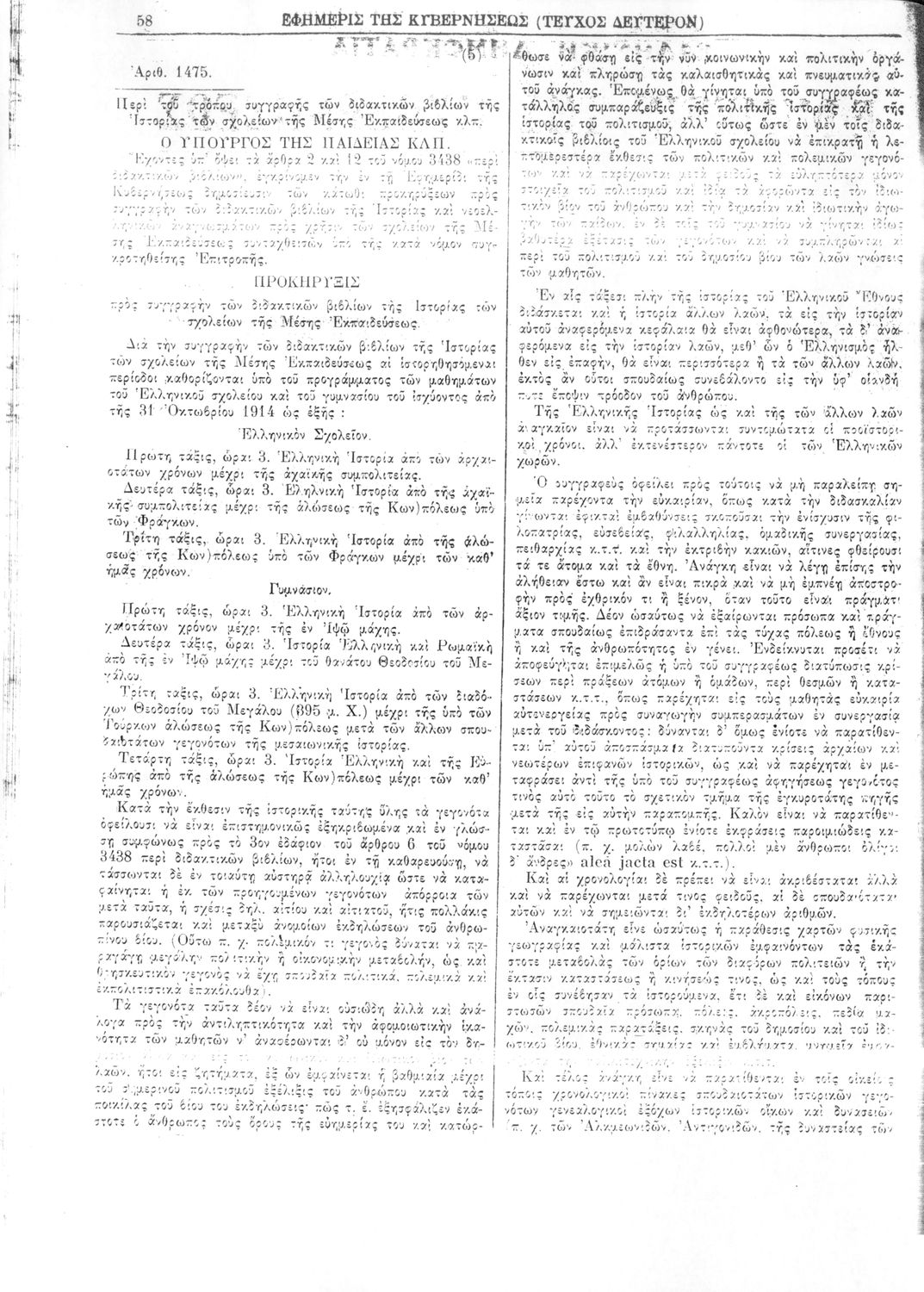 Υ.Α. 1475 Περί του τρόπου συγγραφής των διδακτικών βιβλίων της ιστορίας των σχολείων της Μέσης Εκπαιδεύσεως κλπ