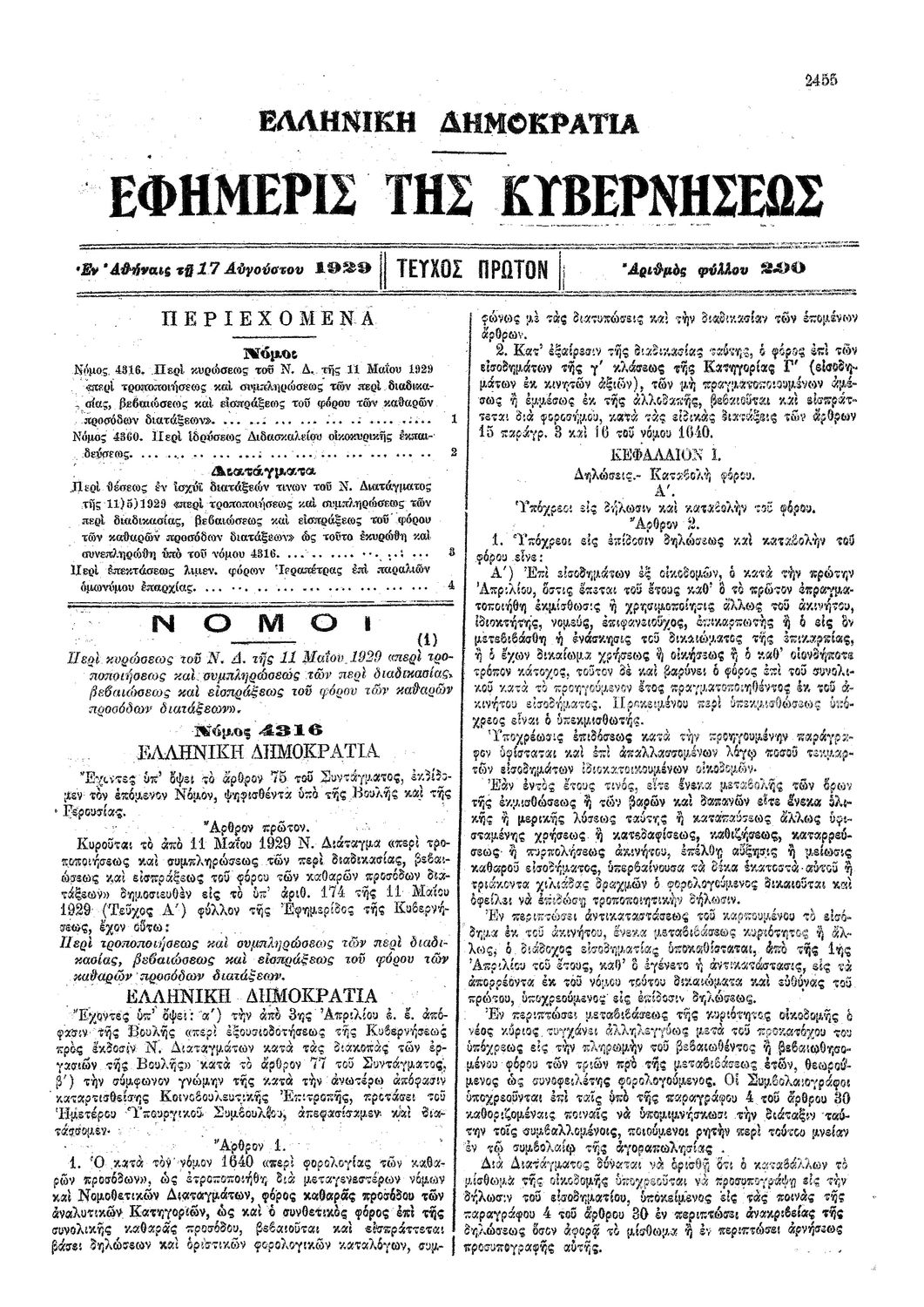Κωδικός αναγνώρισης: 1929-290A Τίτλος: ΦΕΚ 290/17.08.1929, Τεύχος Α Μέγεθος και υπόστρωμα: Φεκ προγραμμάτων σπουδών, 1 σελίδες. |