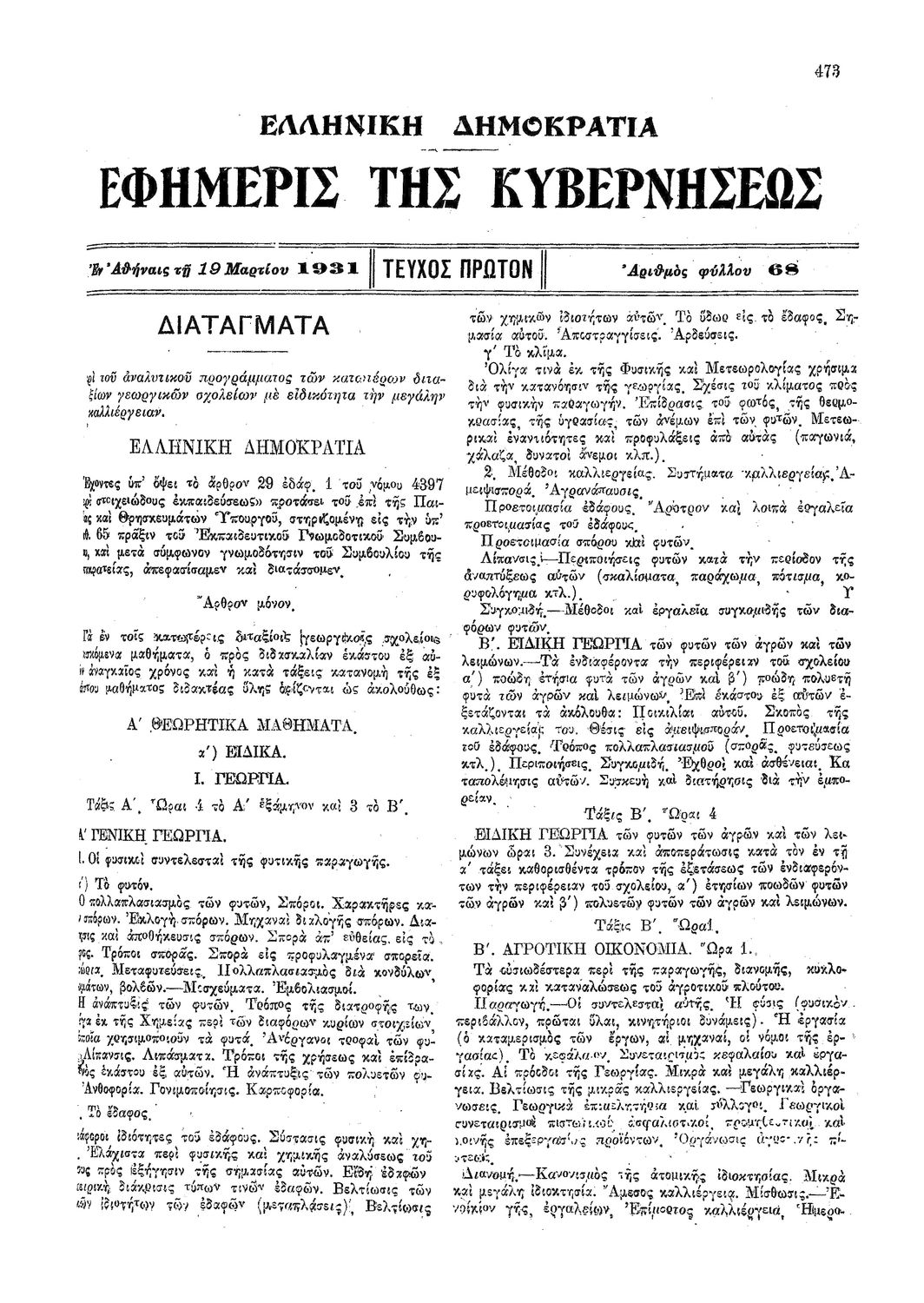 Κωδικός αναγνώρισης: 1931-068A Τίτλος: ΦΕΚ 68/19.03.1931, Τεύχος Α Μέγεθος και υπόστρωμα: Φεκ προγραμμάτων σπουδών, 4 σελίδες. |