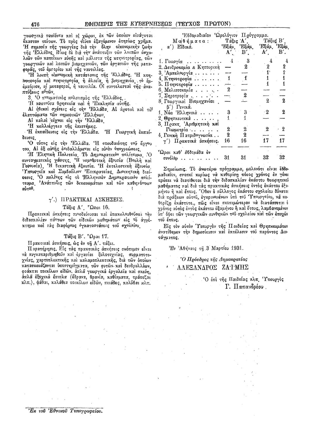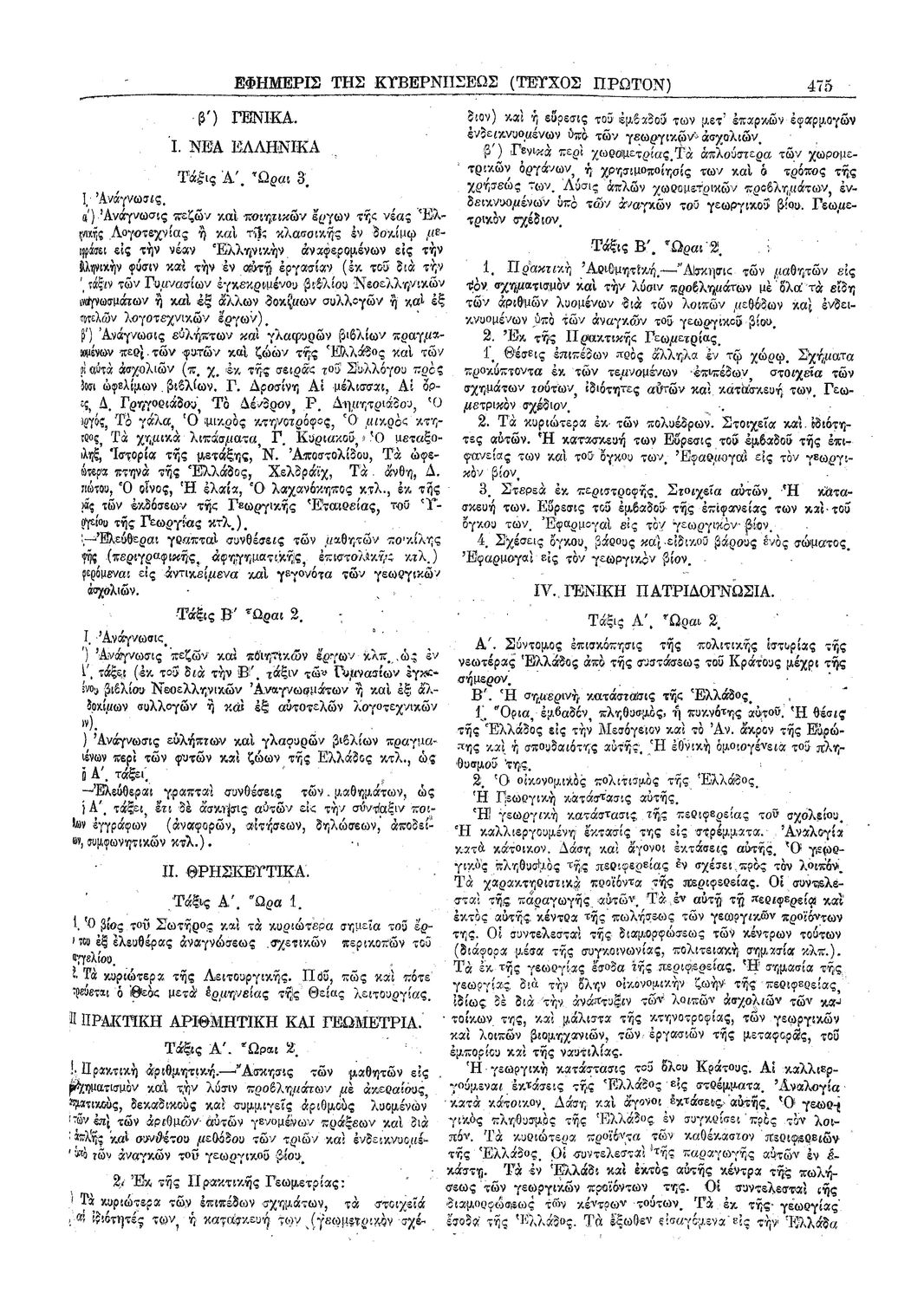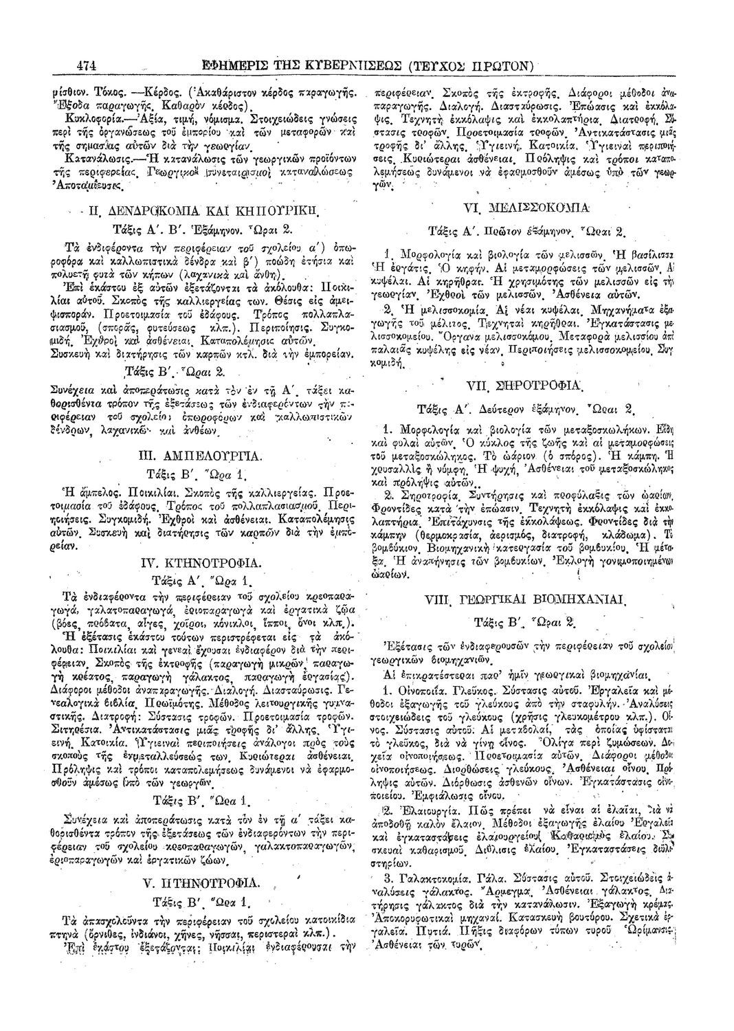 Δ. Περί του αναλυτικού προγράμματος των κατωτέρων διταξίων γεωργικών σχολείων με ειδικότητα την μεγάλην καλλιέργειαν