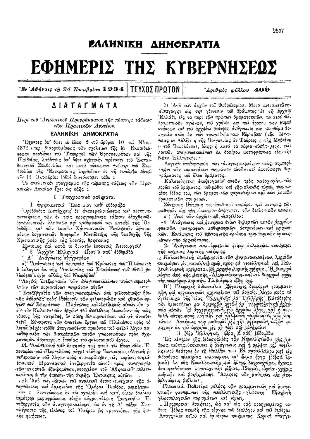 Κωδικός αναγνώρισης: 1934-409A Τίτλος: ΦΕΚ 409/24.11.1934, Τεύχος Α Μέγεθος και υπόστρωμα: Φεκ προγραμμάτων σπουδών, 4 σελίδες. |