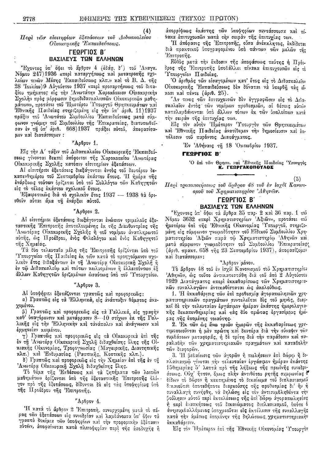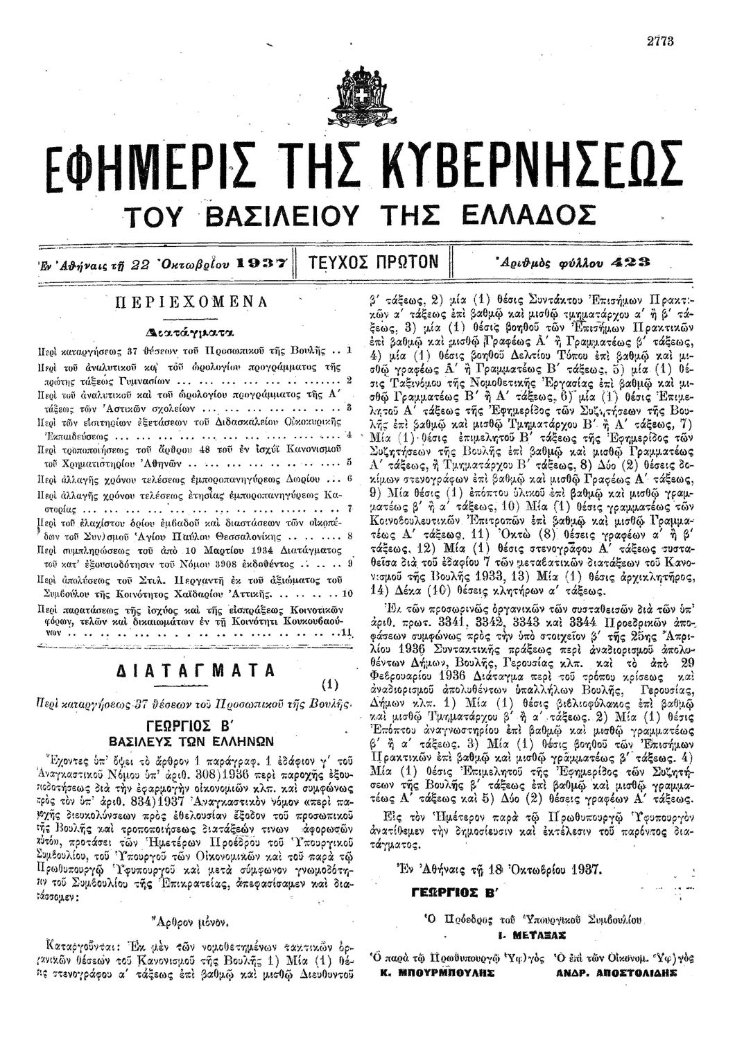 Κωδικός αναγνώρισης: 1937-423A Τίτλος: ΦΕΚ 423/22.10.1937, Τεύχος Α Μέγεθος και υπόστρωμα: Φεκ προγραμμάτων σπουδών, 4 σελίδες. |