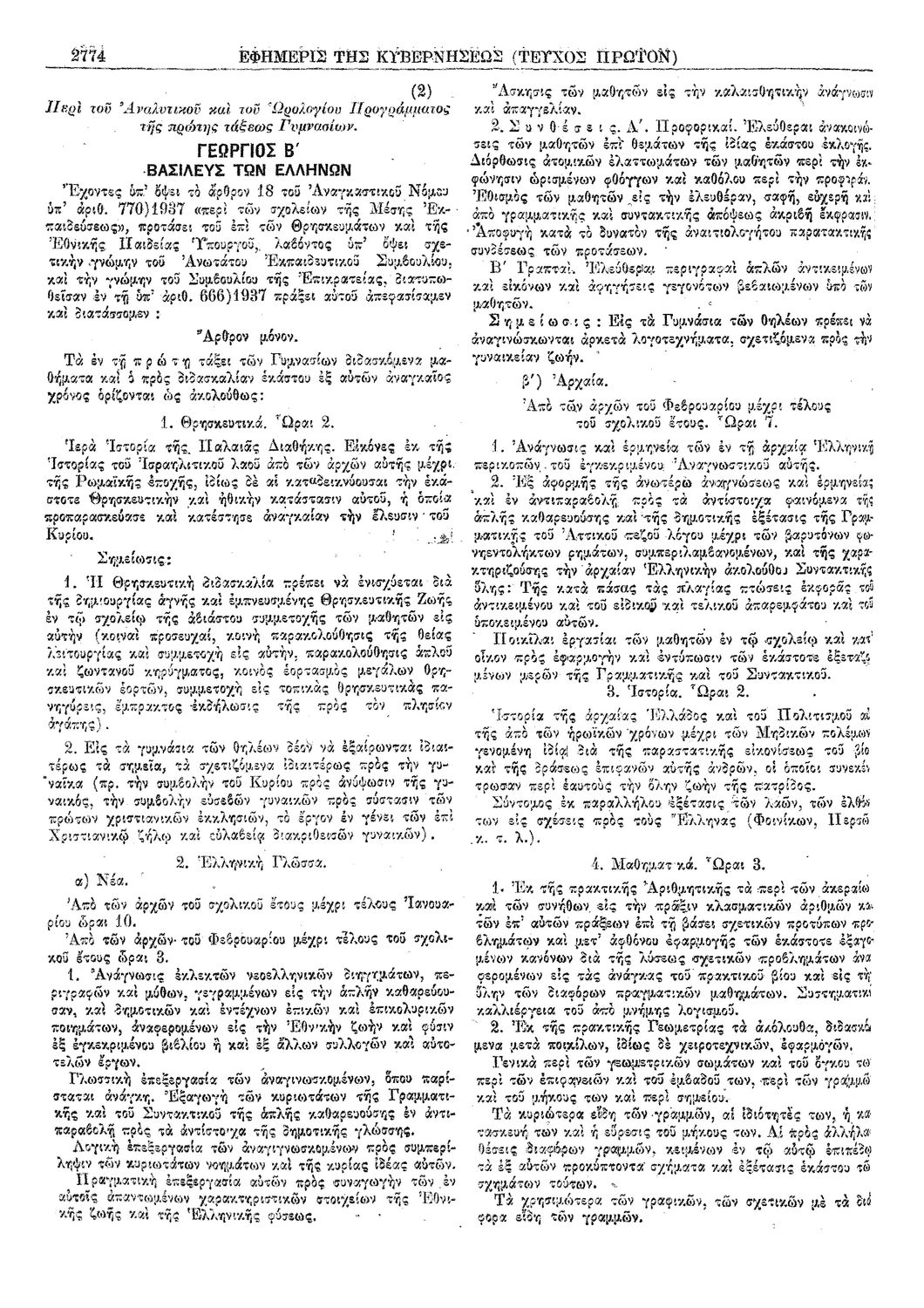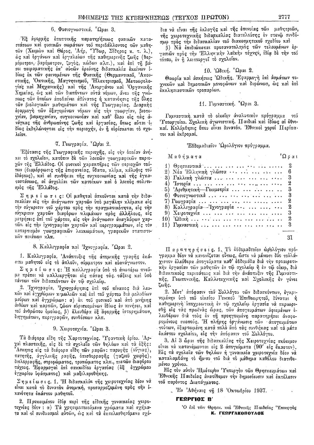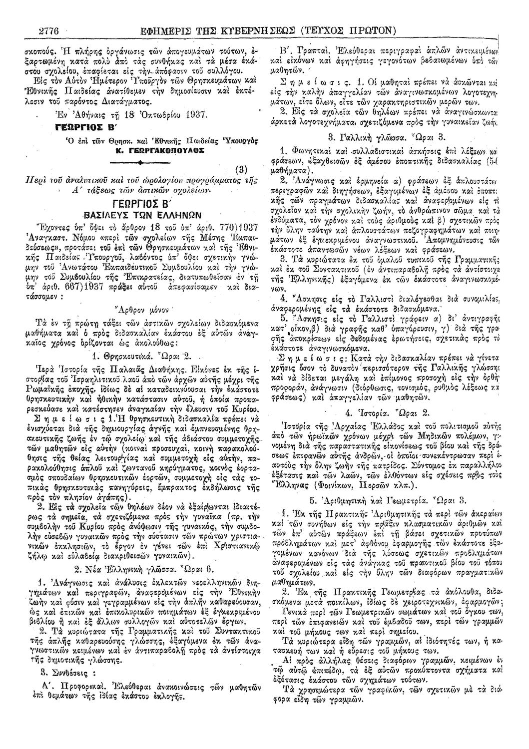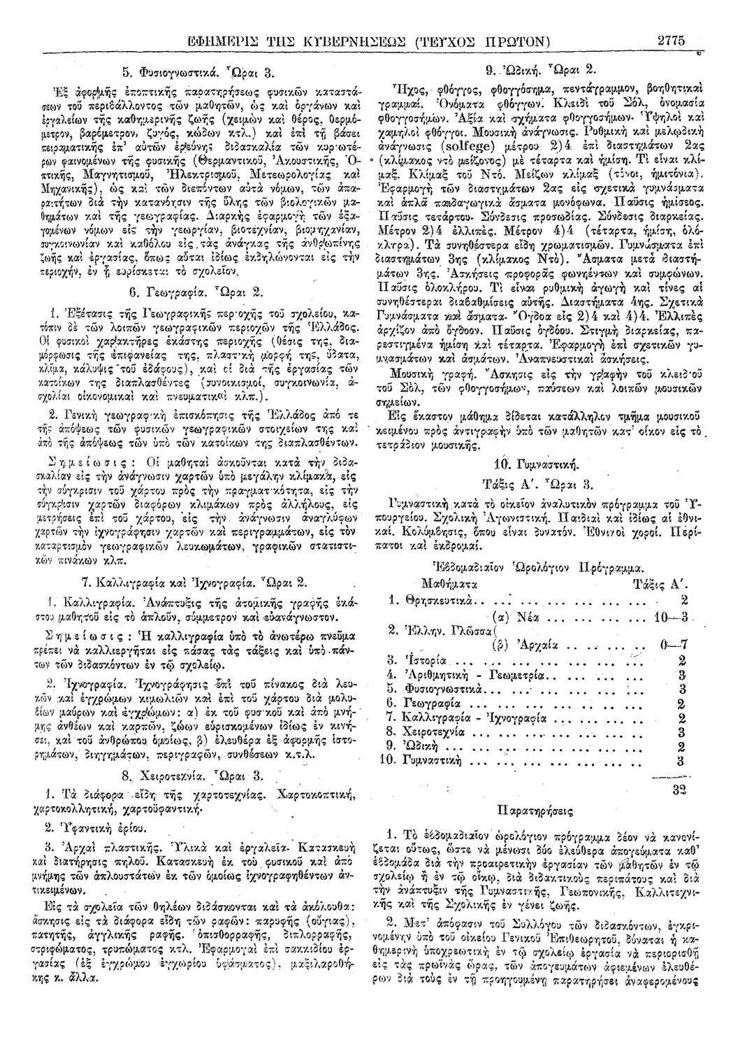 Δ. Περί του αναλυτικού και του ωρολογίου προγράμματος της πρώτης τάξεως Γυμνασίων