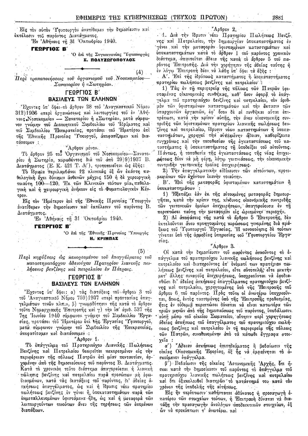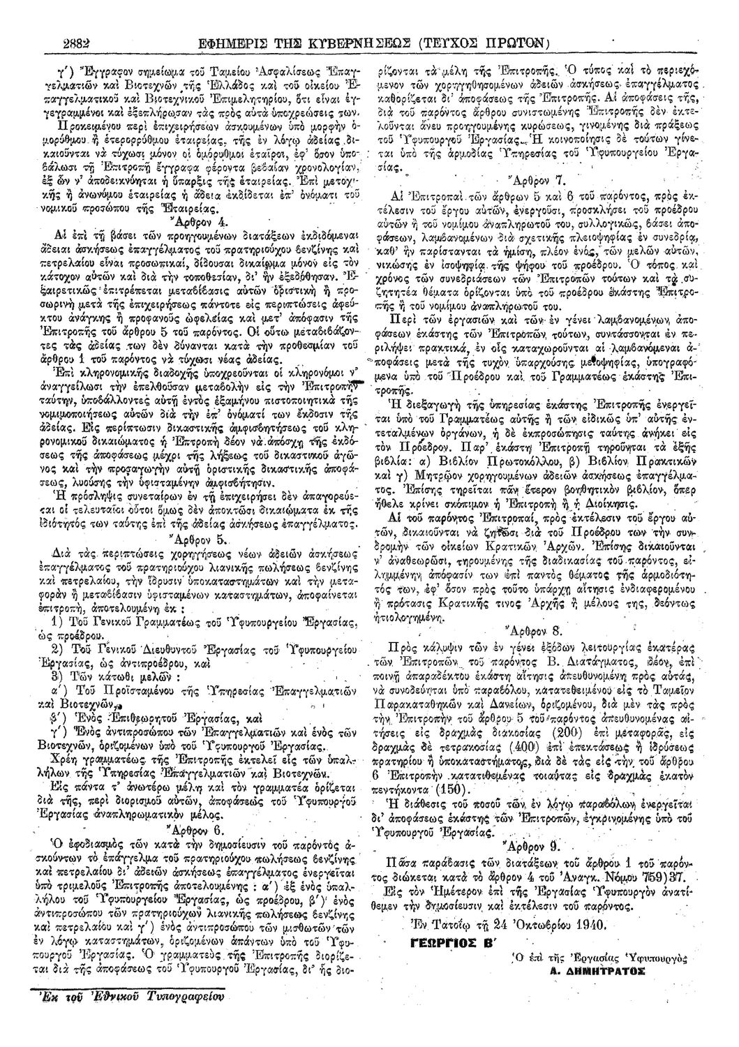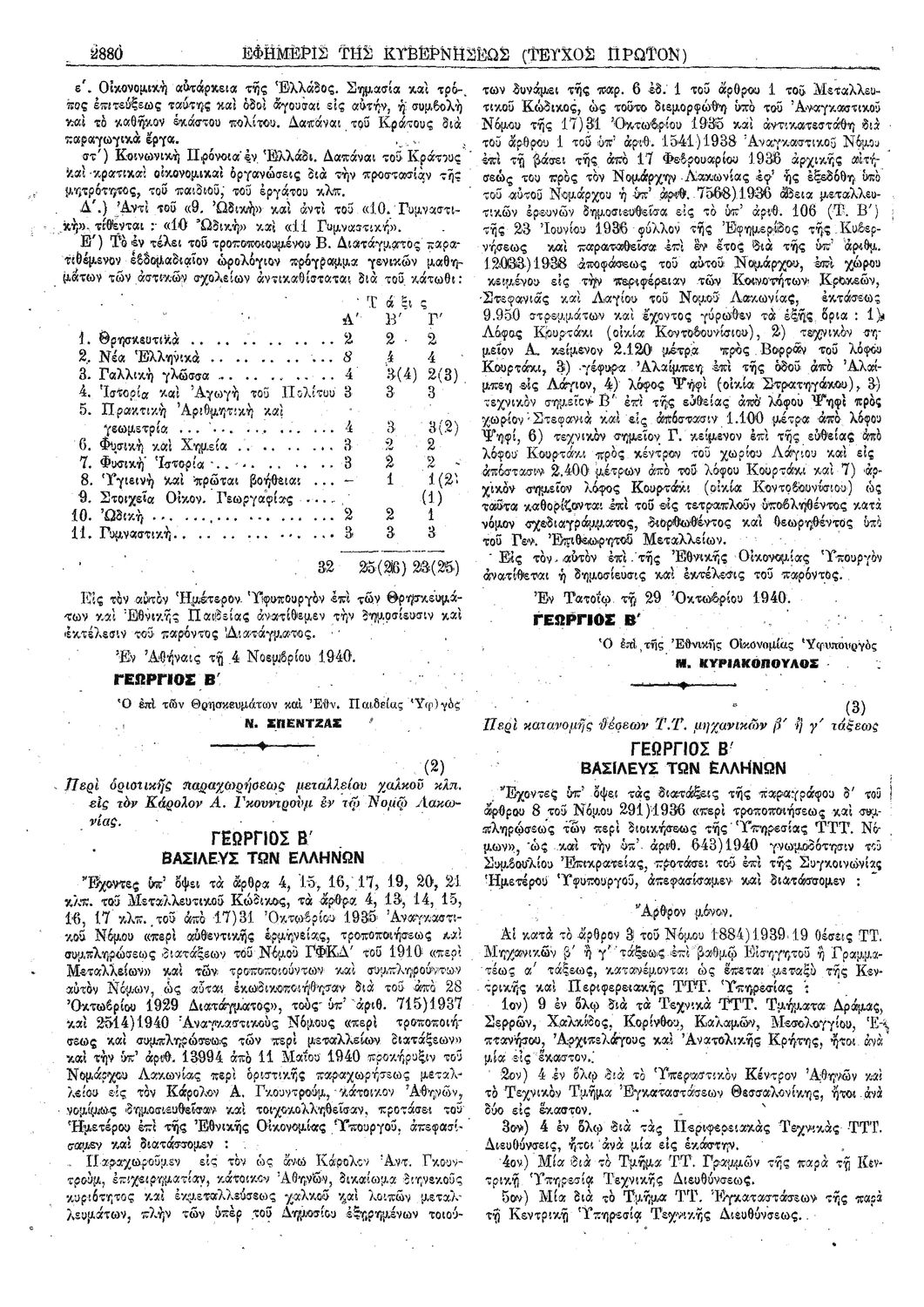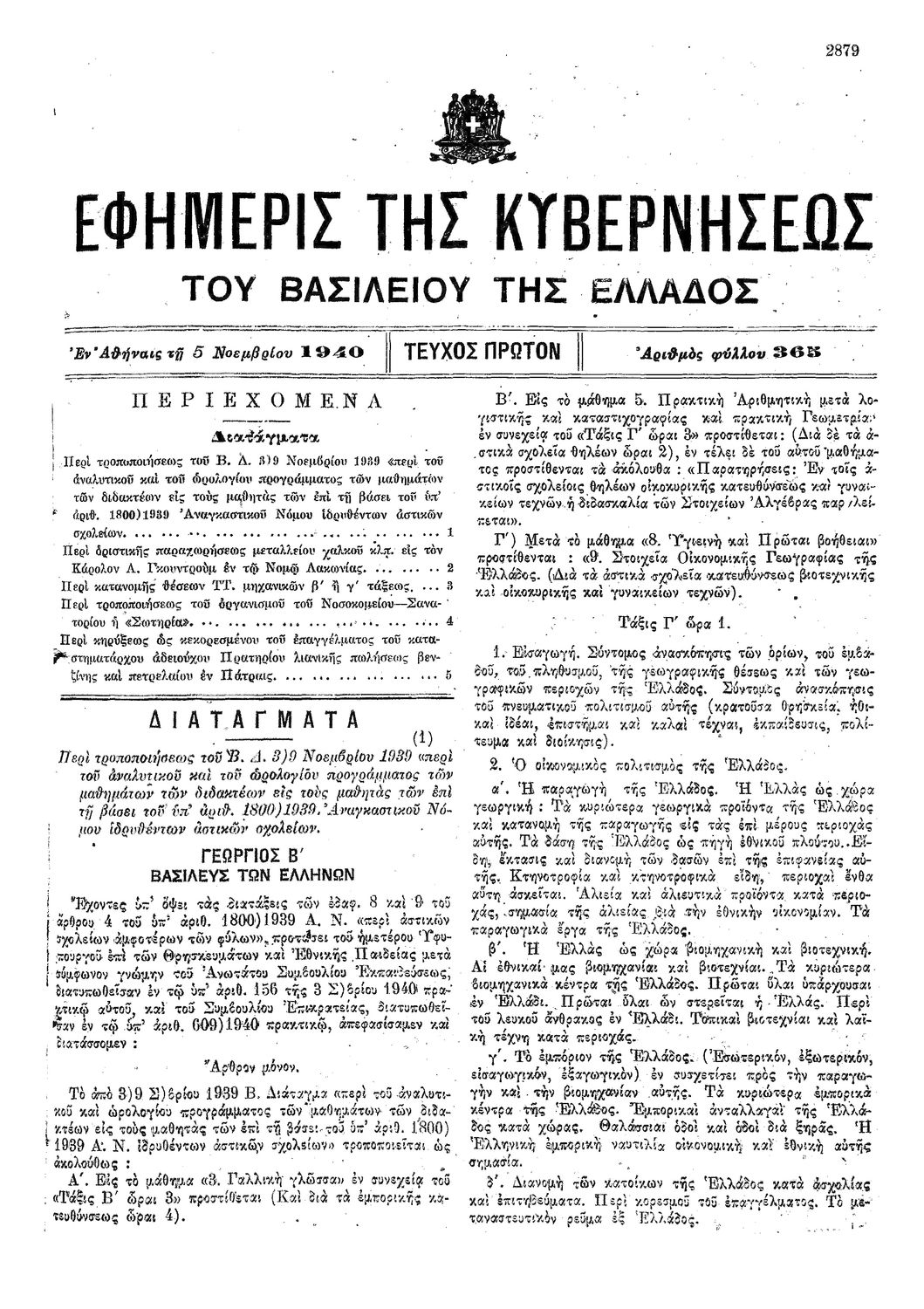 Δ. Περί τροποποιήσεως του Β.Δ. 3/9 Νοεμβρίου 1939 “περί του αναλυτικού και ωρολογίου προγράμματος των ειδικών μαθημάτων των διδακτέων εις τους μαθητάς των επί τη βάσει του υπ'αριθμ. 1800/1939 Αναγκαστικού Νόμου ιδρυθέντων αστικών σχολείων”