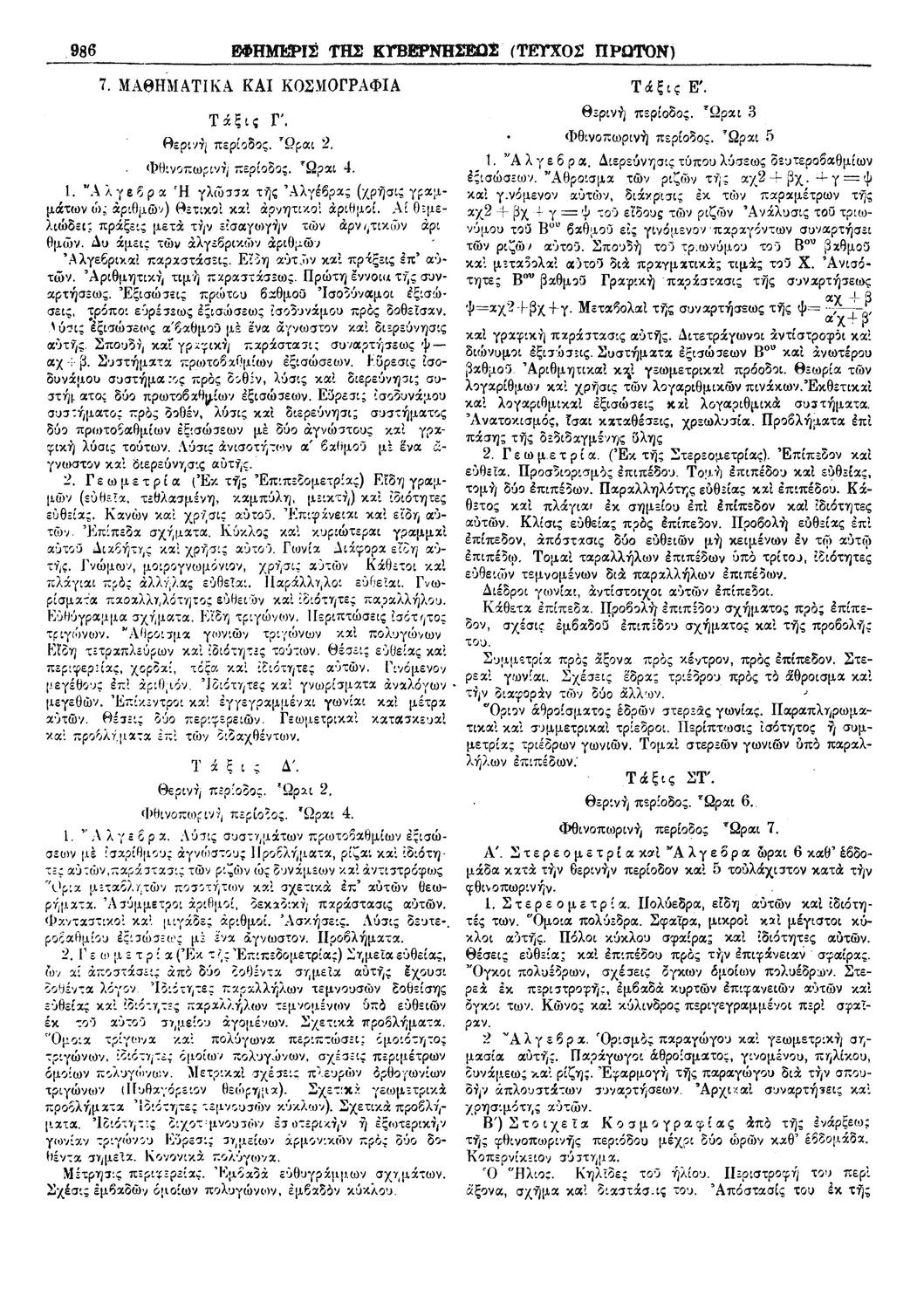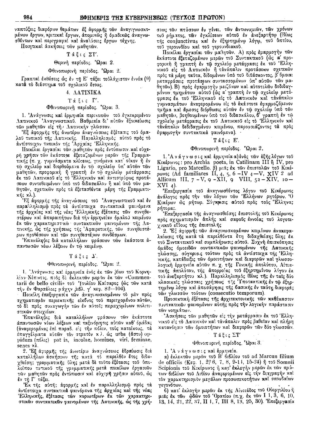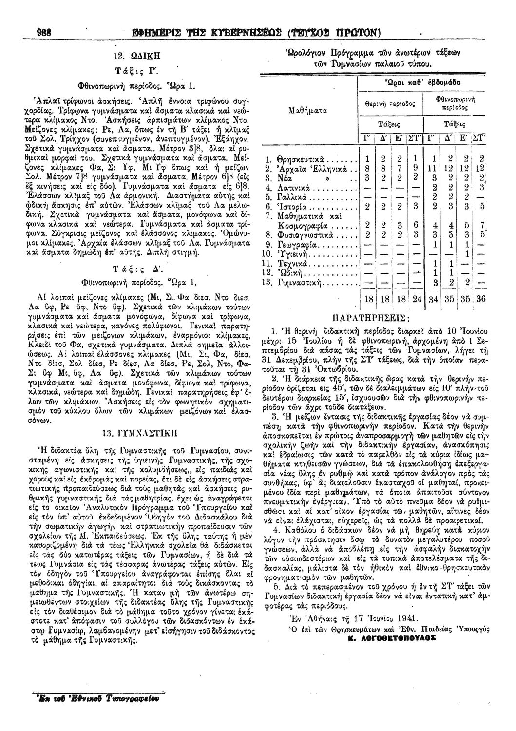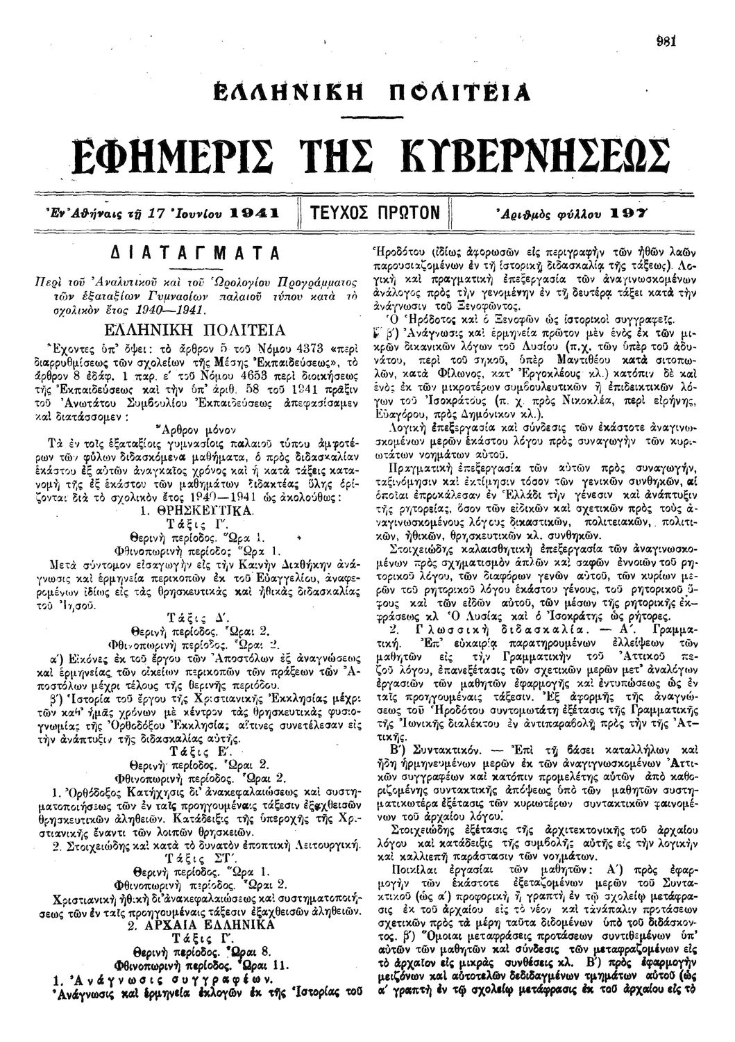 Δ. Περί του Αναλυτικού και του Ωρολογίου Προγράμματος των εξαταξίων Γυμνασίων παλαιού τύπου κατά το σχολκόν έτος 1940-1941