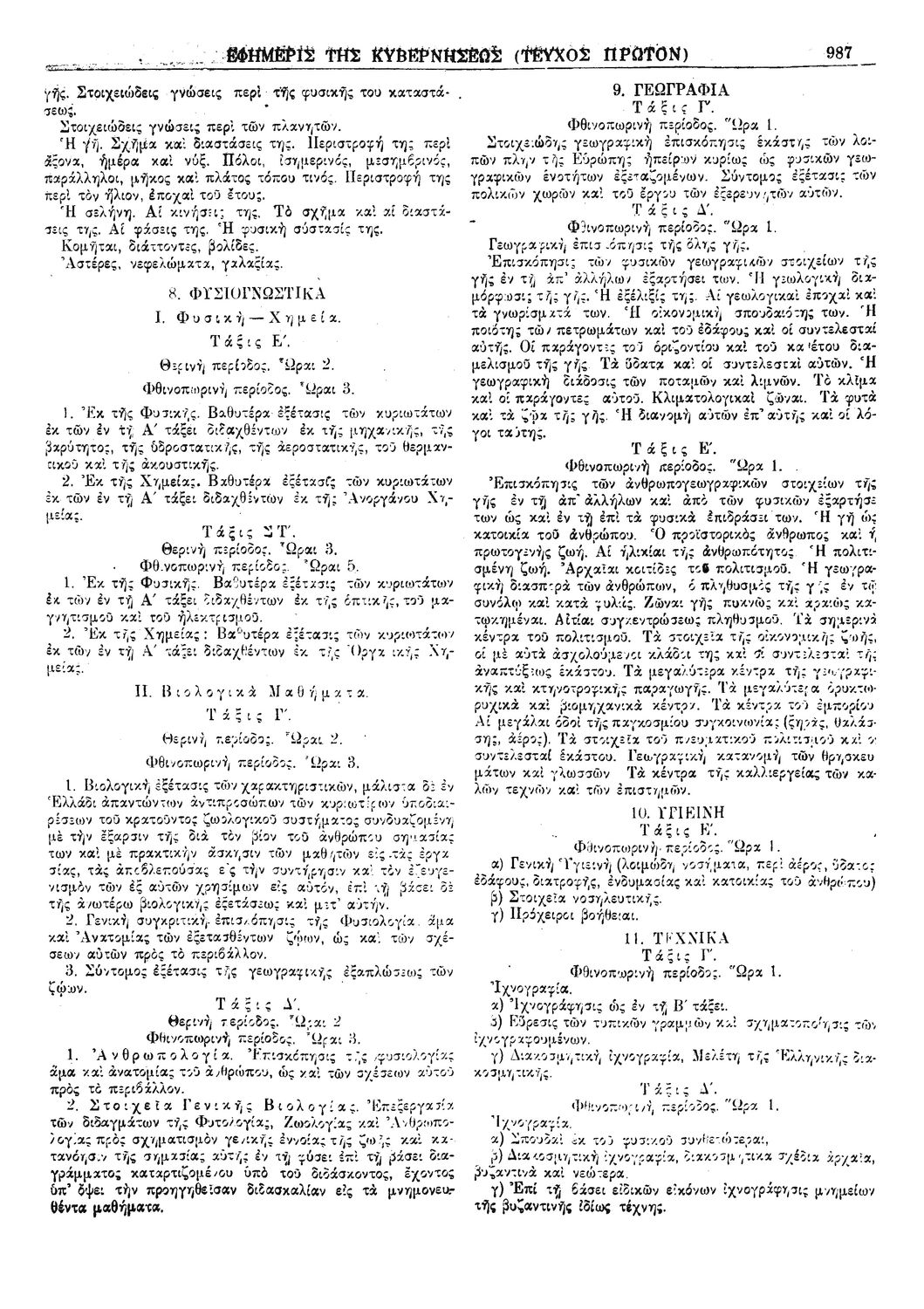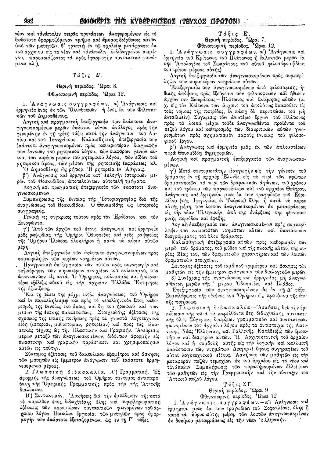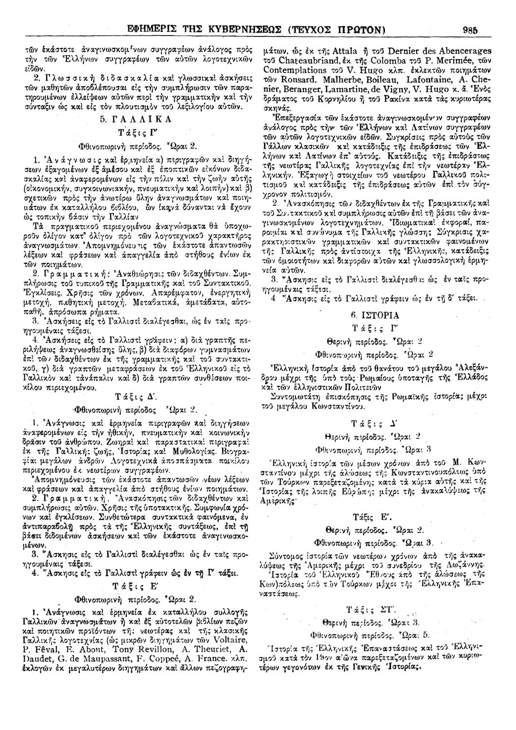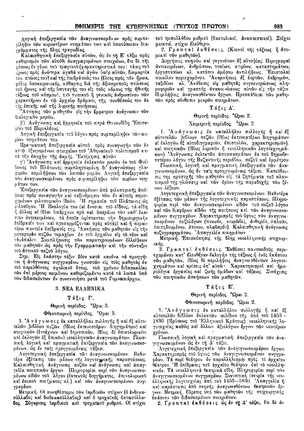 Δ. Περί του Αναλυτικού και του Ωρολογίου Προγράμματος των εξαταξίων Γυμνασίων παλαιού τύπου κατά το σχολκόν έτος 1940-1941