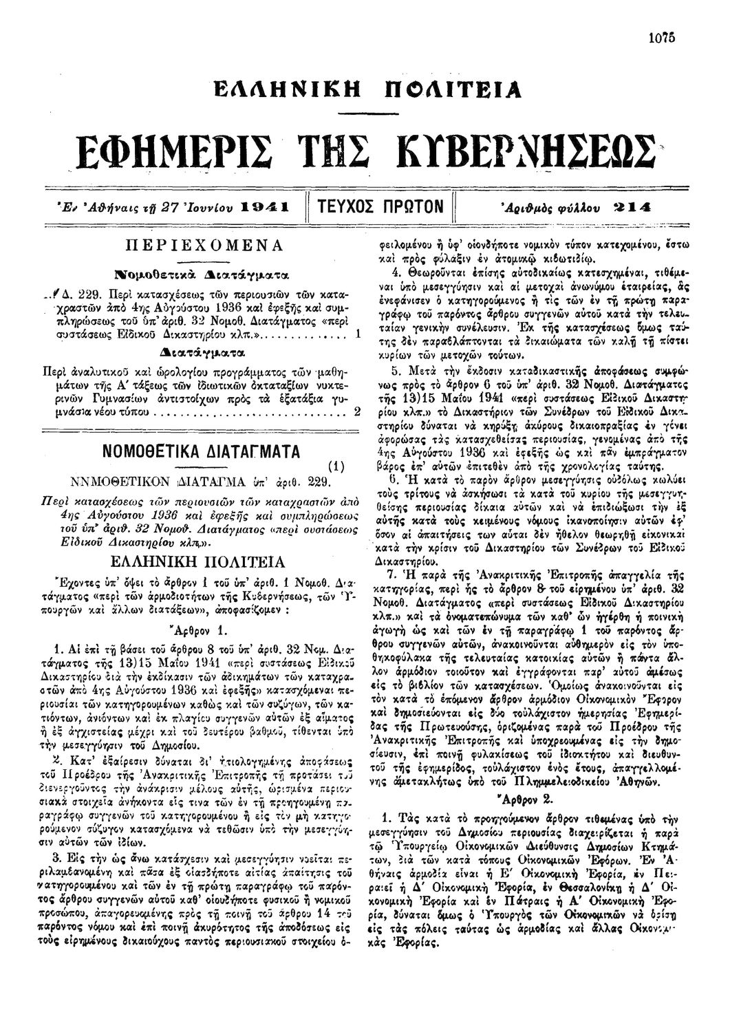 Κωδικός αναγνώρισης: 1941-214A Τίτλος: ΦΕΚ 214/27.06.1941, Τεύχος A Μέγεθος και υπόστρωμα: Φεκ προγραμμάτων σπουδών, 4 σελίδες. |