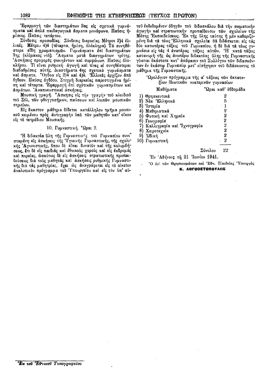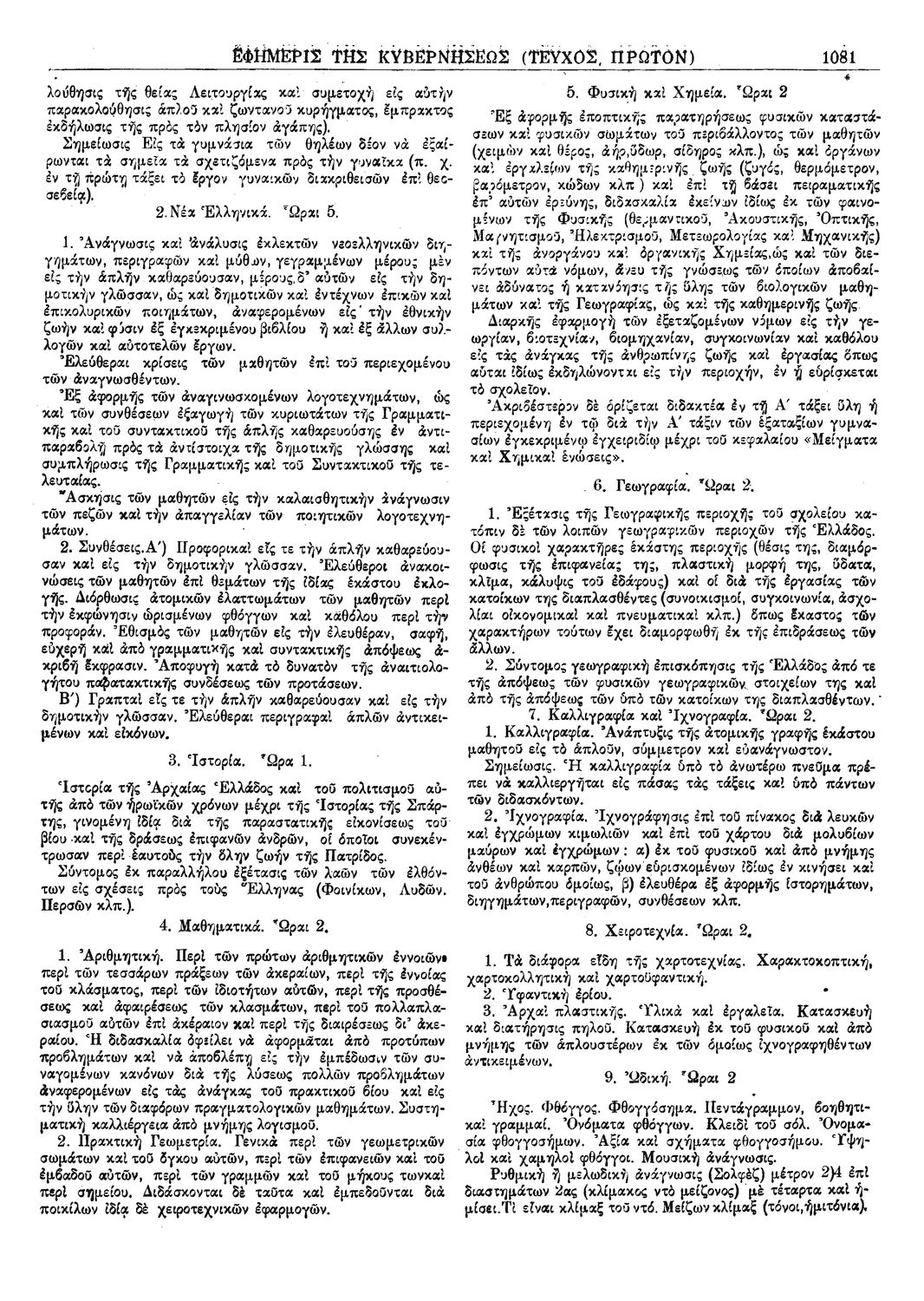 Δ. Περί αναλυτικού και ωρολογίου προγράμματος των μαθημάτων της Α' τάξεως των ιδιωτικών οκταταξίων νυκτερινών Γυμνασίων αντιστοίχων προς τα τα εξατάξια γυμνάσια νέου τύπου