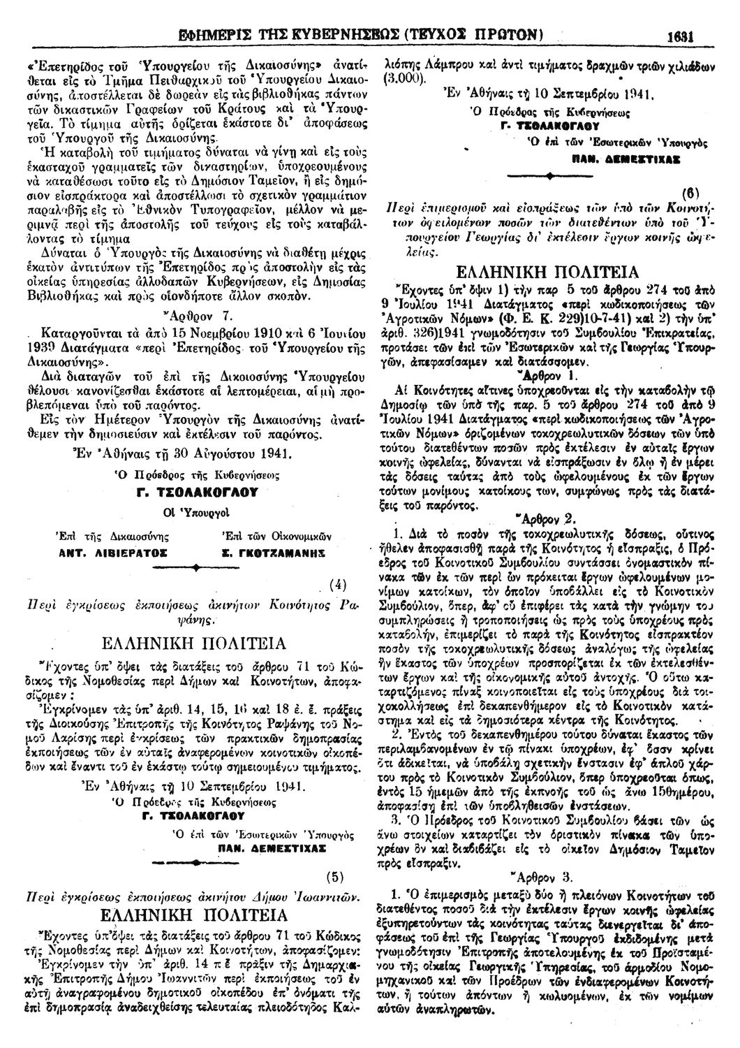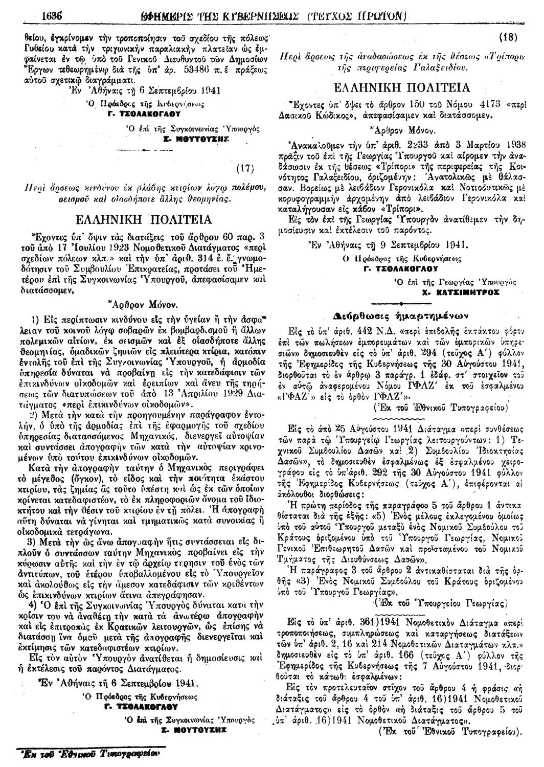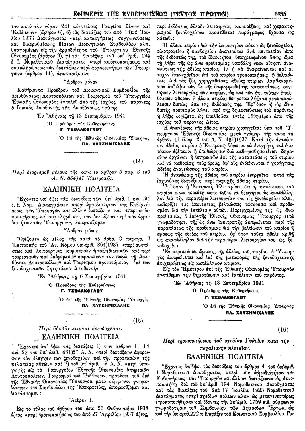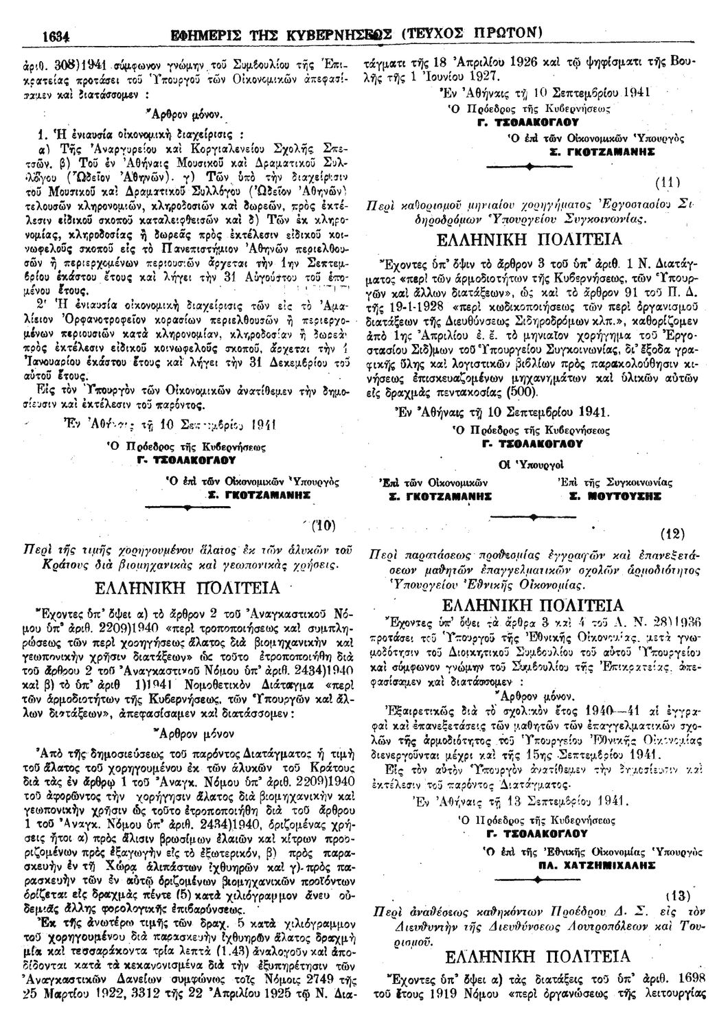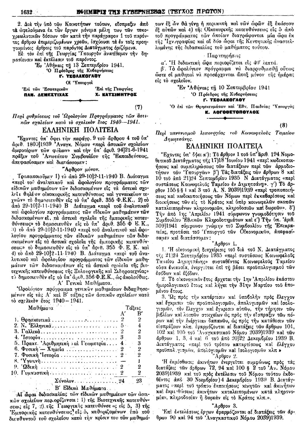 Κ.Δ. Περί ρυθμίσεως του Ωρολογίου Προγράμματος των αστικών σχολεία κατά το σχολικόν έτος 1941-1942