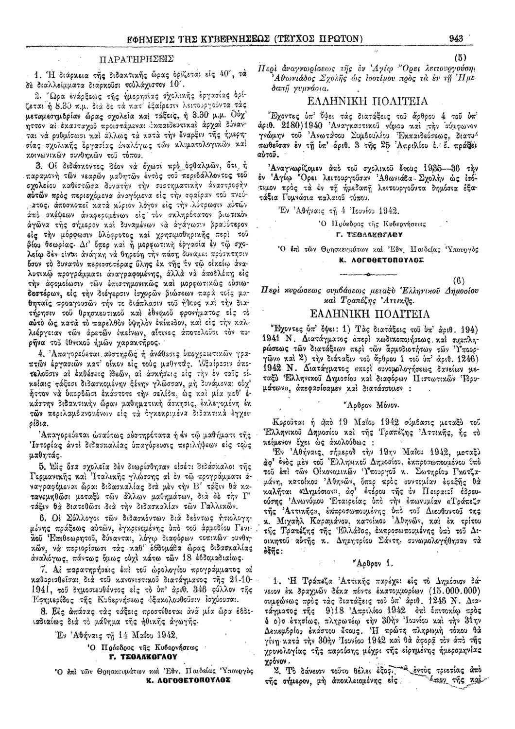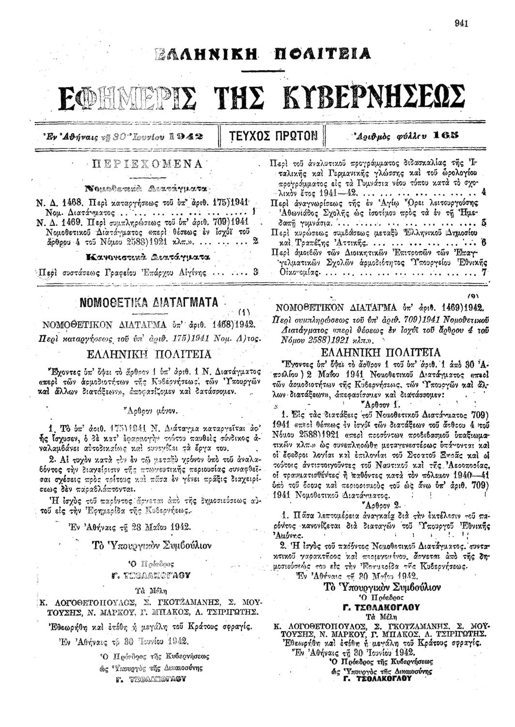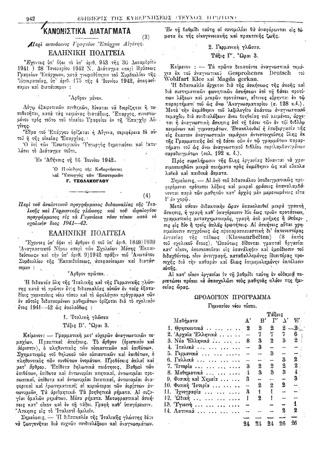 Κ.Δ. Περί του αναλυτικού προγράμματος διδασκαλίας της Ιταλικής και Γερμανικής γλώσσης και του ωρολογίου προγράμματος εις τα γυμνάσια νέου τύπου κατά το σχολικόν έτος 1941-1942