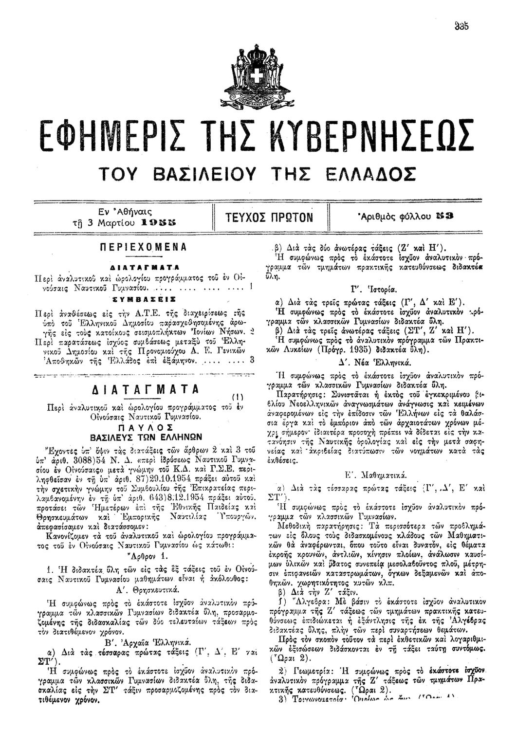 Κωδικός αναγνώρισης: 1955-053A Τίτλος: ΦΕΚ 53/03.03.1955, Τεύχος Α Μέγεθος και υπόστρωμα: Φεκ προγραμμάτων σπουδών, 5 σελίδες. |