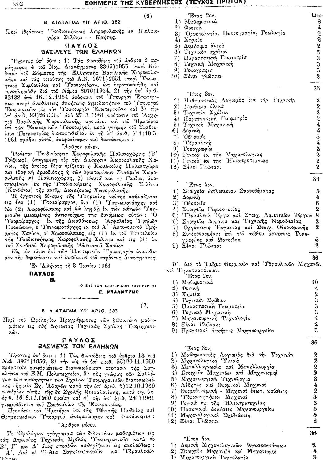 Β.Δ. 383 Περί του ωρολογίου προγράμματος των διδακτέων μαθημάτων εις τας Δημοσίας Τεχνικάς Σχολάς Υπομηχανικών