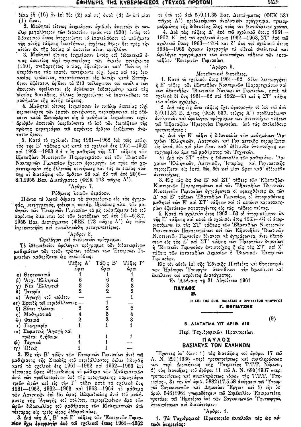 Β.Δ. 617 Περί καθορισμού του αναλυτικού και ωρολογίου προγράμματος των εσπερινών Γυμνασίων, της αντιστοιχίας των τάξεων αυτών προς τας των ημερησίων Γυμνασίων και ρυθμίσεως της εν γένει λειτουργίας αυτών