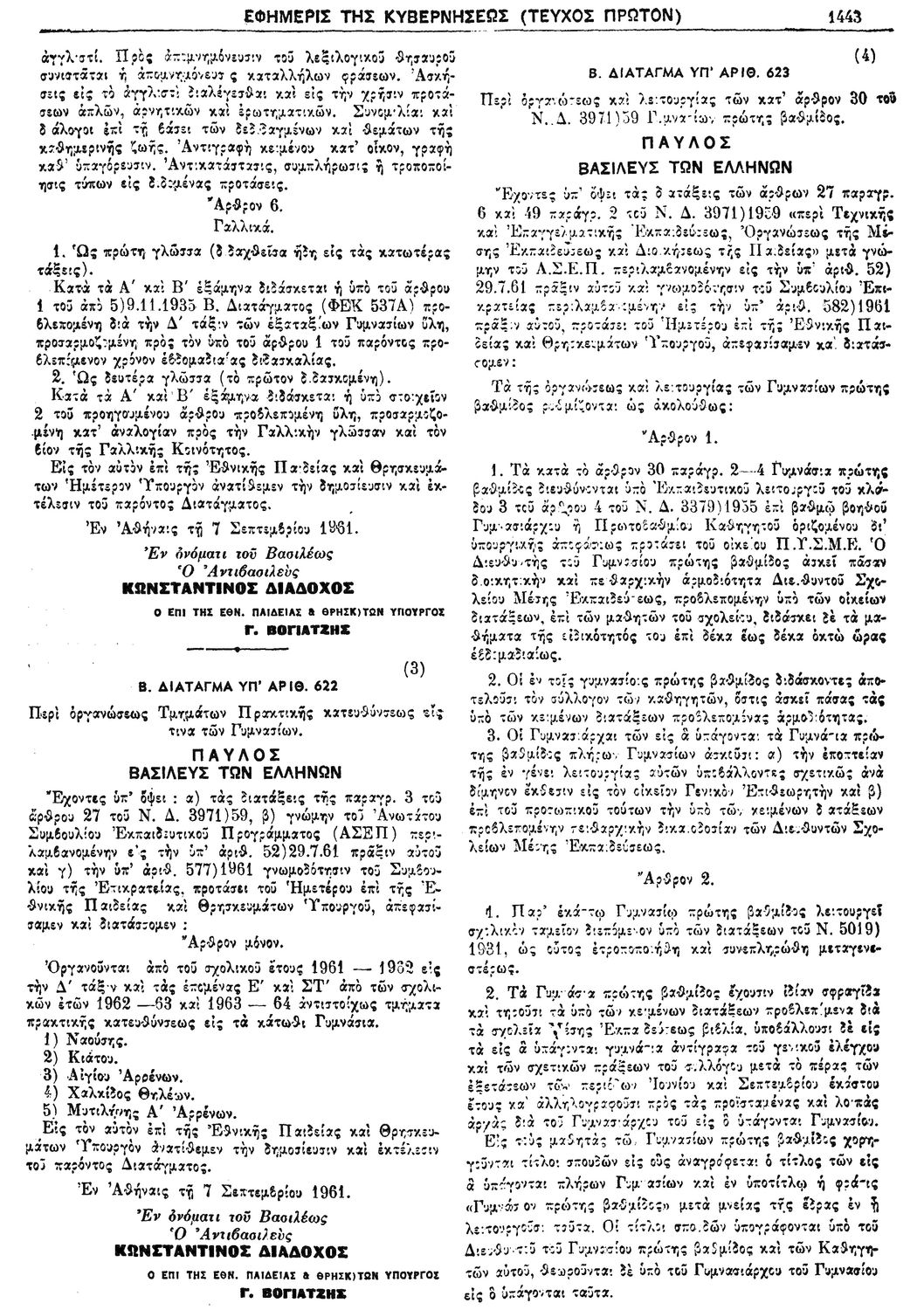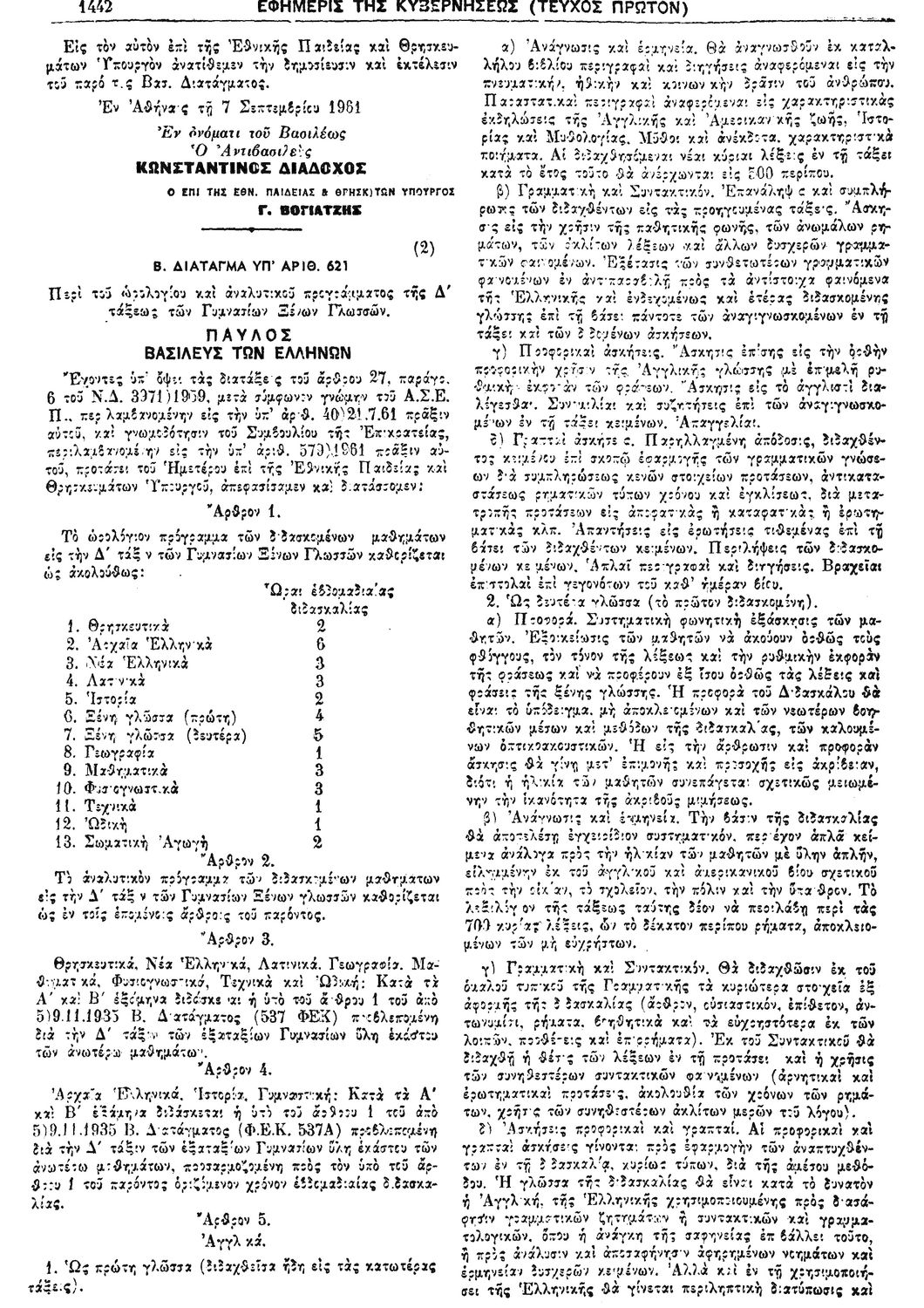 Β.Δ. 620 Περί του αναλυτικού και ωρολογίου προγράμματος της Ε' τάξεων Γυμνασίων πρακτικής κατευθύνσεως
