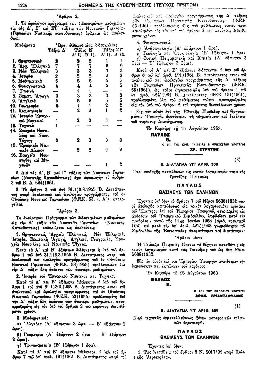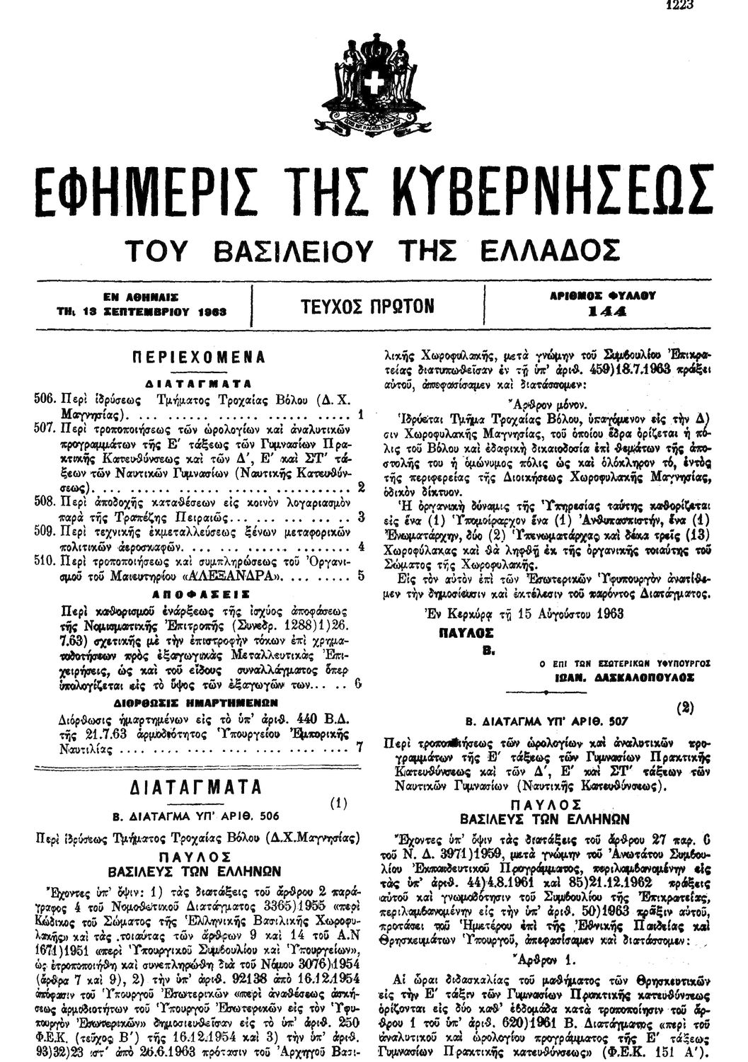 Δ. 507 Περί τροποποιήσεως των ωρολογίων και αναλυτικών προγραμμάτων της Ε' τάξεως των Γυμνασίων Πρακτικής κατευθύνσεως και των Δ', Ε' και ΣΤ' τάξεων των Ναυτικών Γυμνασίων (Ναυτικής Κατευθύνσεως)