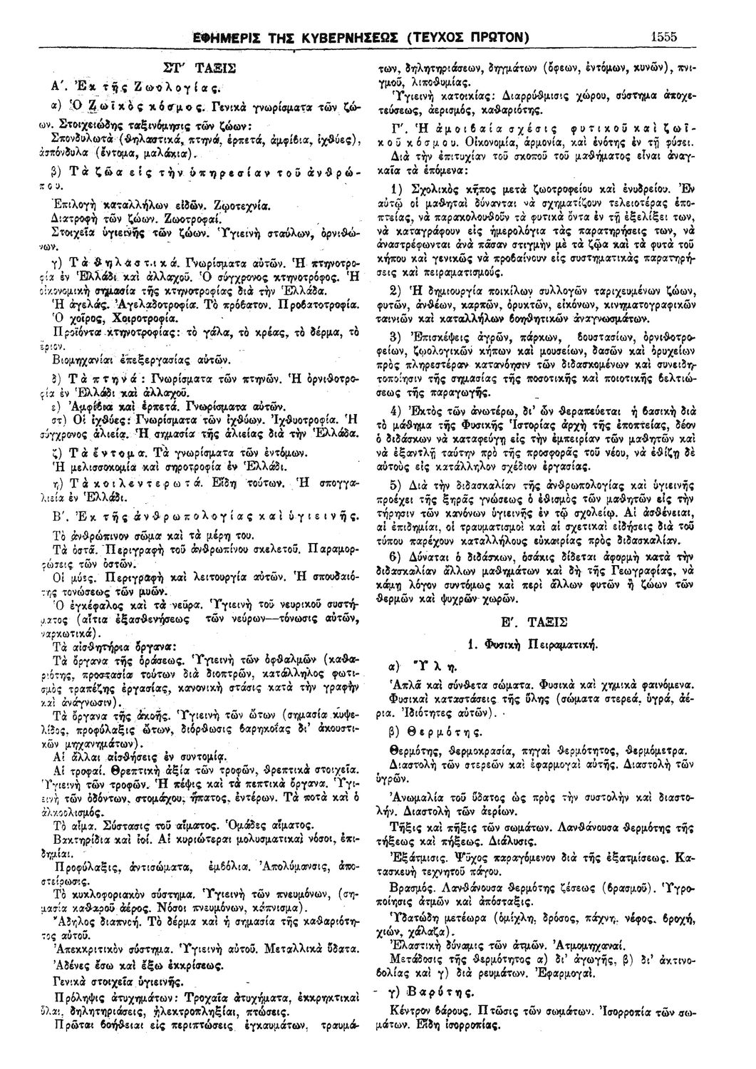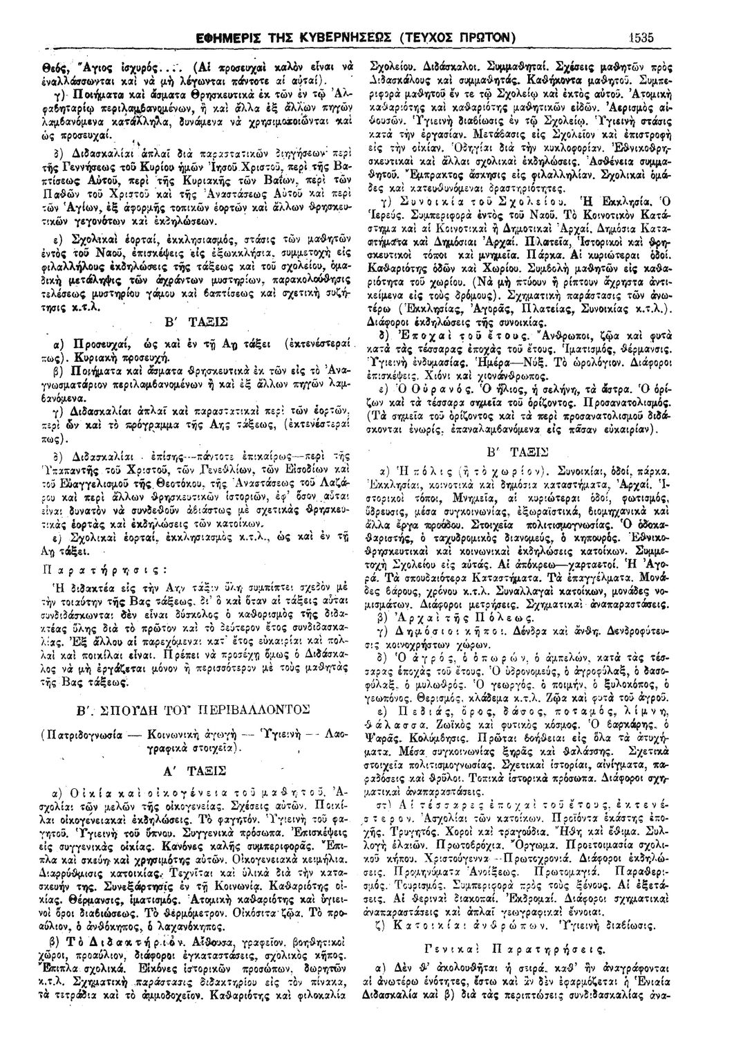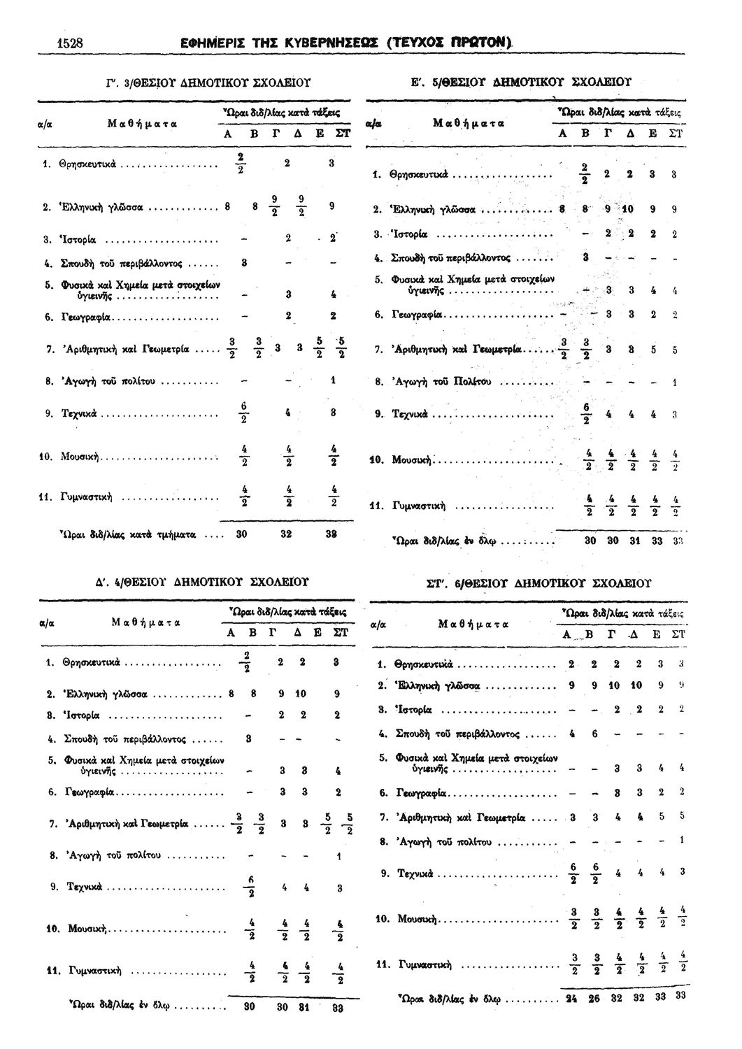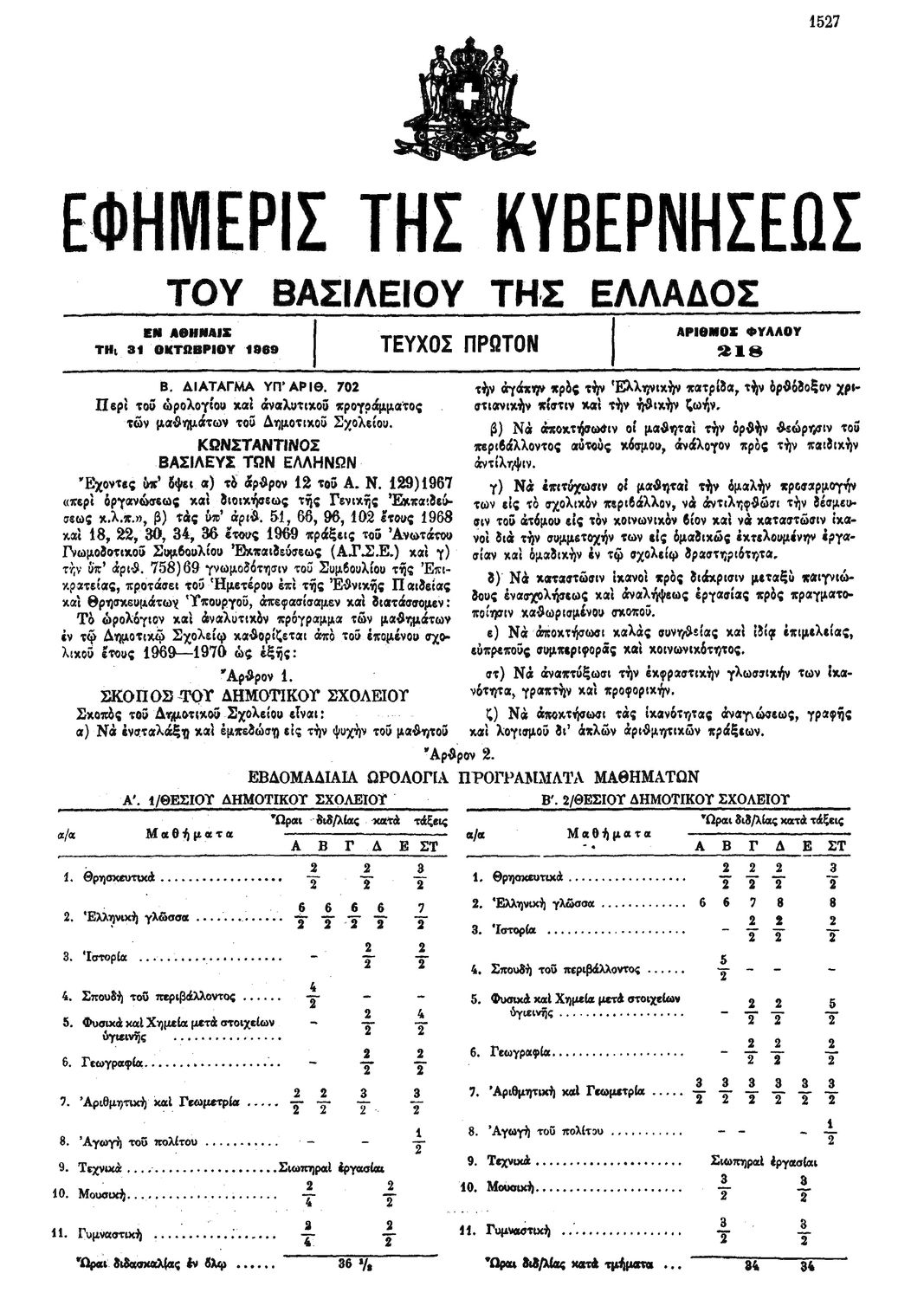 Β.Δ. 702 Περί των ωρολογίου και αναλυτικού προγράμματος των μαθημάτων του Δημοτικού Σχολείου