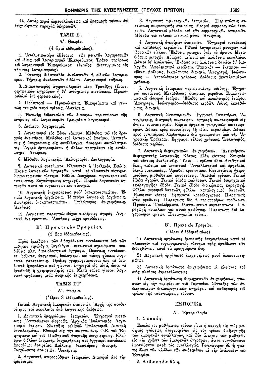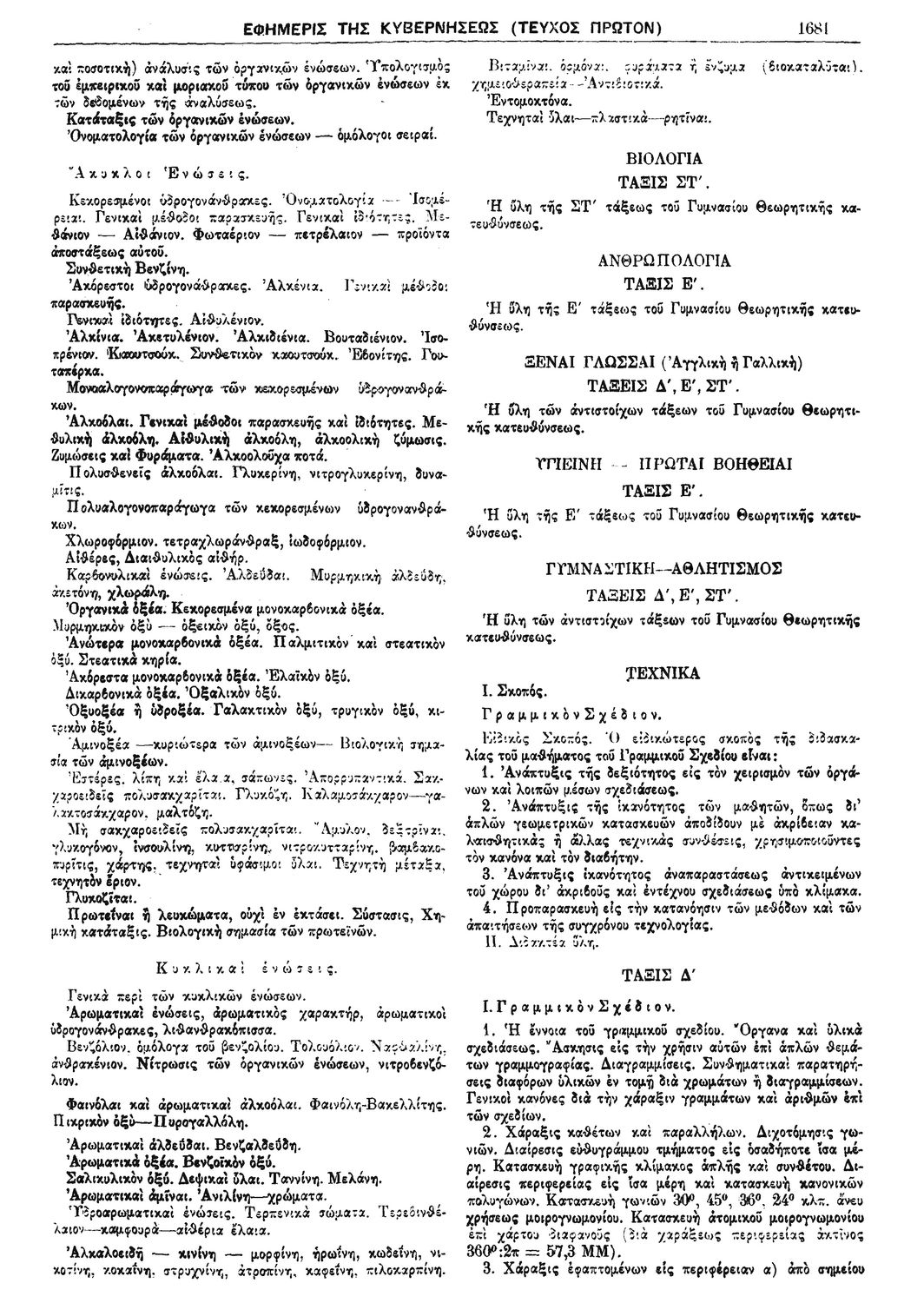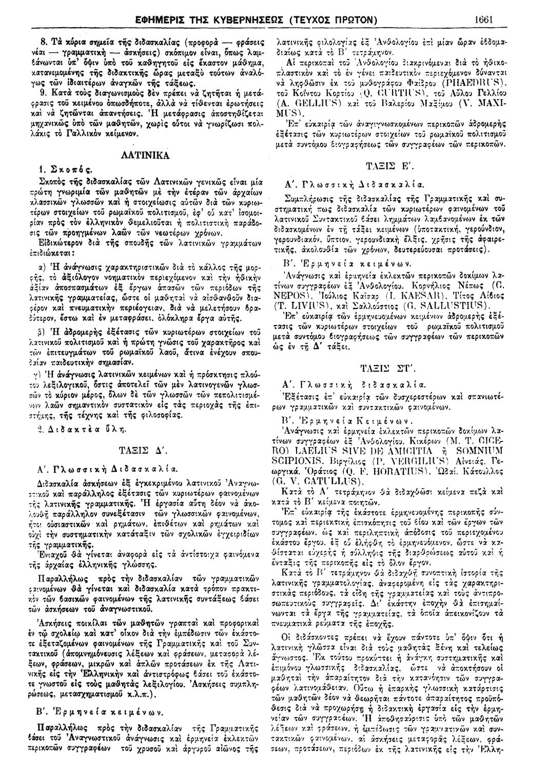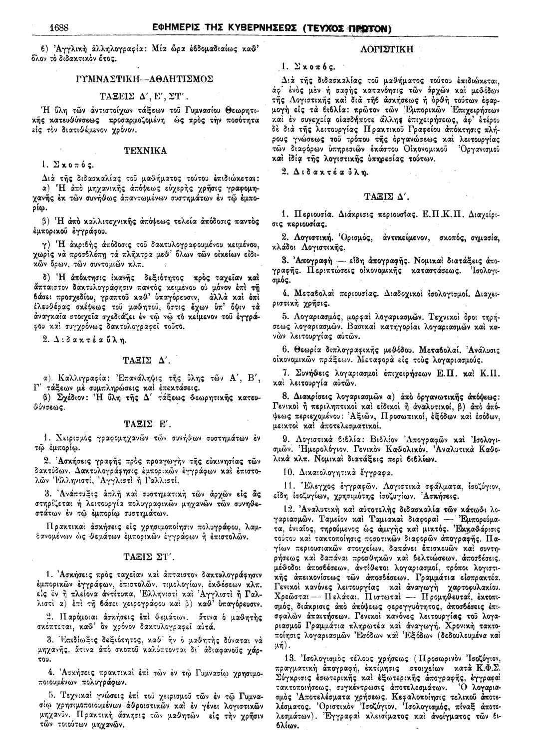 Β.Δ. 723 Περί των ωρολογίων και αναλυτικών προγραμμάτων των μαθημάτων των σχολείων της Μέσης Εκπαιδεύσεως