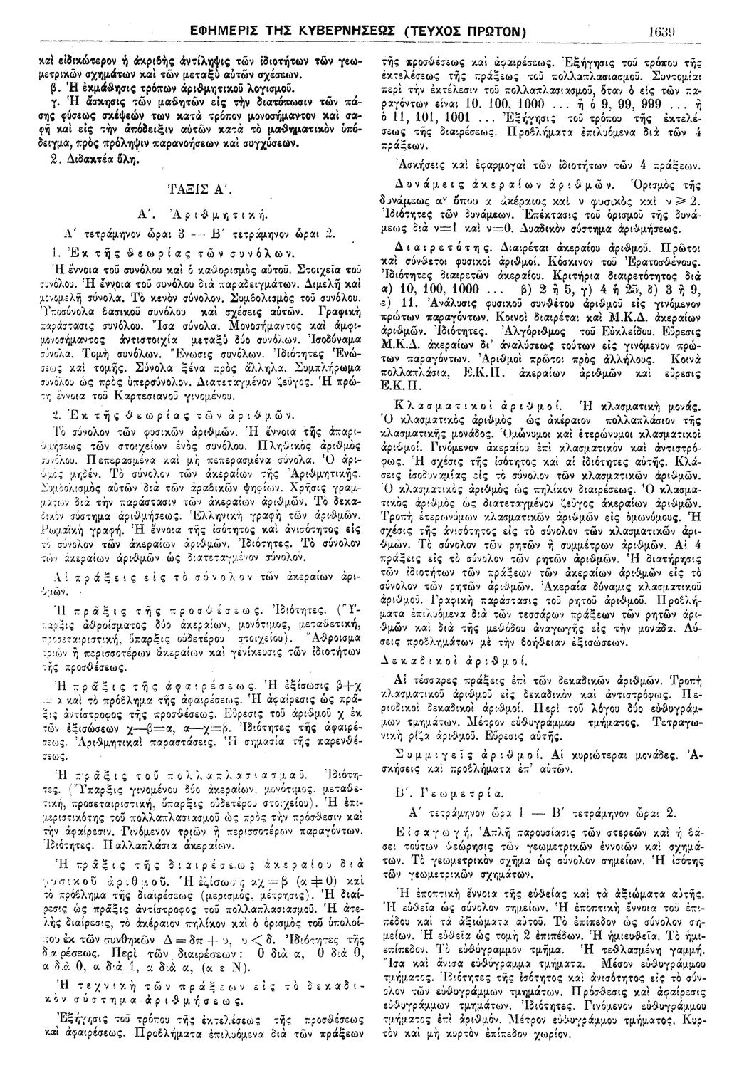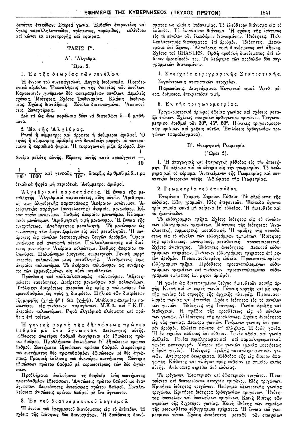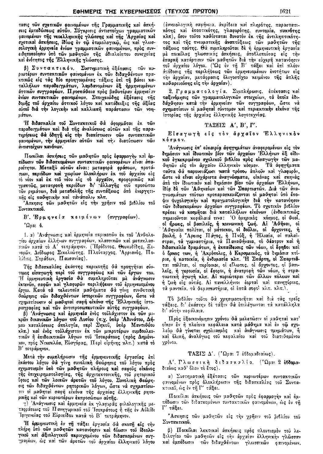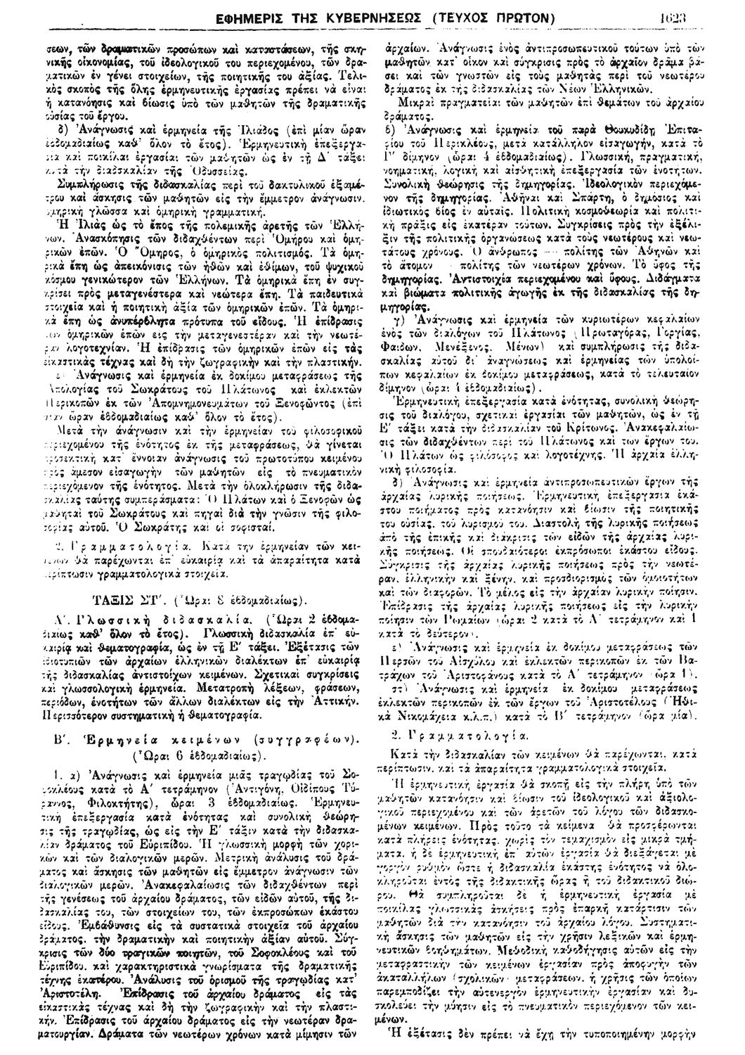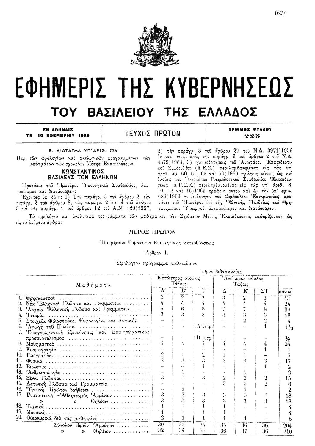Β.Δ. 723 Περί των ωρολογίων και αναλυτικών προγραμμάτων των μαθημάτων των σχολείων της Μέσης Εκπαιδεύσεως