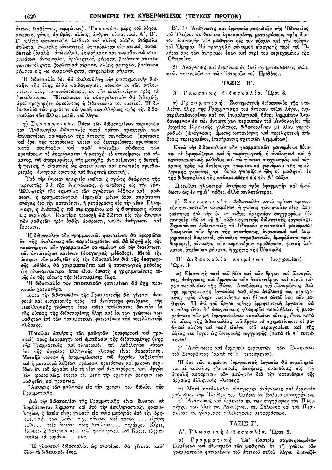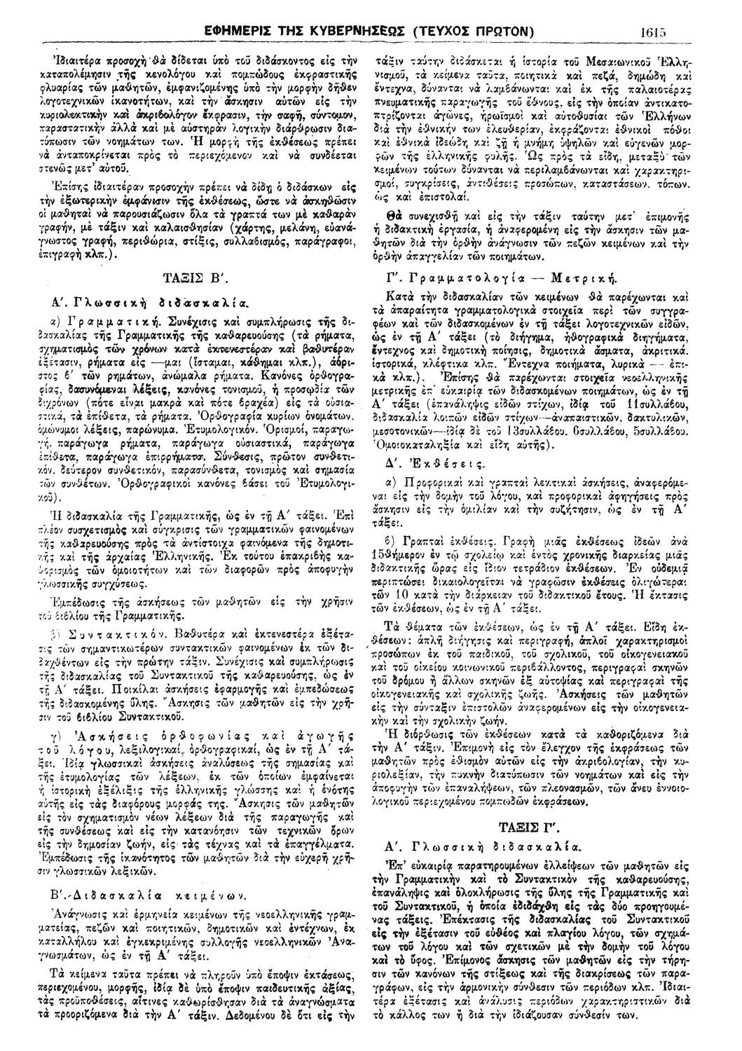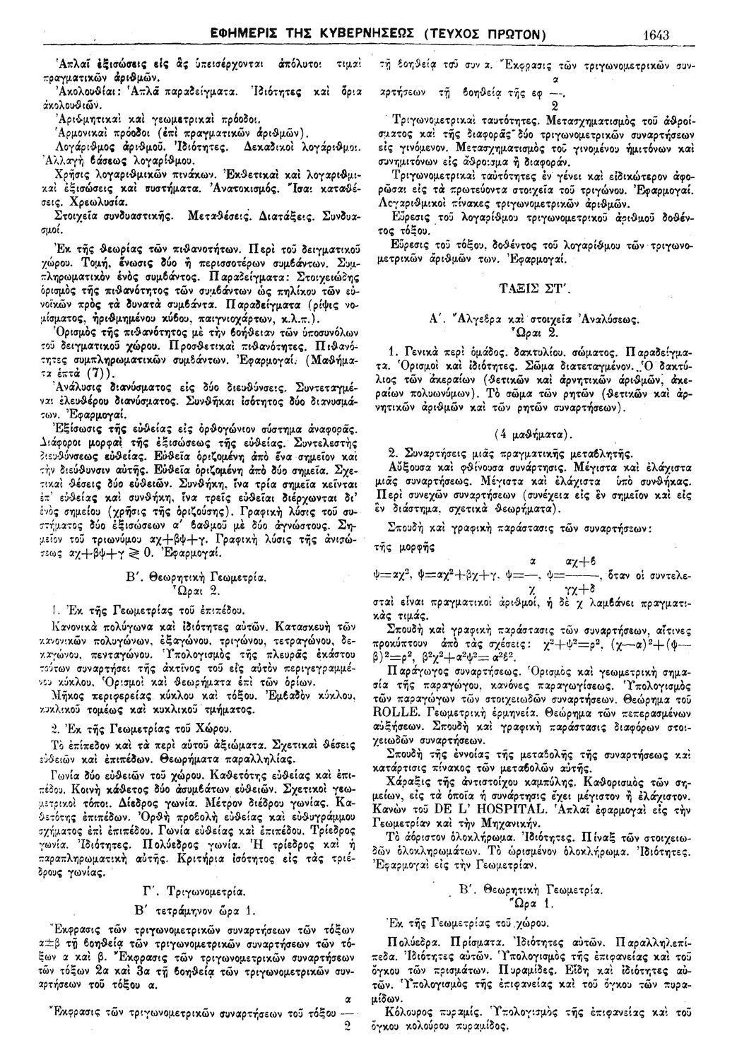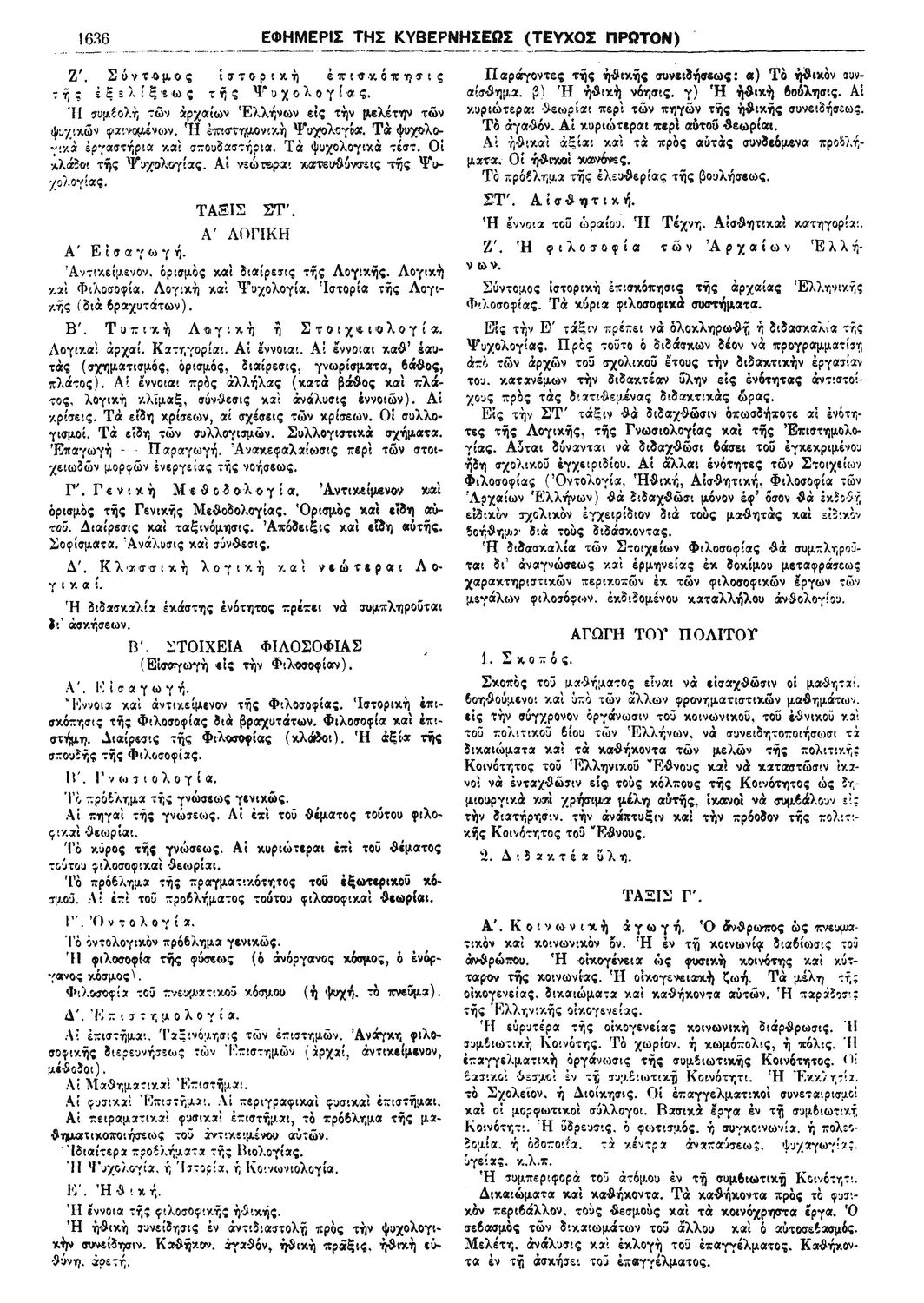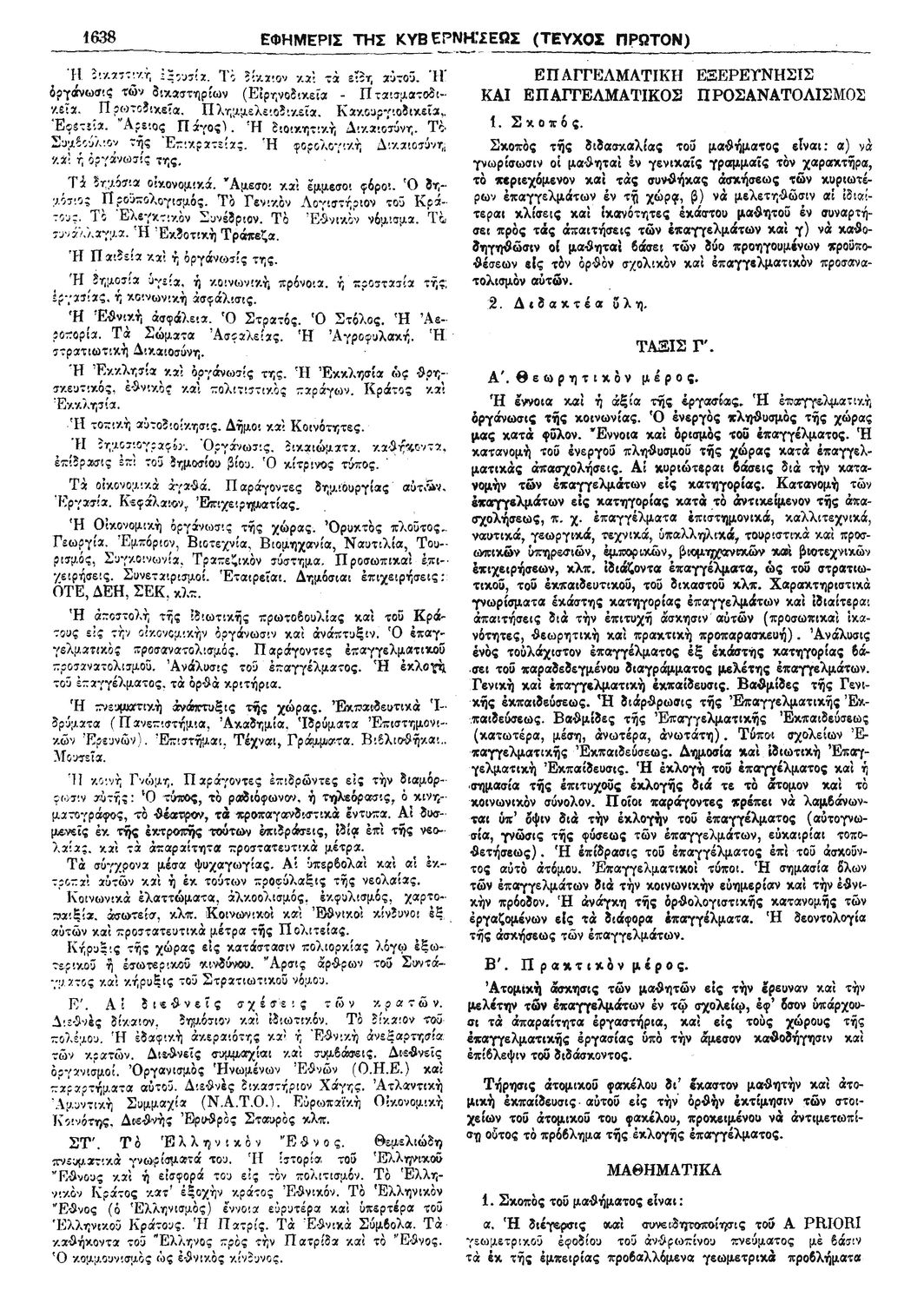 Β.Δ. 723 Περί των ωρολογίων και αναλυτικών προγραμμάτων των μαθημάτων των σχολείων της Μέσης Εκπαιδεύσεως