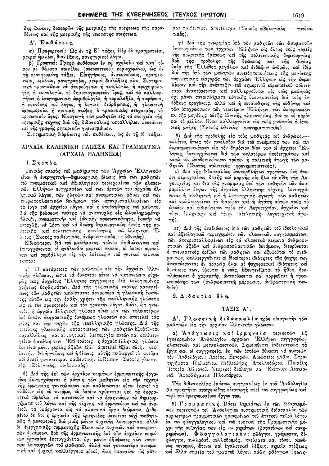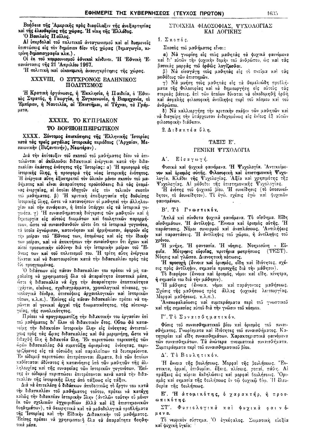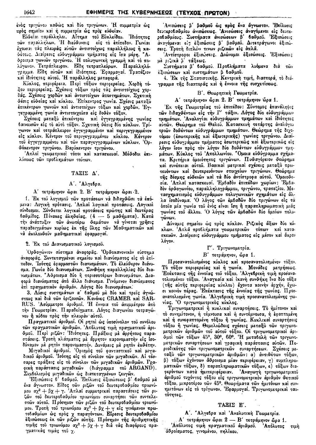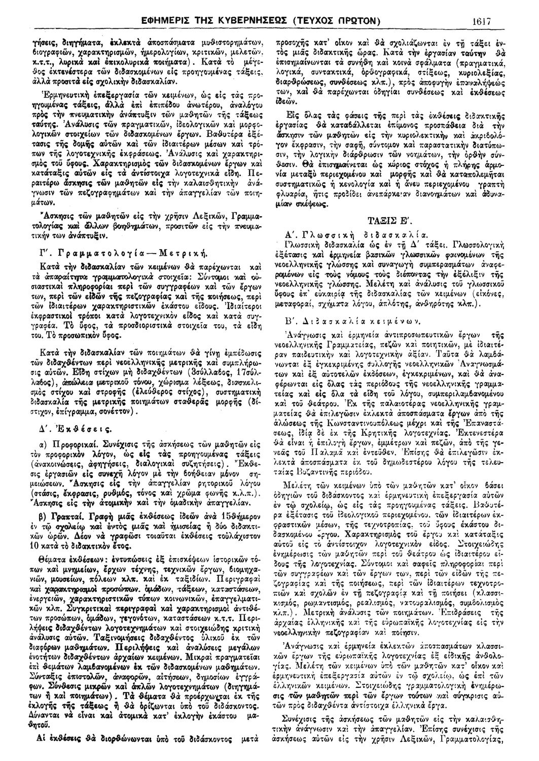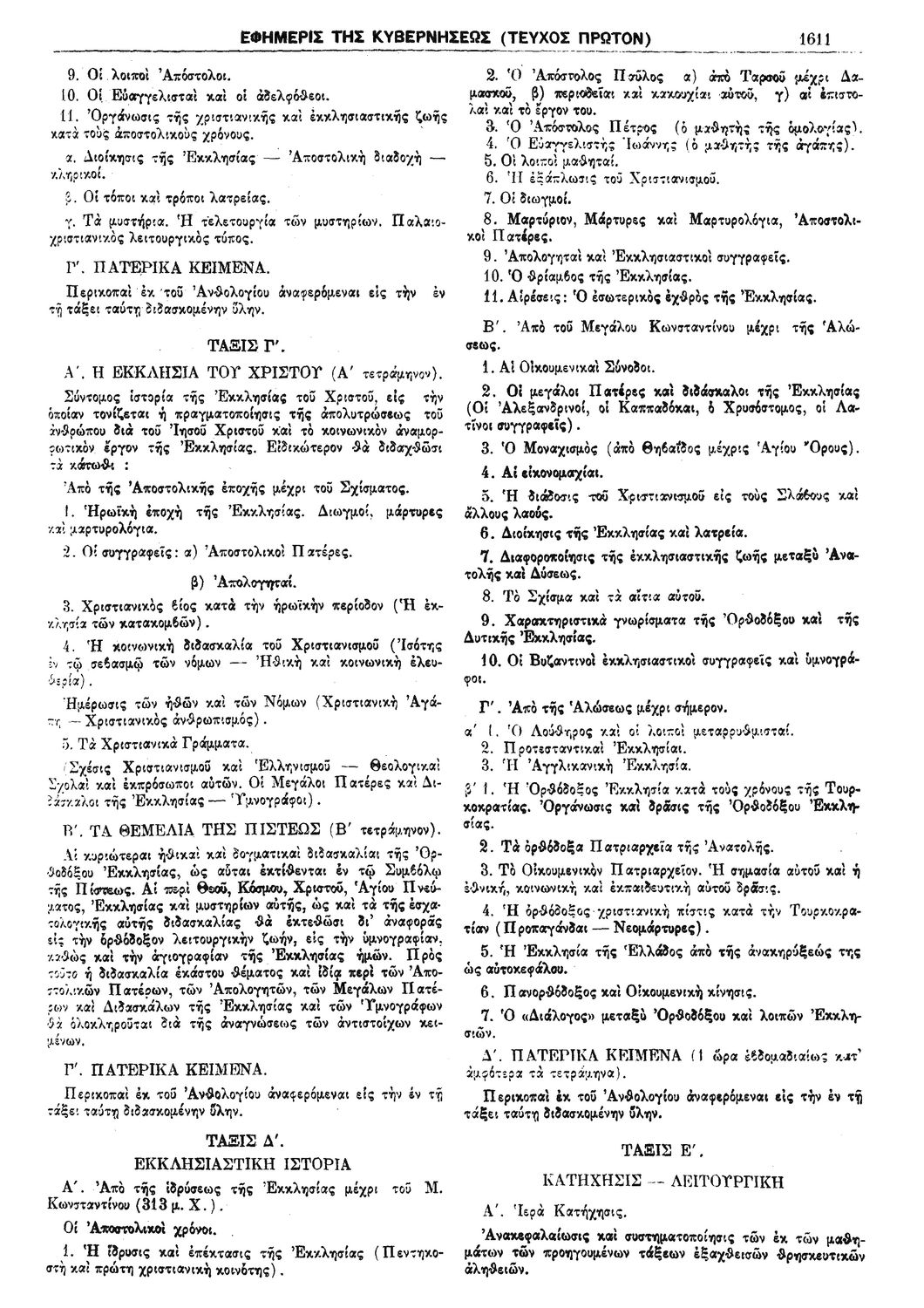Β.Δ. 723 Περί των ωρολογίων και αναλυτικών προγραμμάτων των μαθημάτων των σχολείων της Μέσης Εκπαιδεύσεως