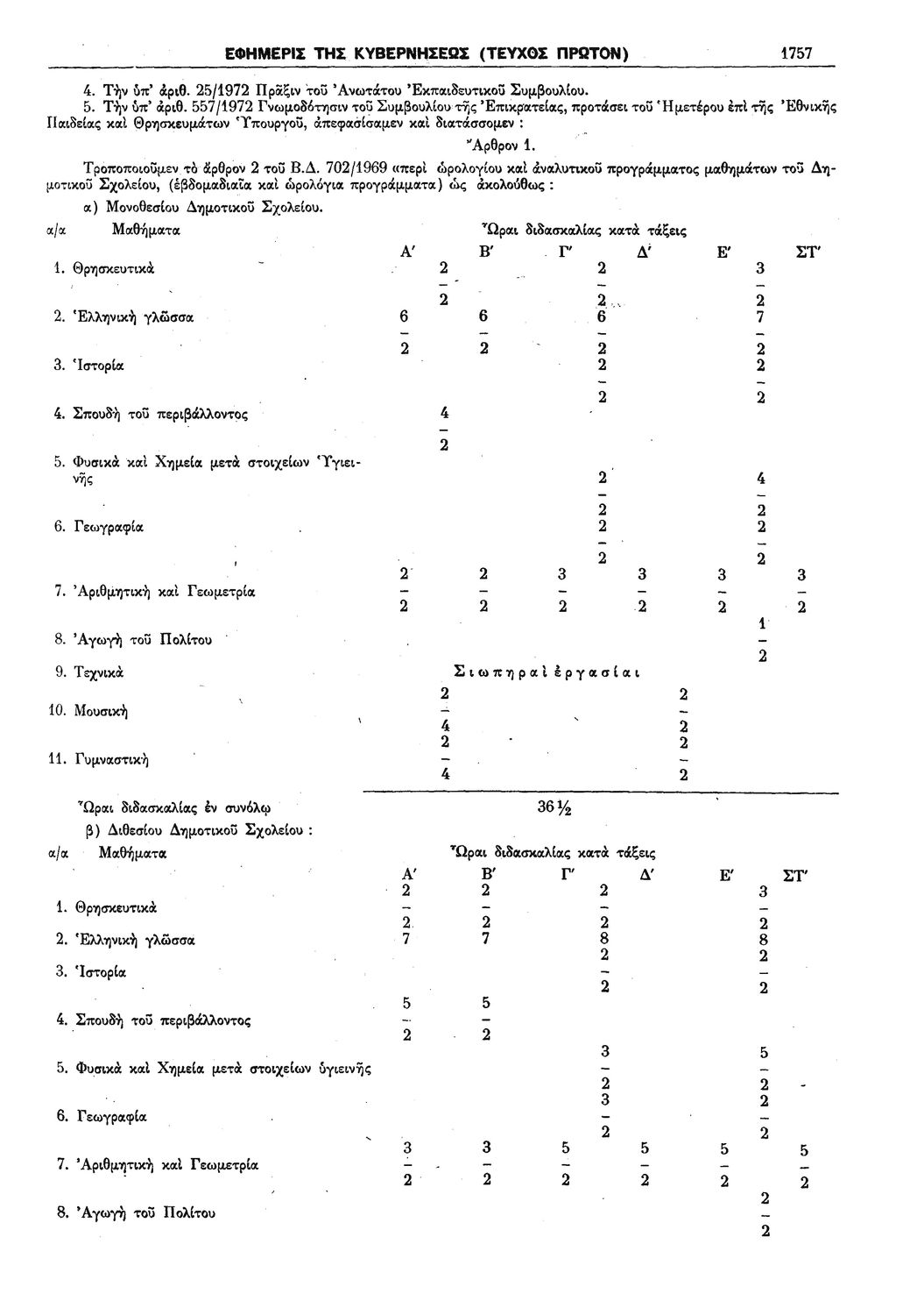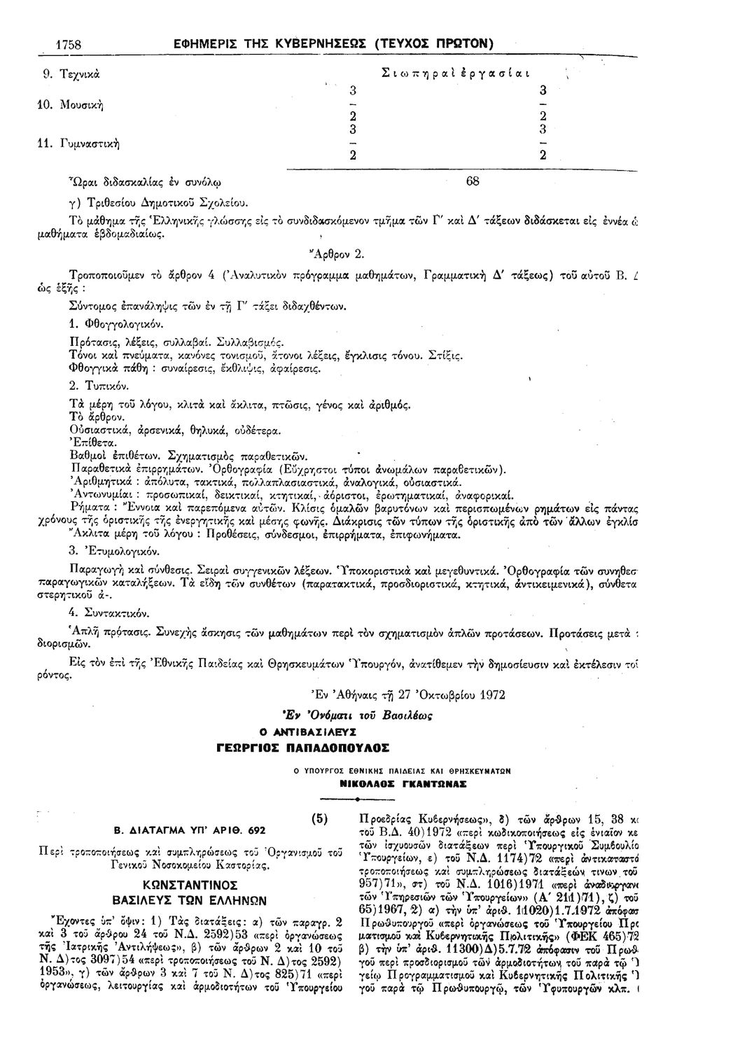 Δ. 691 Περί τροποποιήσεως του αναλυτικού προγράμματος των μαθημάτων του Δημοτικού Σχολείου
