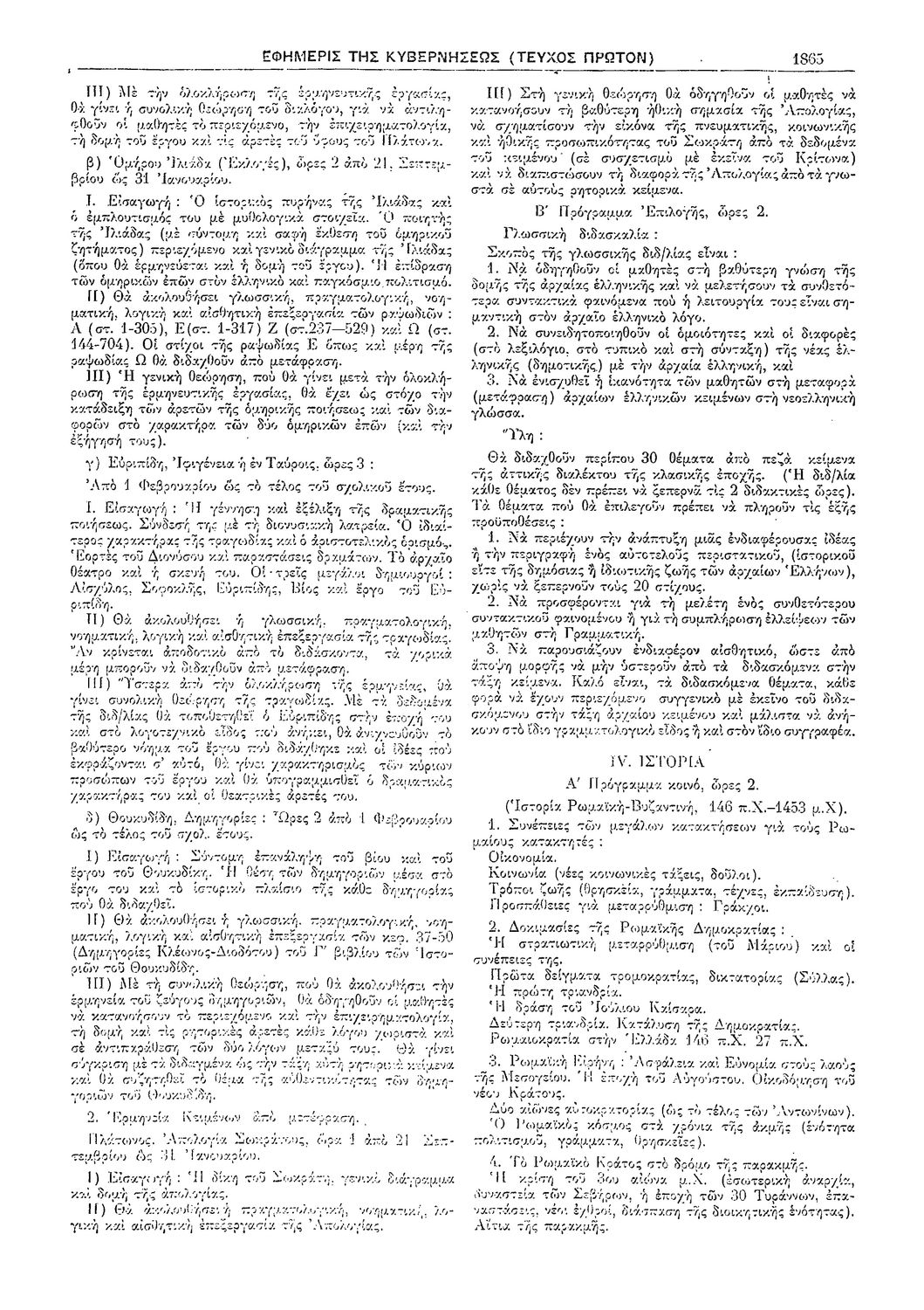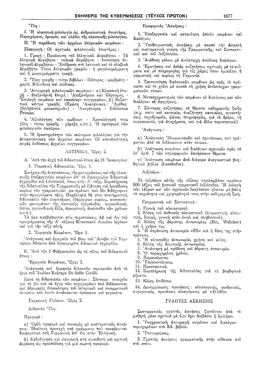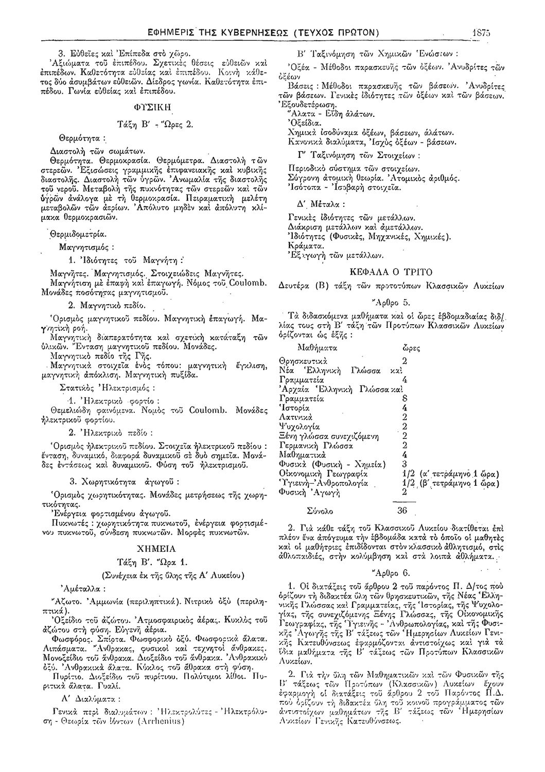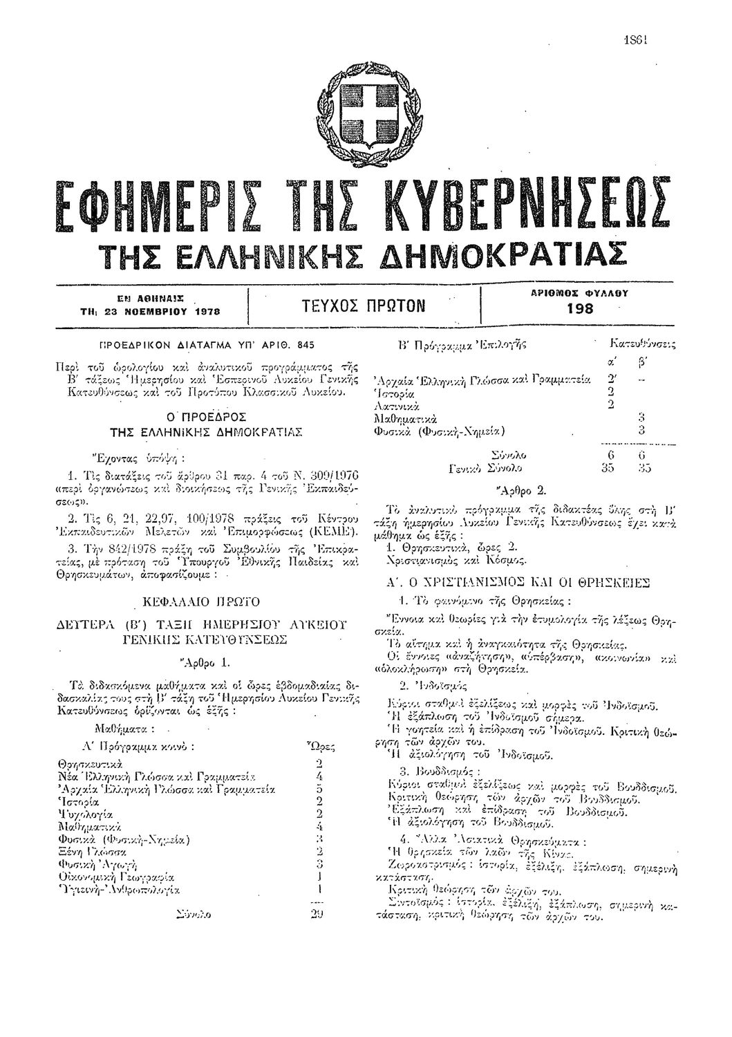 Π.Δ. 845 Περί του ωρολογίου και αναλυτικού προγράμματος της Β' τάξεως Ημερησίου και Εσπερινού Λυκείου Γενικής Κατευθύνσεως και του προτύπου Κλασσικού Λυκείου