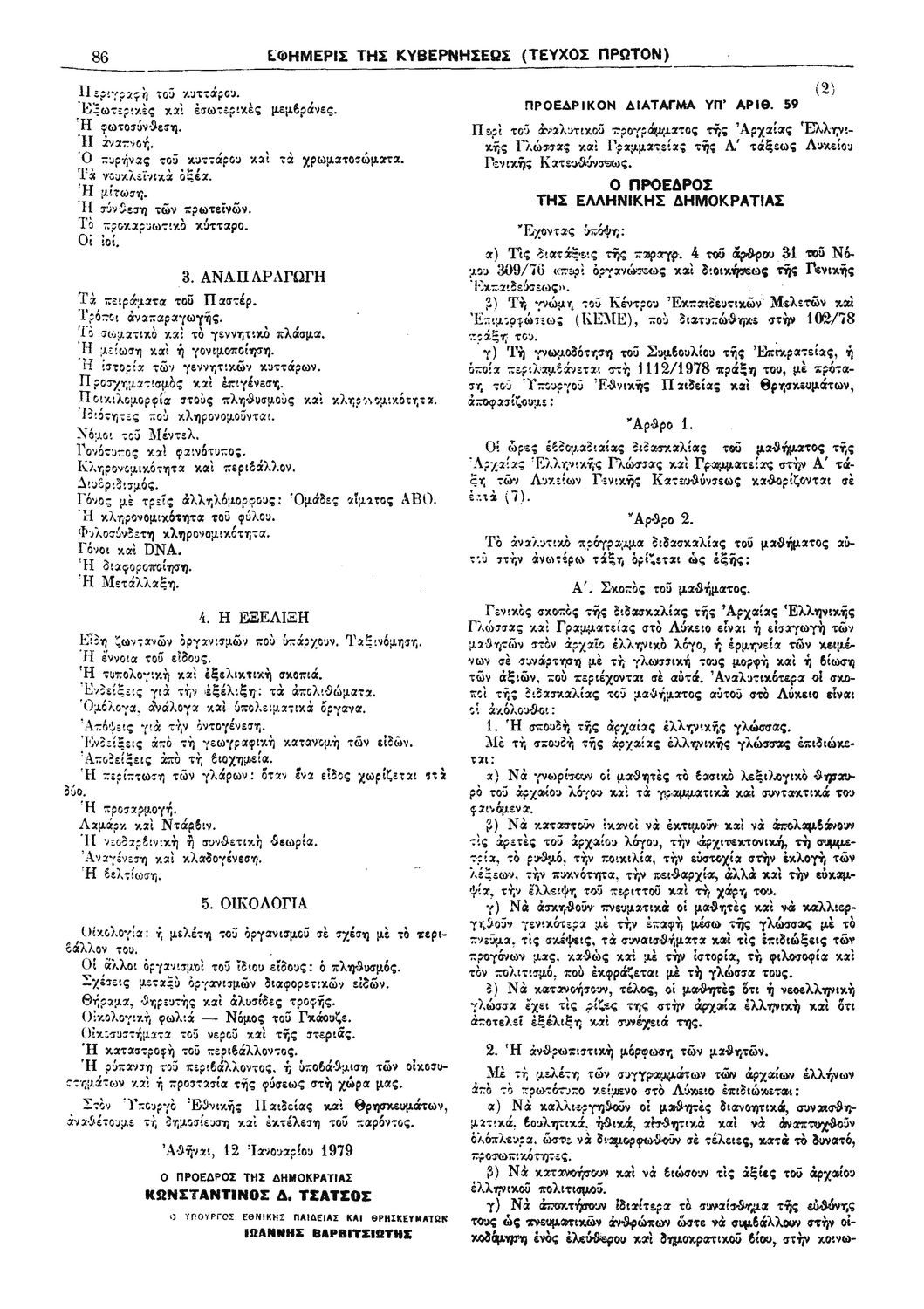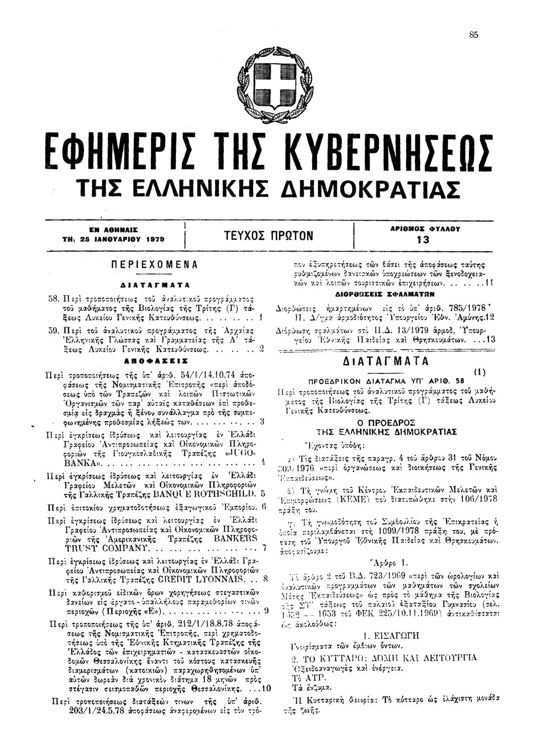 Π.Δ. 58 Περί τροποποιήσεως του αναλυτικού προγράμματος του μαθήματος της Βιολογίας της Τρίτης (Γ') τάξεως Λυκείου Γενικής Κατευθύνσεως.
