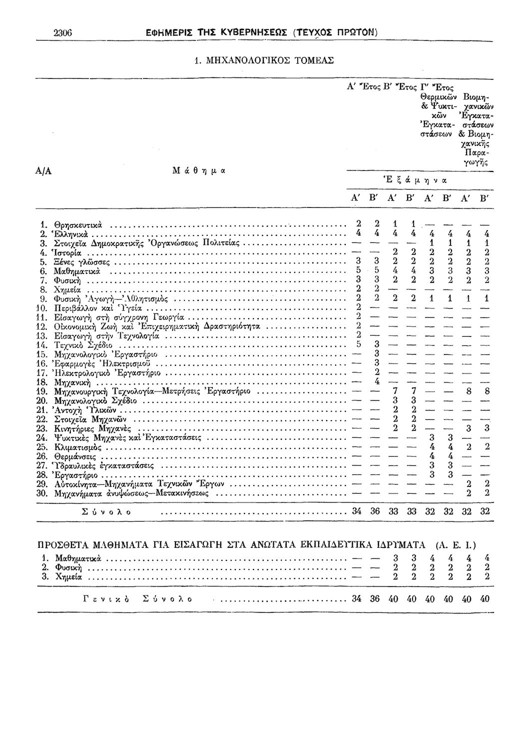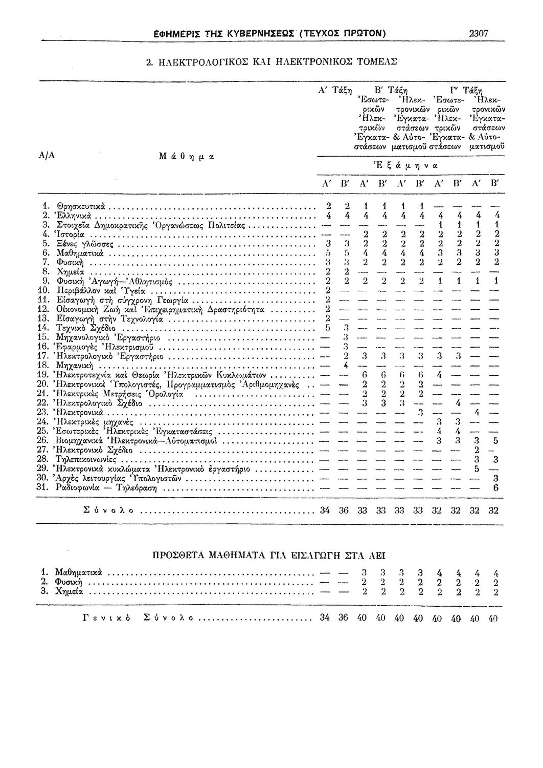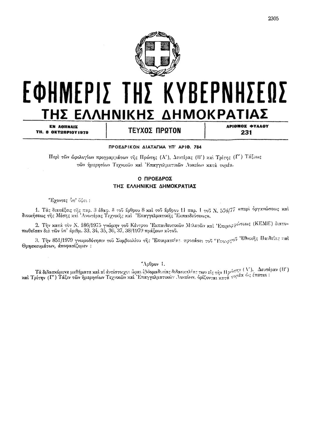 Π.Δ. 784 Περί ωρολογίων Προγραμμάτων της Πρώτης (Α'), Δευτέρας (Β'), και Τρίτης (Γ') τάξεως των ημερησίων Τεχνικών και Επαγγελματικών Λυκείων κατά τομέα