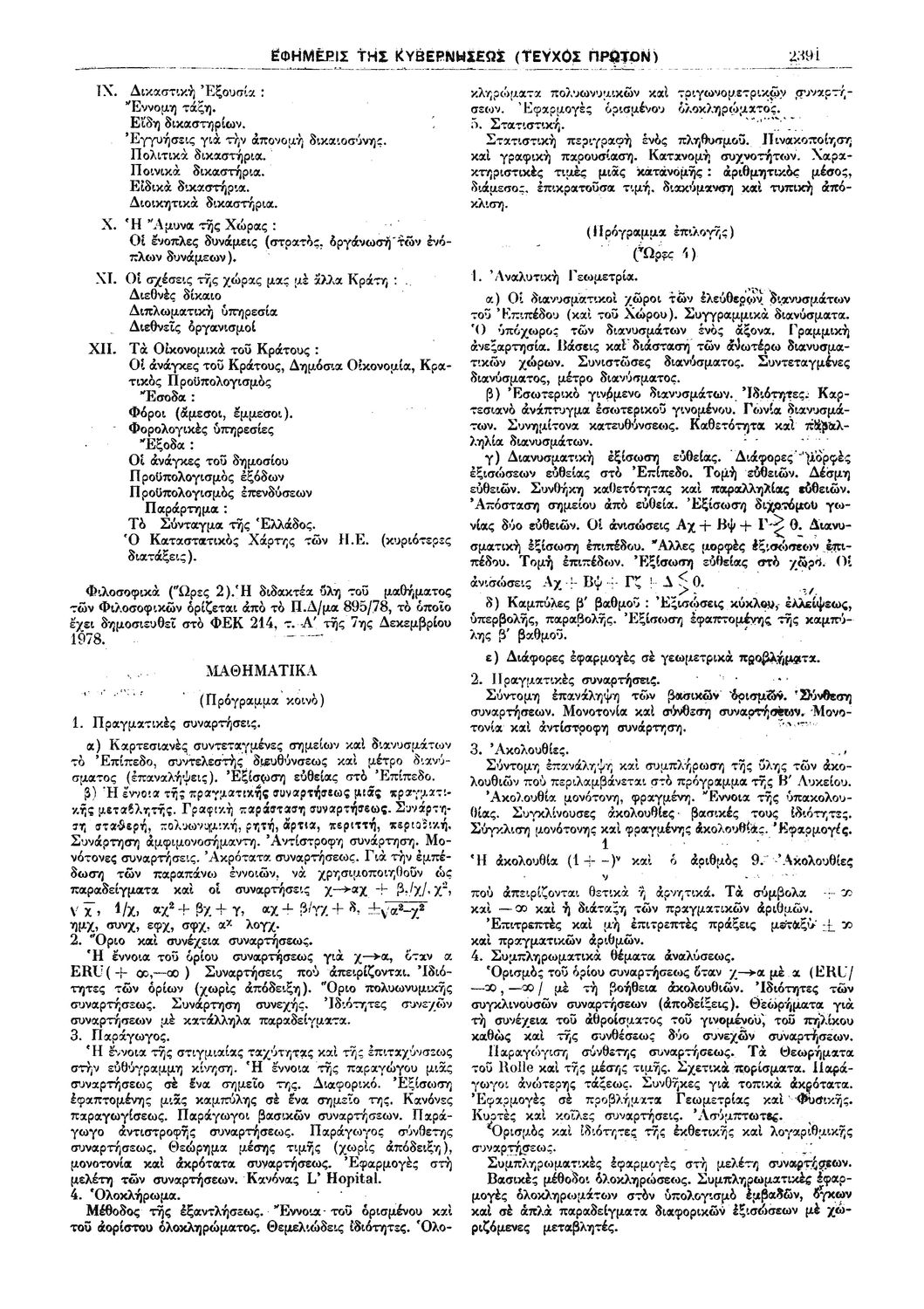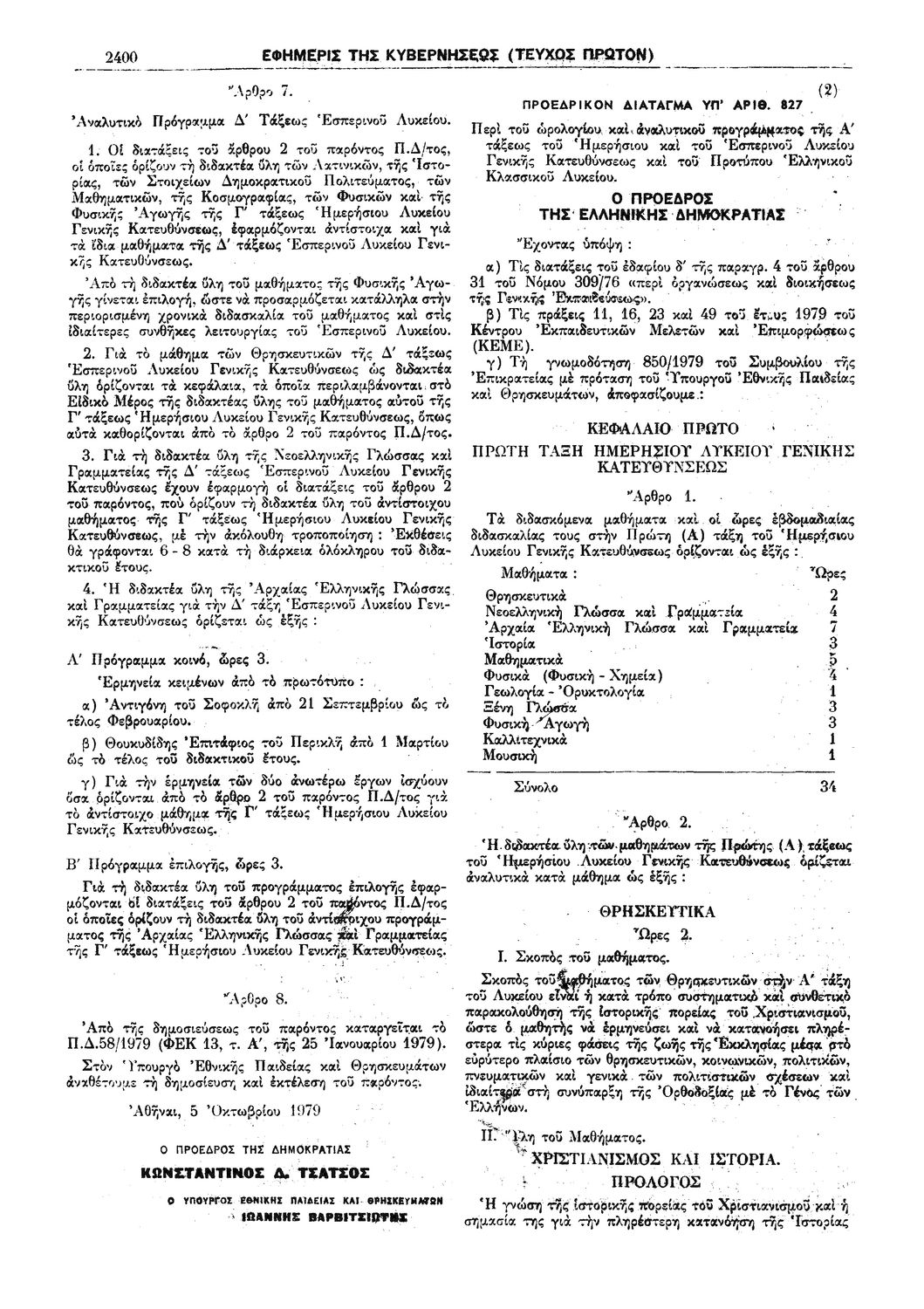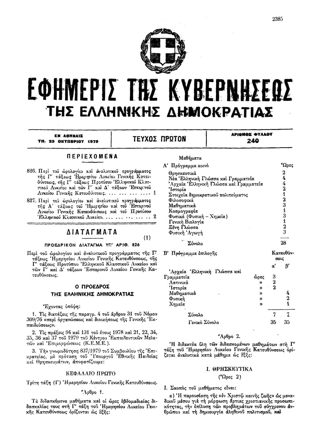 Π.Δ. 826 Περί του ωρολογίου και αναλυτικού προγράμματος της Γ' τάξεως Ημερησίου Λυκείου Γενικής Κατευθύνσεως, της Γ' τάξεως Προτύποι Ελληνικού Κλασσικού Λυκείου και των Γ' και Δ' τάξεων Εσπερινού Λυκείου Γενικής Κατευθύνσεως