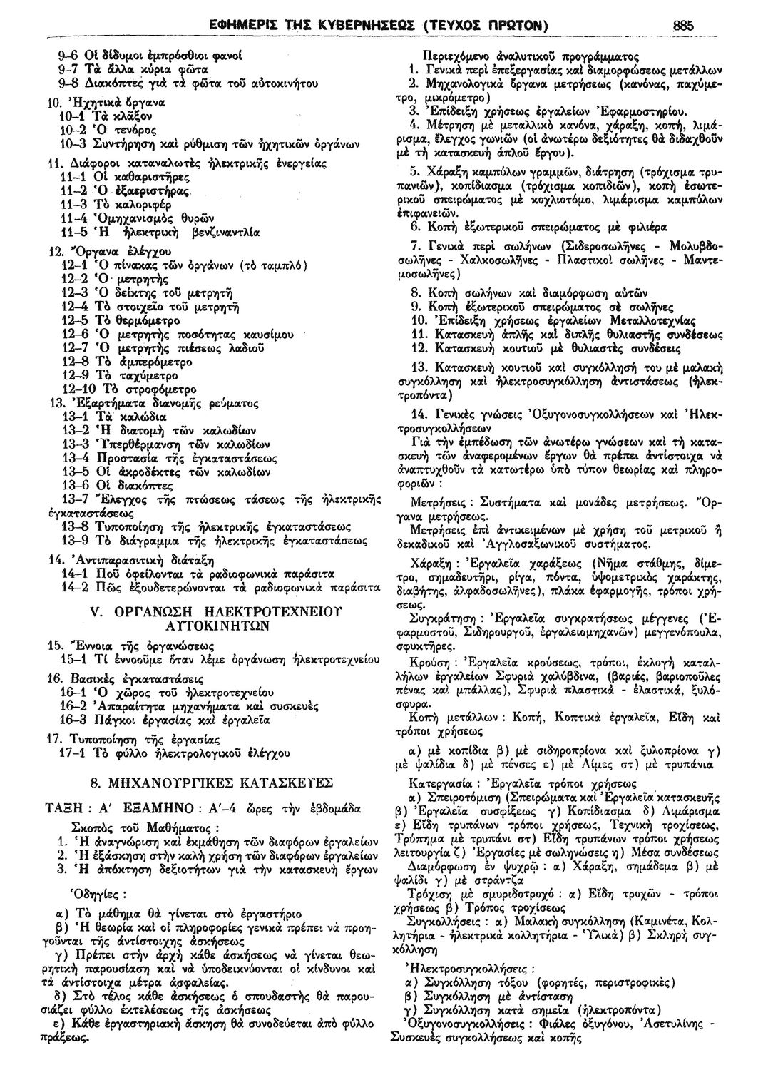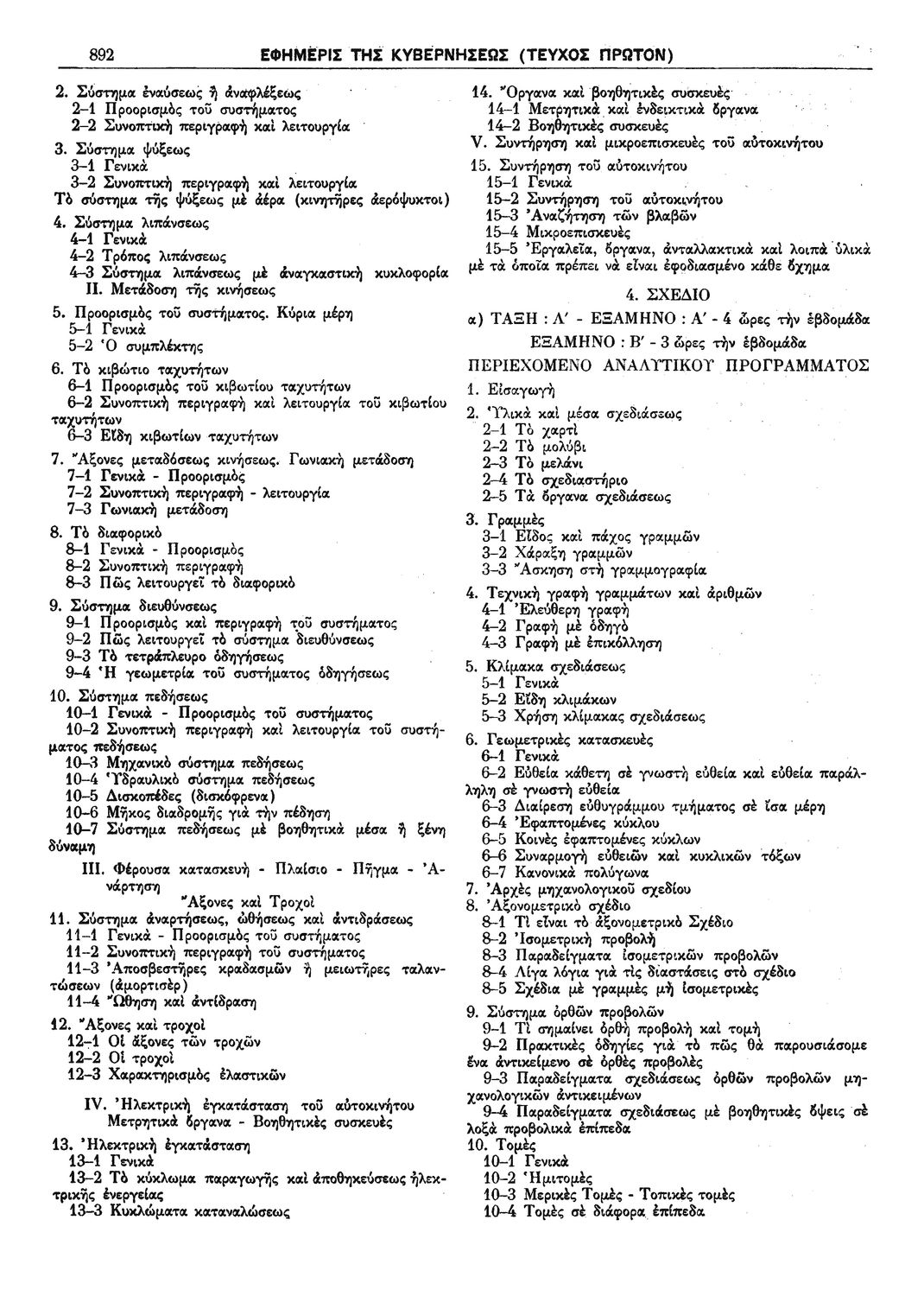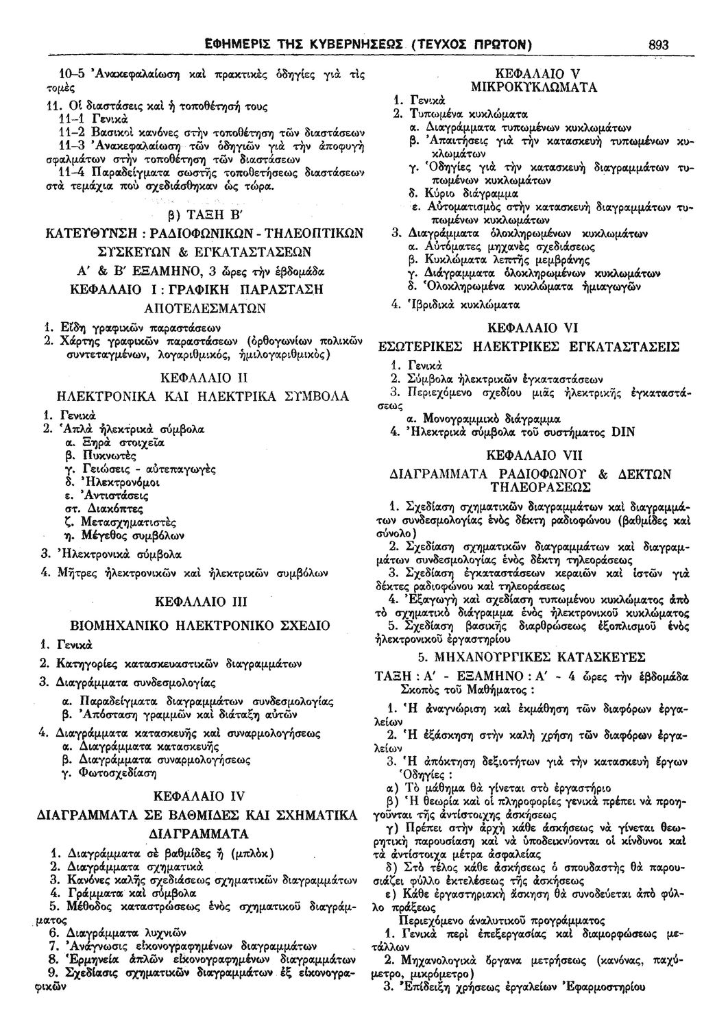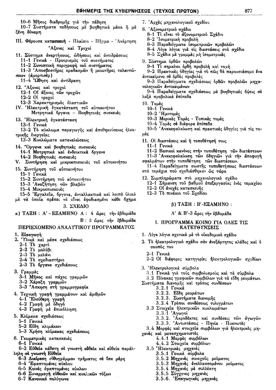 Π.Δ. 293 Περί των Ωρολογίων και Αναλυτικών Προγραμμάτων της Πρώτης (Α') και Δευτέρας (Β') τάξεως των Ημερησίων Μέσων Τεχνικών Σχολών κατά τμήμα