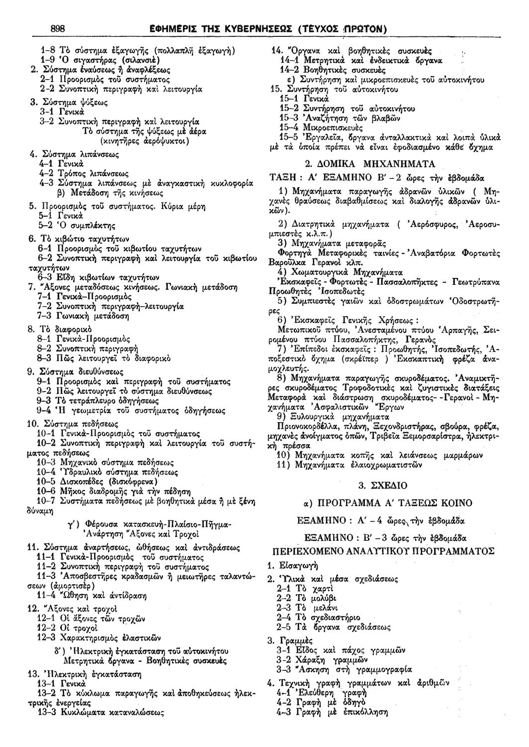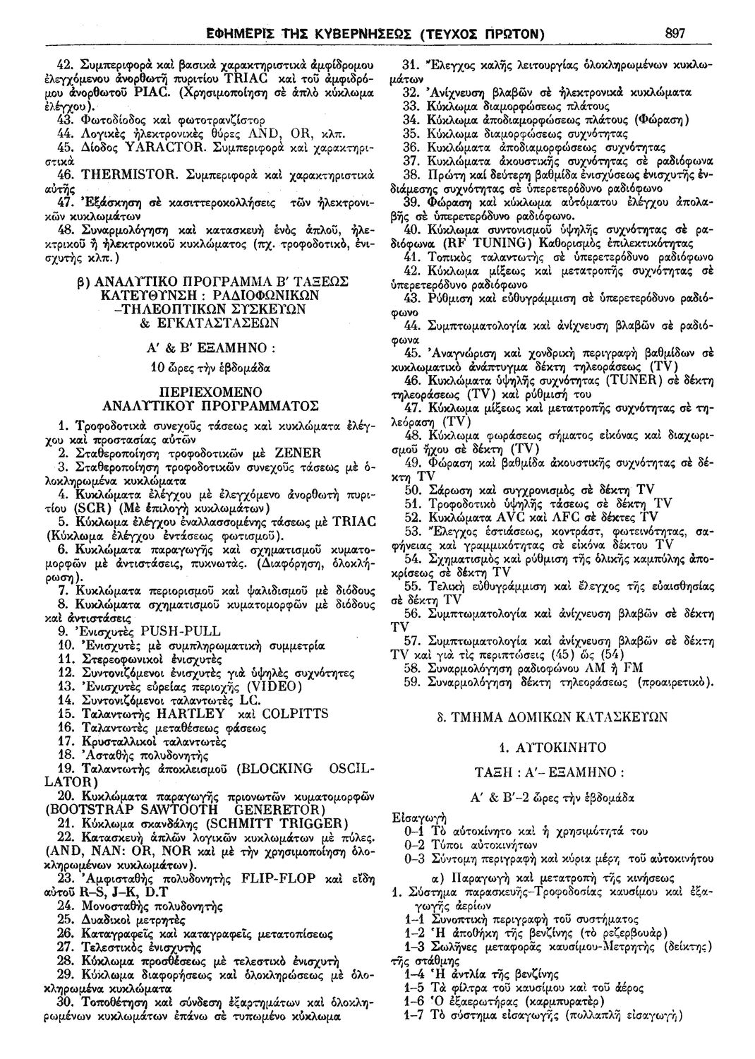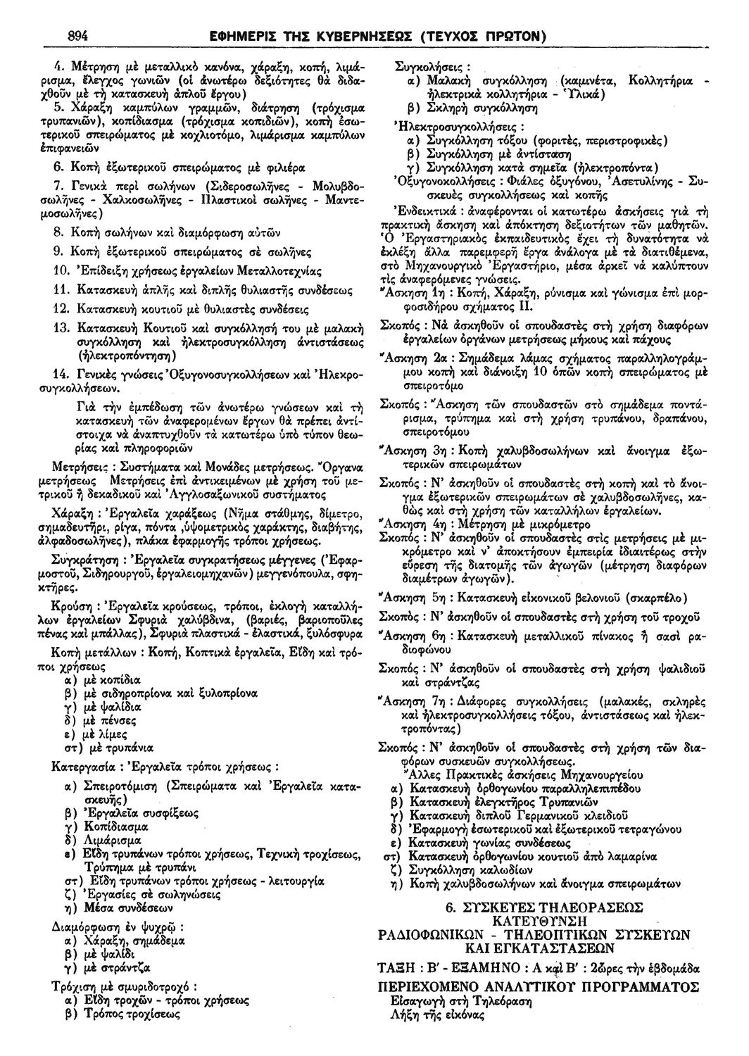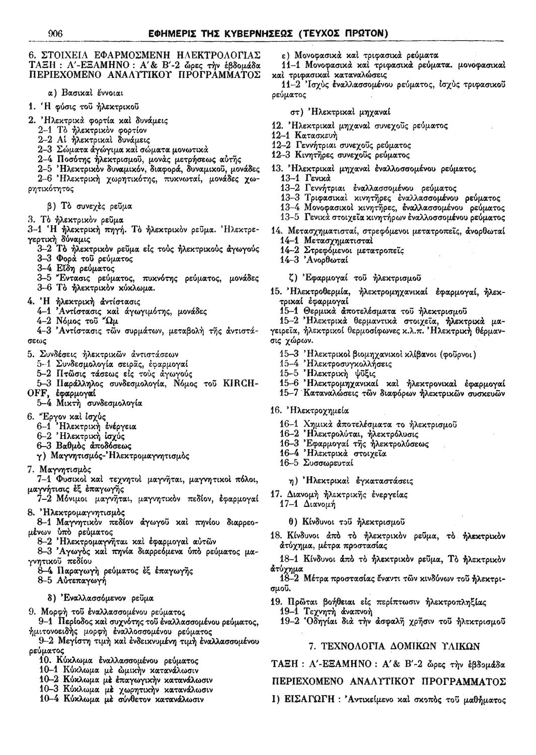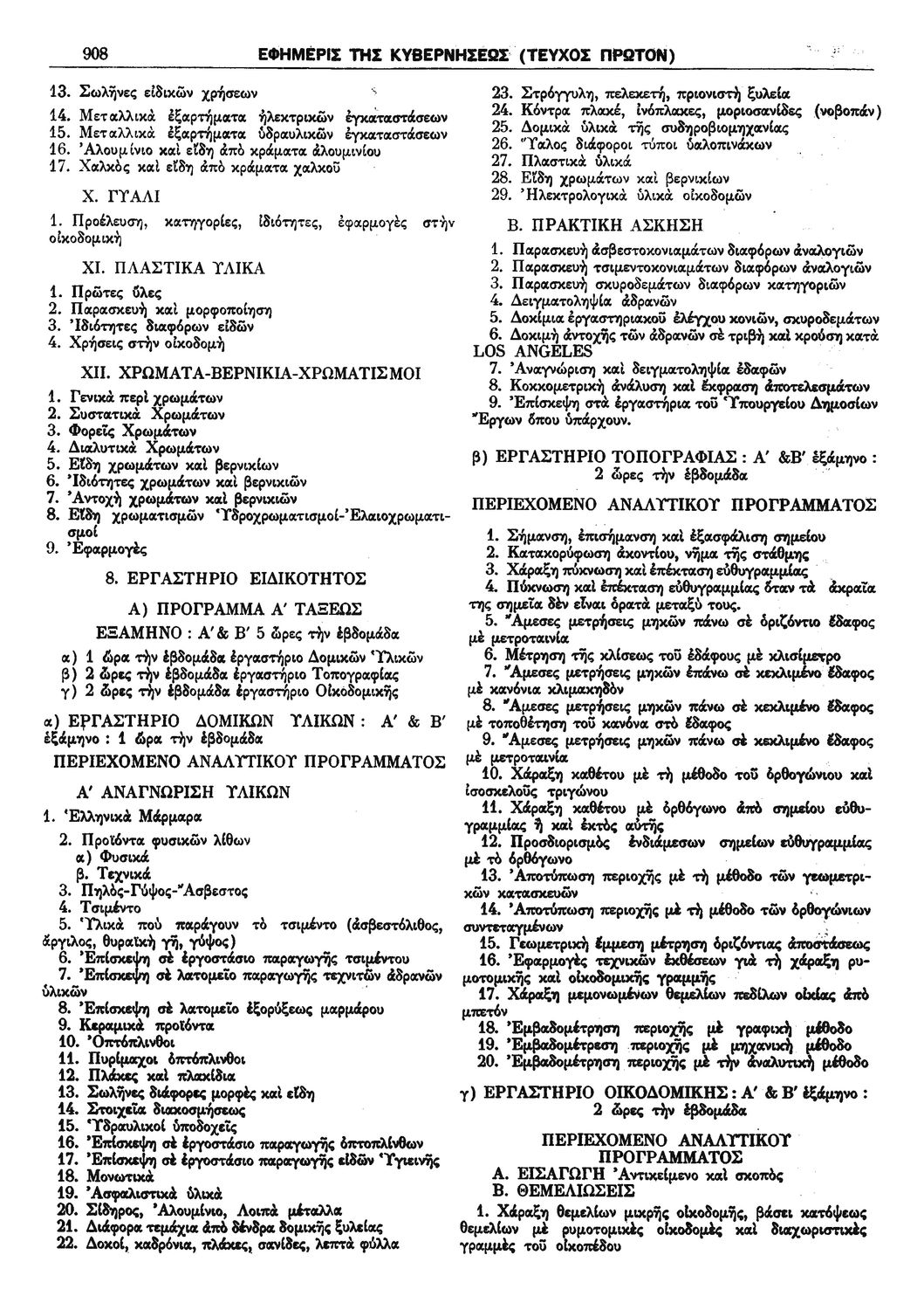 Π.Δ. 293 Περί των Ωρολογίων και Αναλυτικών Προγραμμάτων της Πρώτης (Α') και Δευτέρας (Β') τάξεως των Ημερησίων Μέσων Τεχνικών Σχολών κατά τμήμα