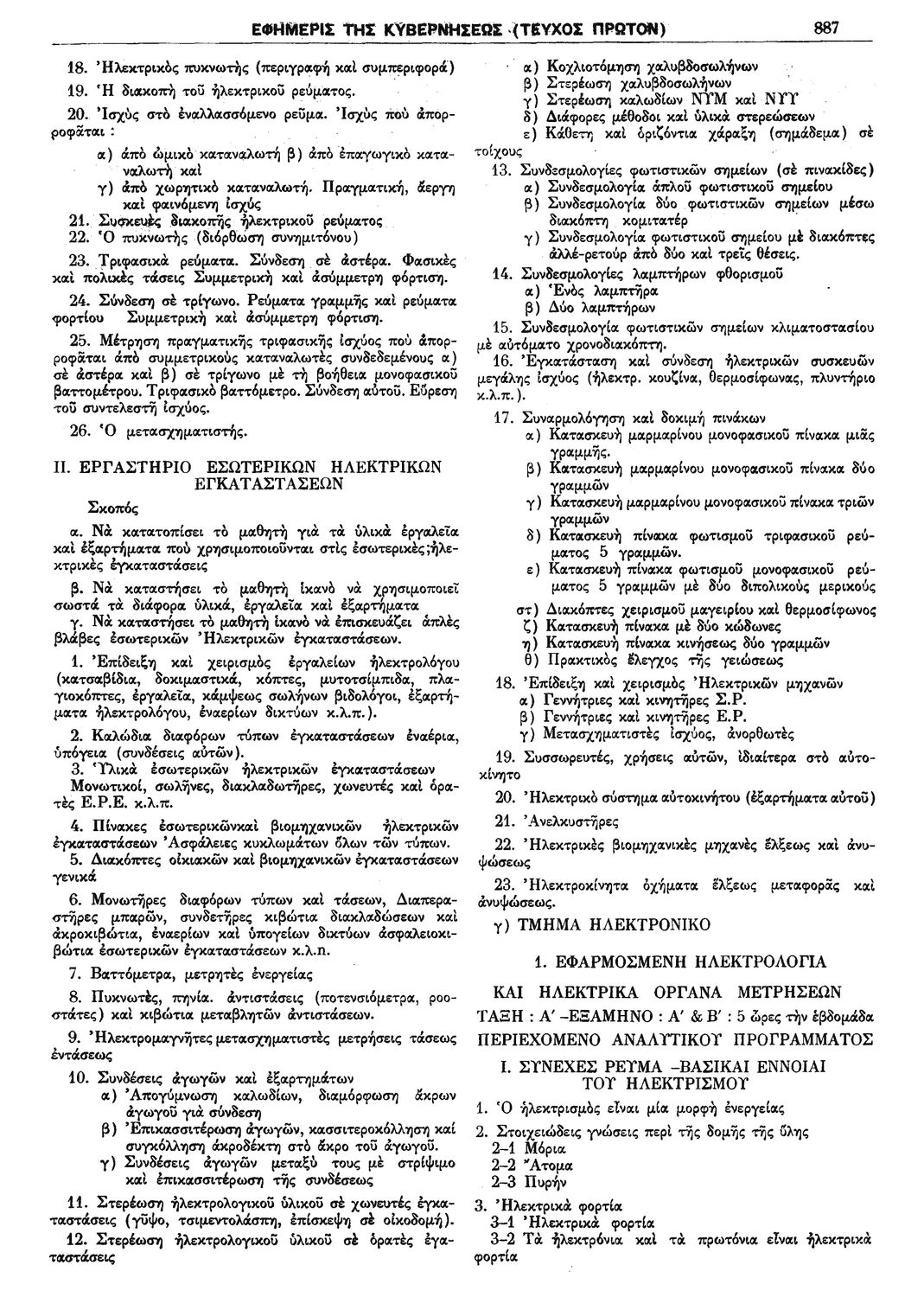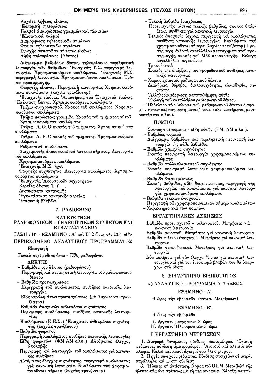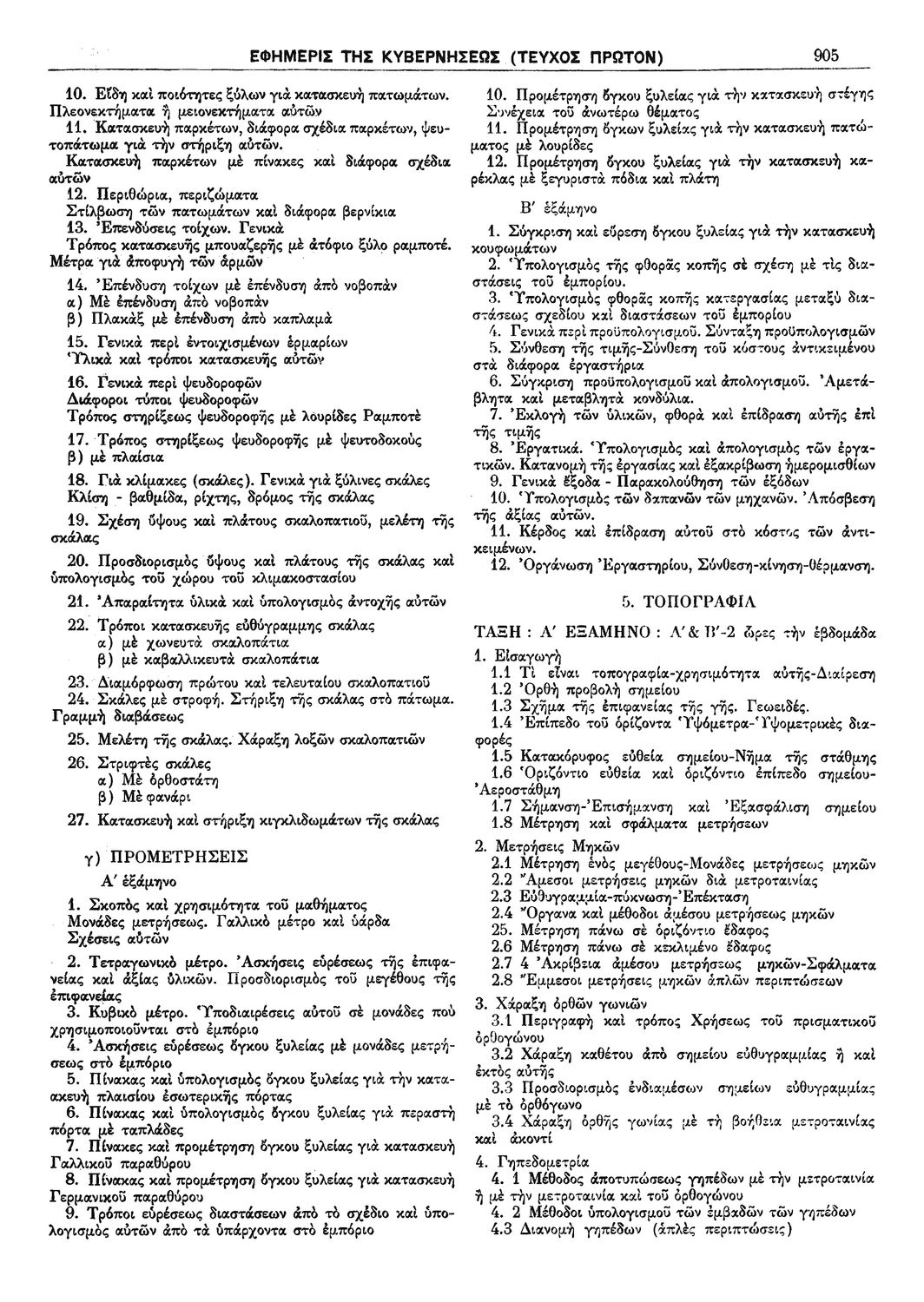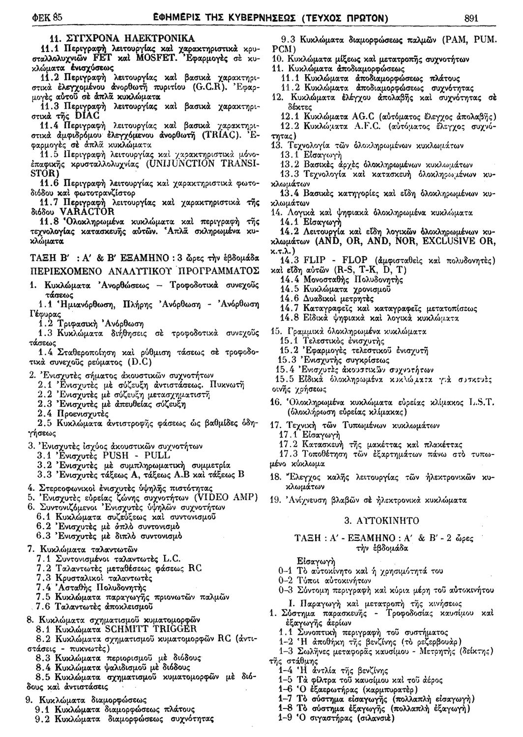 Π.Δ. 293 Περί των Ωρολογίων και Αναλυτικών Προγραμμάτων της Πρώτης (Α') και Δευτέρας (Β') τάξεως των Ημερησίων Μέσων Τεχνικών Σχολών κατά τμήμα