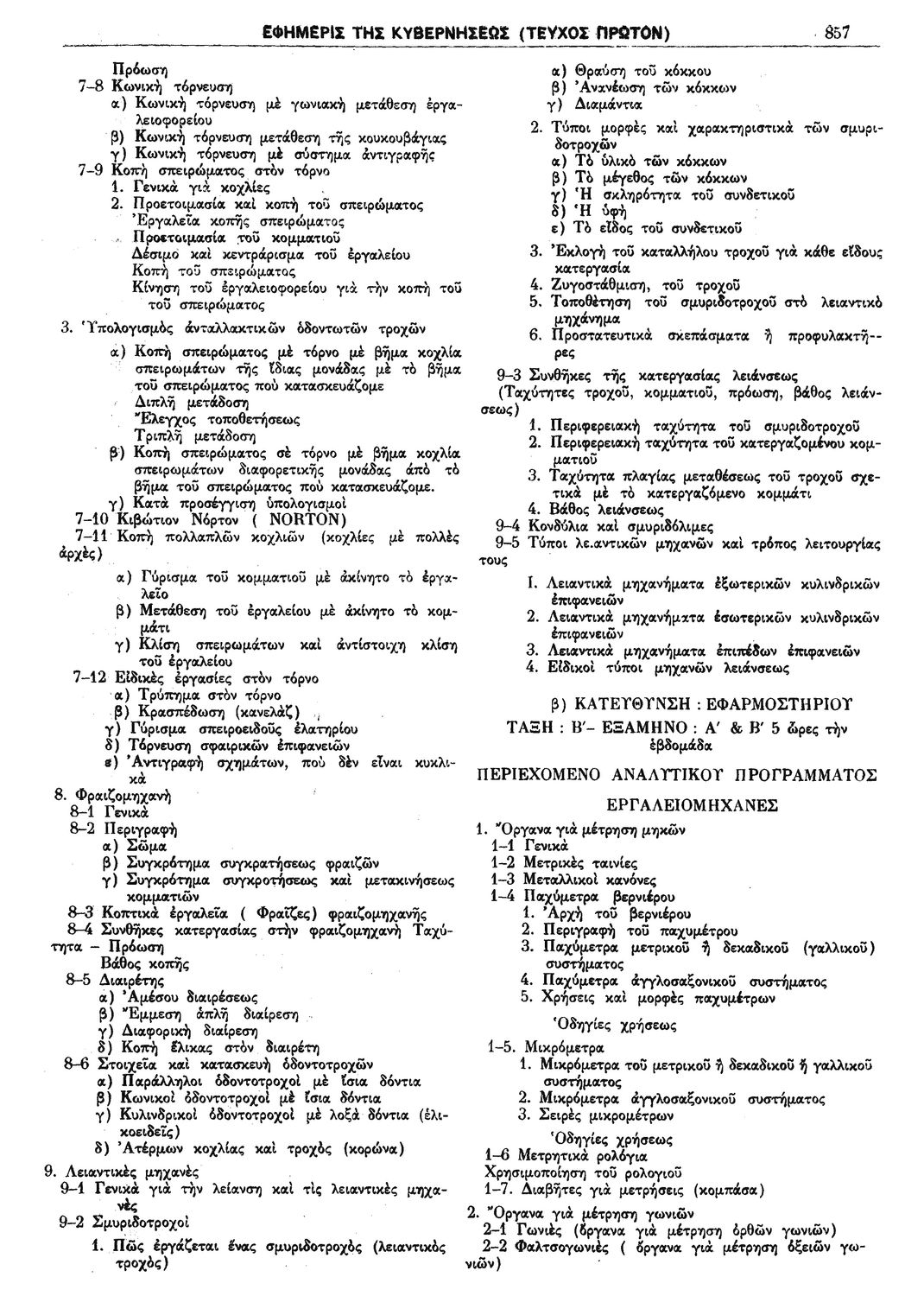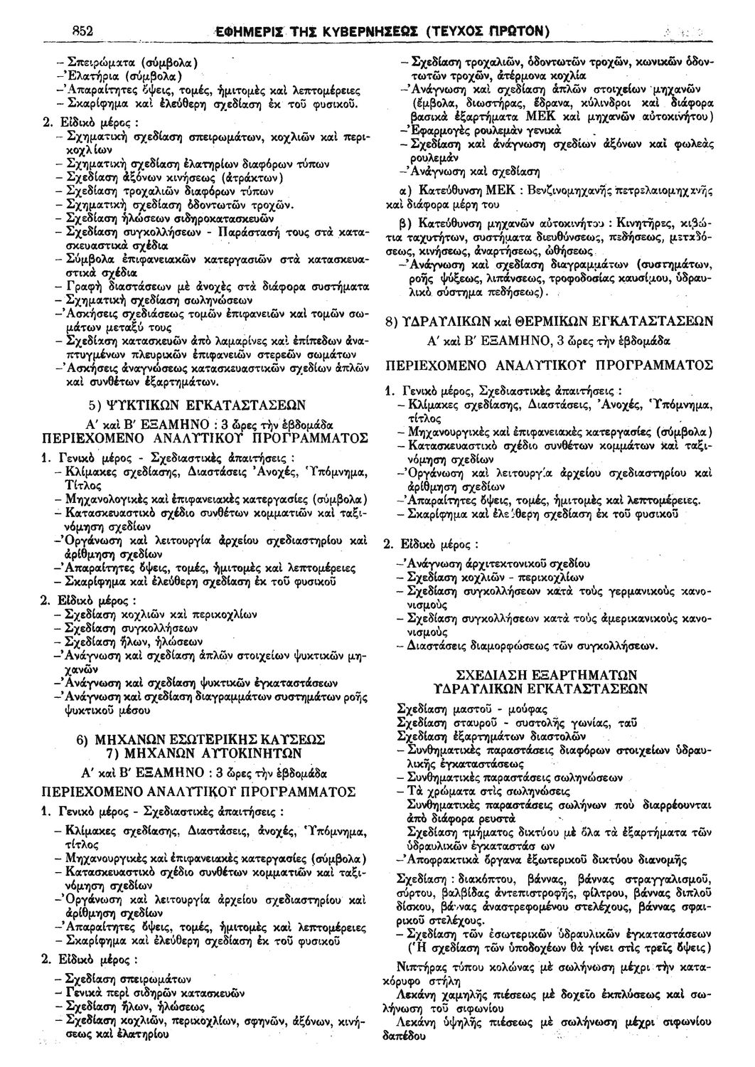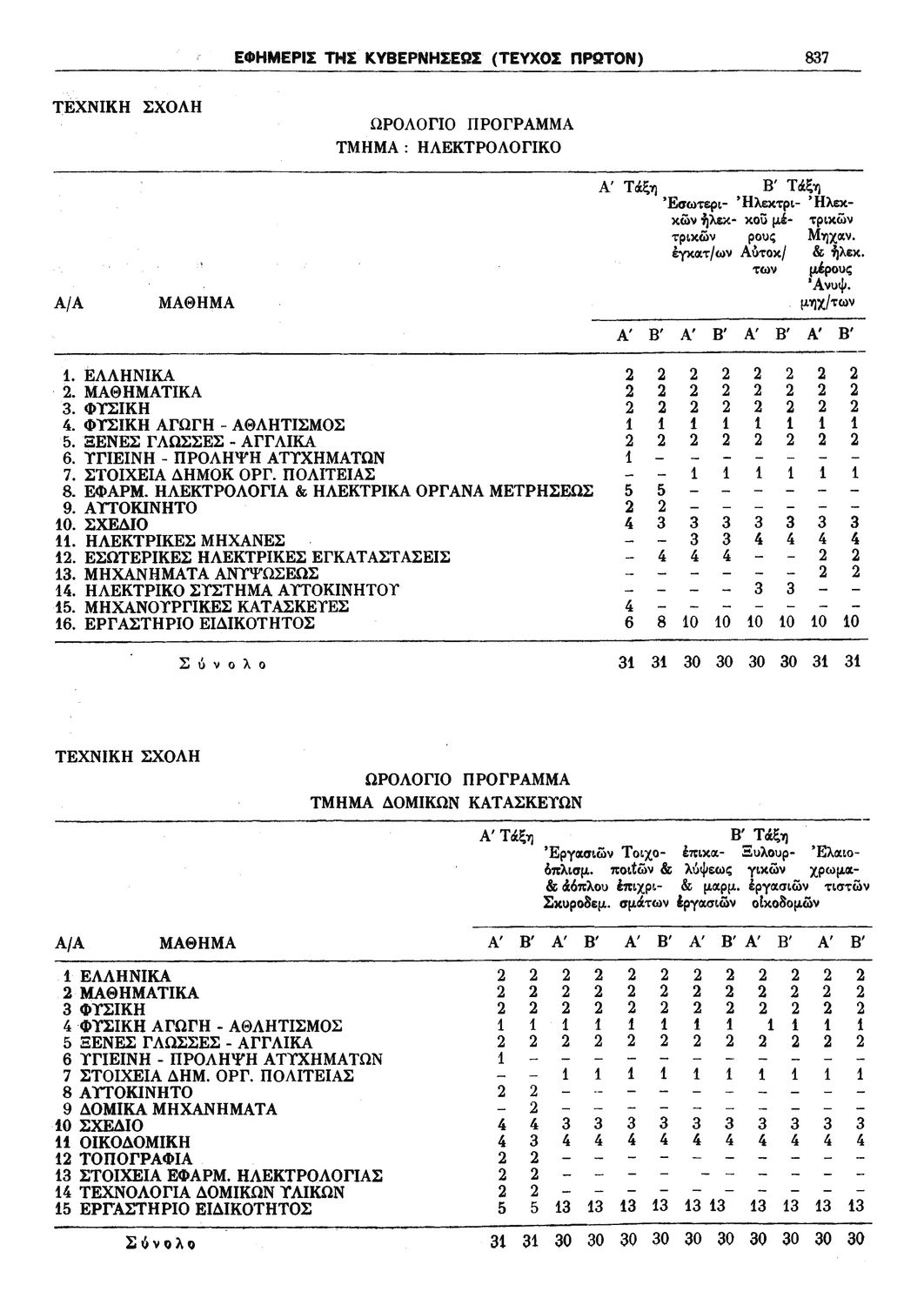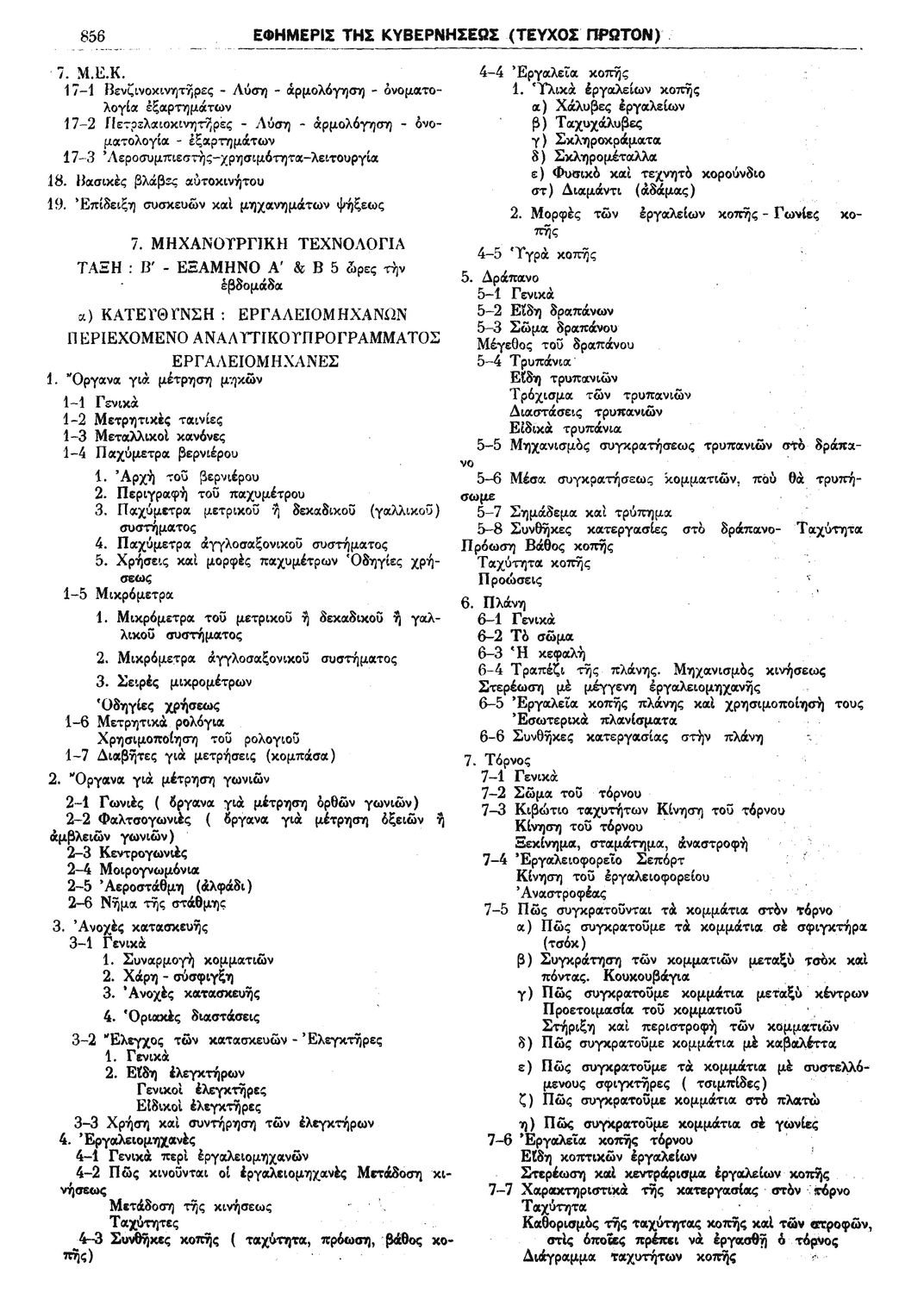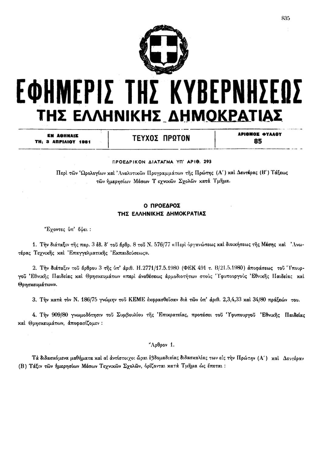 Π.Δ. 293 Περί των Ωρολογίων και Αναλυτικών Προγραμμάτων της Πρώτης (Α') και Δευτέρας (Β') τάξεως των Ημερησίων Μέσων Τεχνικών Σχολών κατά τμήμα