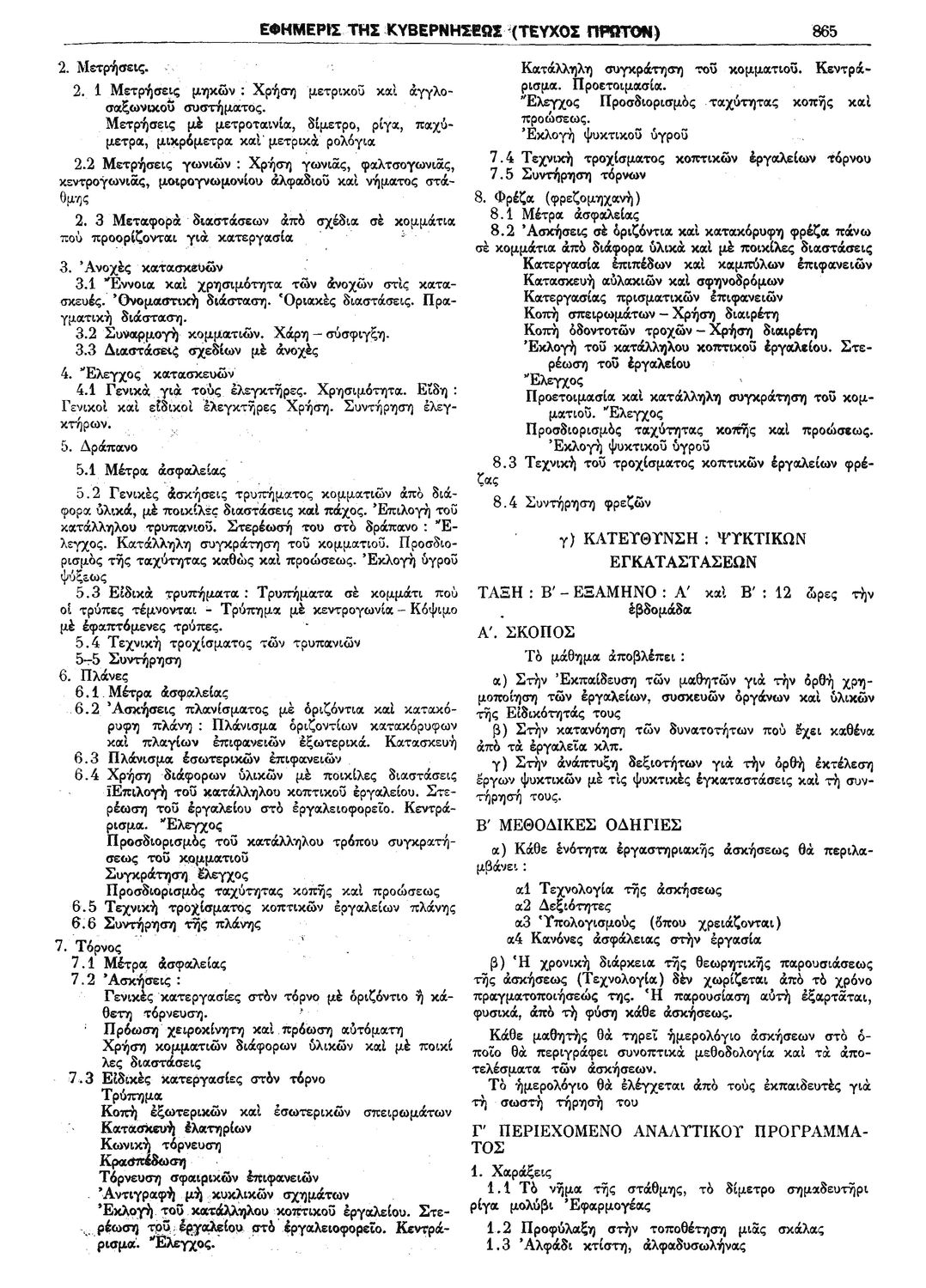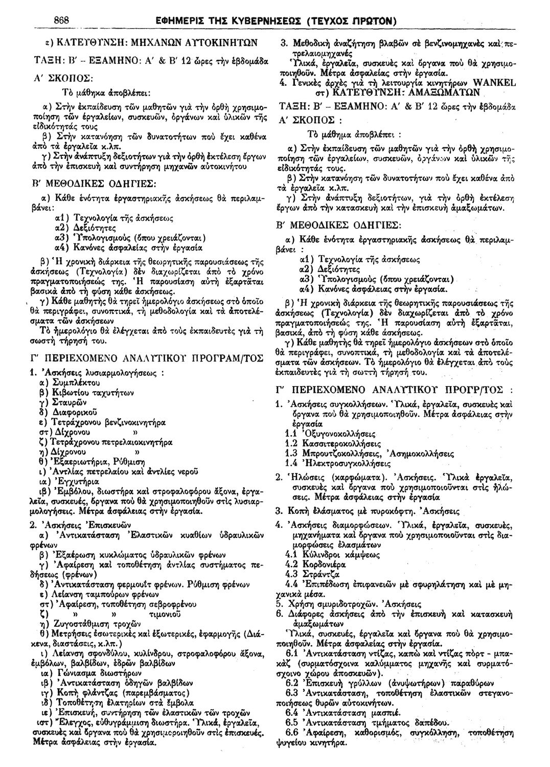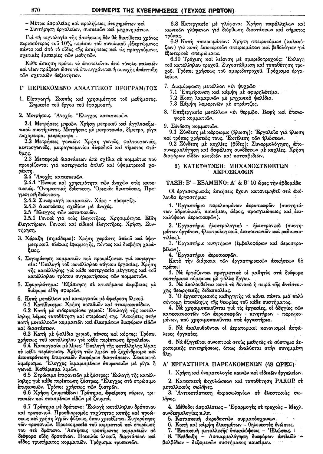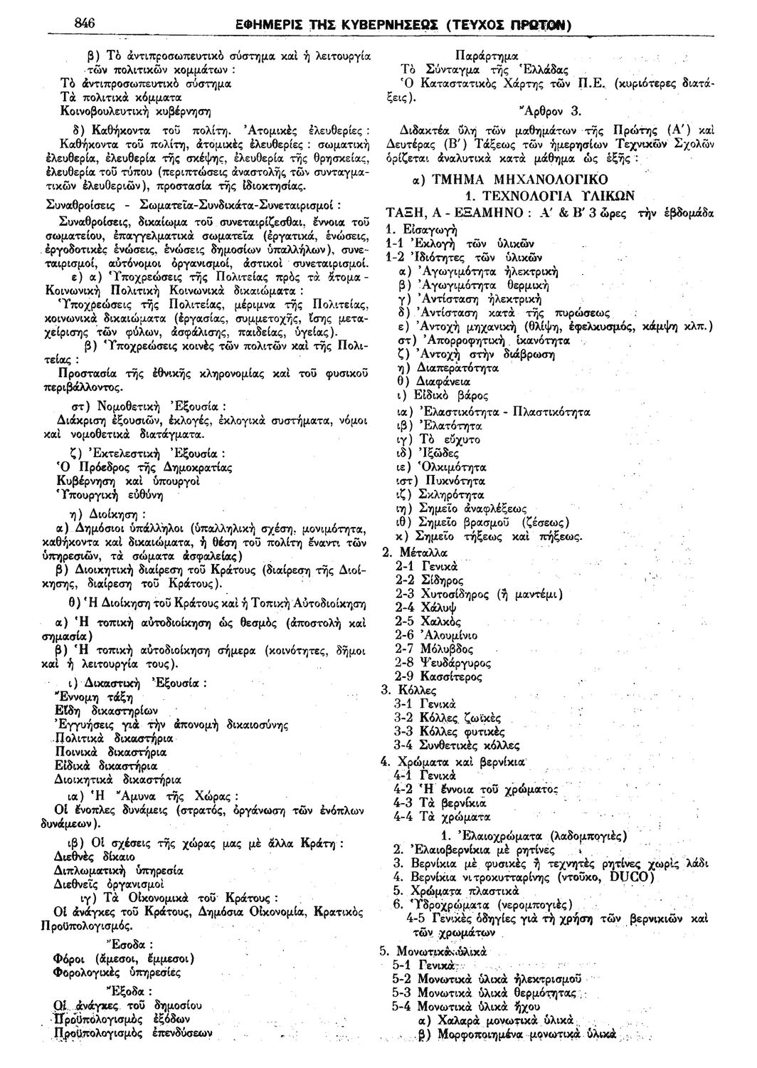 Π.Δ. 293 Περί των Ωρολογίων και Αναλυτικών Προγραμμάτων της Πρώτης (Α') και Δευτέρας (Β') τάξεως των Ημερησίων Μέσων Τεχνικών Σχολών κατά τμήμα