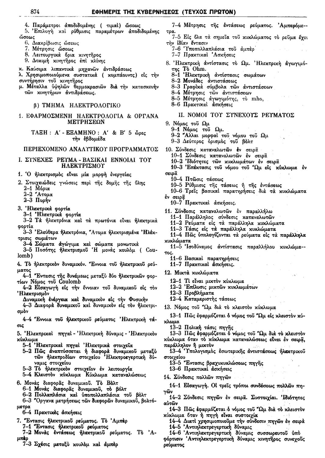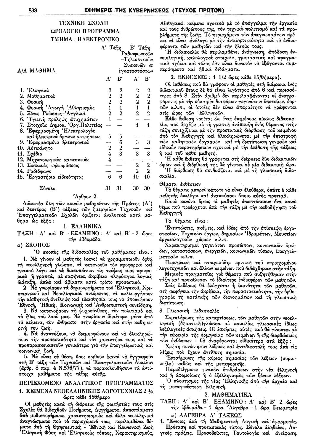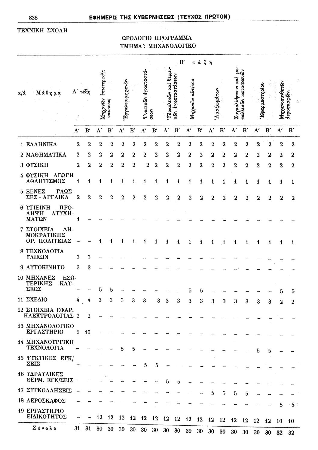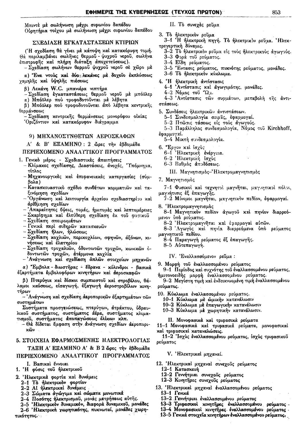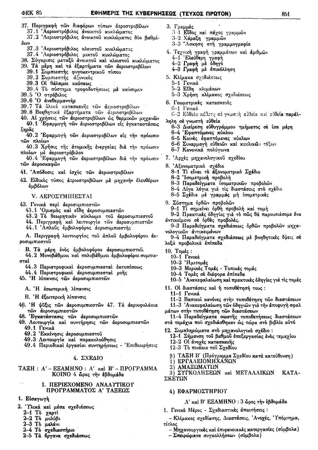 Π.Δ. 293 Περί των Ωρολογίων και Αναλυτικών Προγραμμάτων της Πρώτης (Α') και Δευτέρας (Β') τάξεως των Ημερησίων Μέσων Τεχνικών Σχολών κατά τμήμα